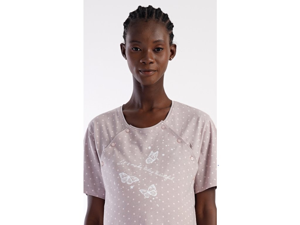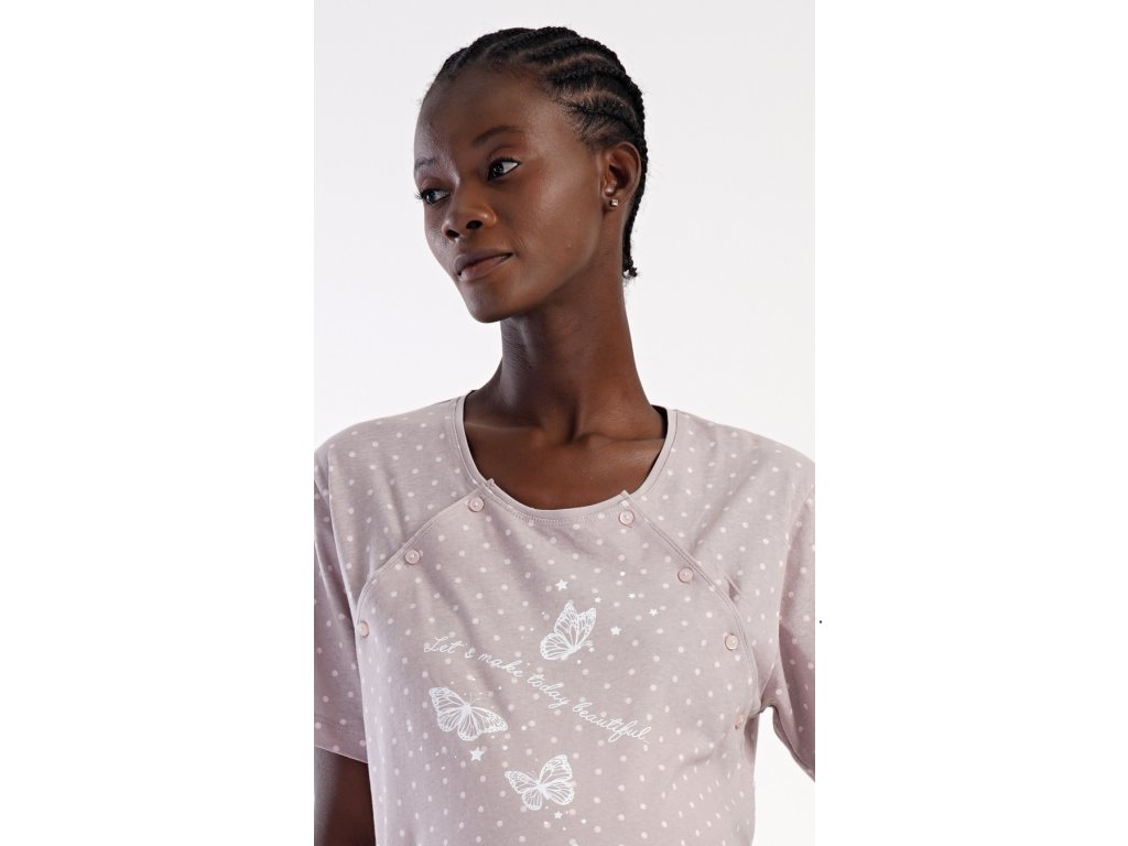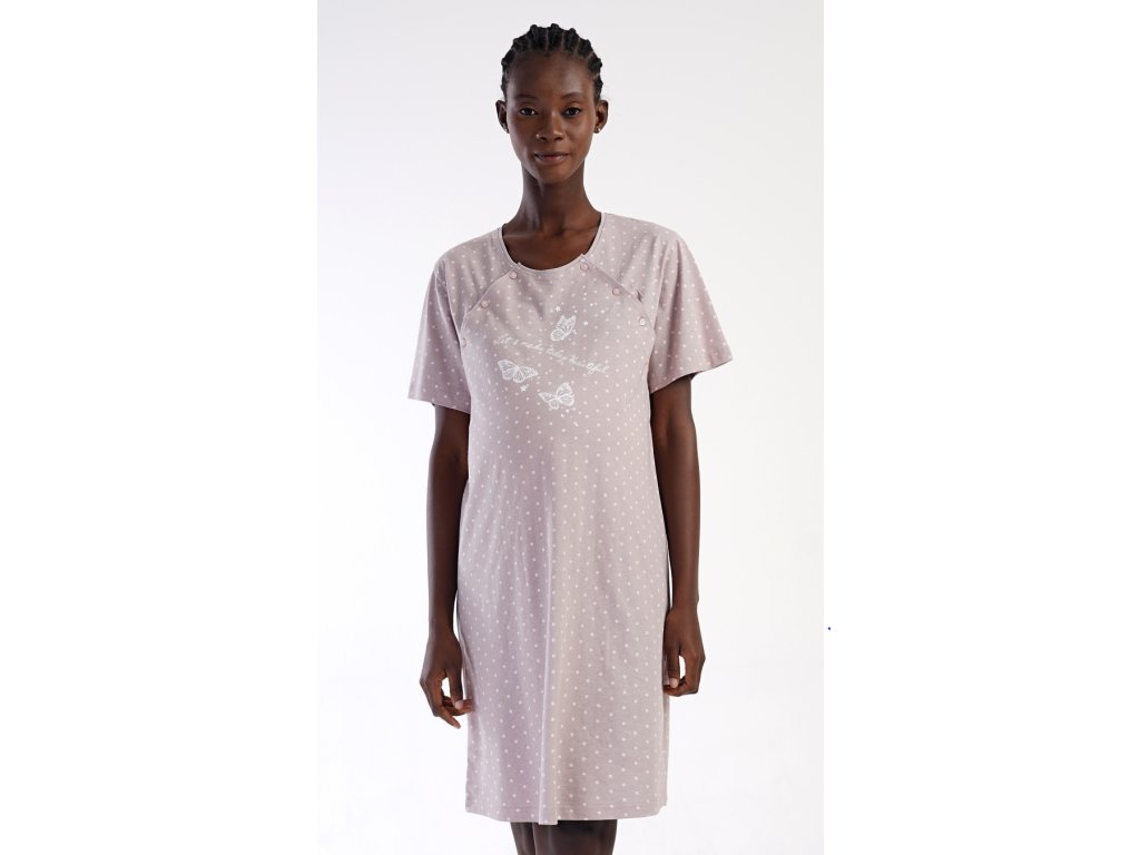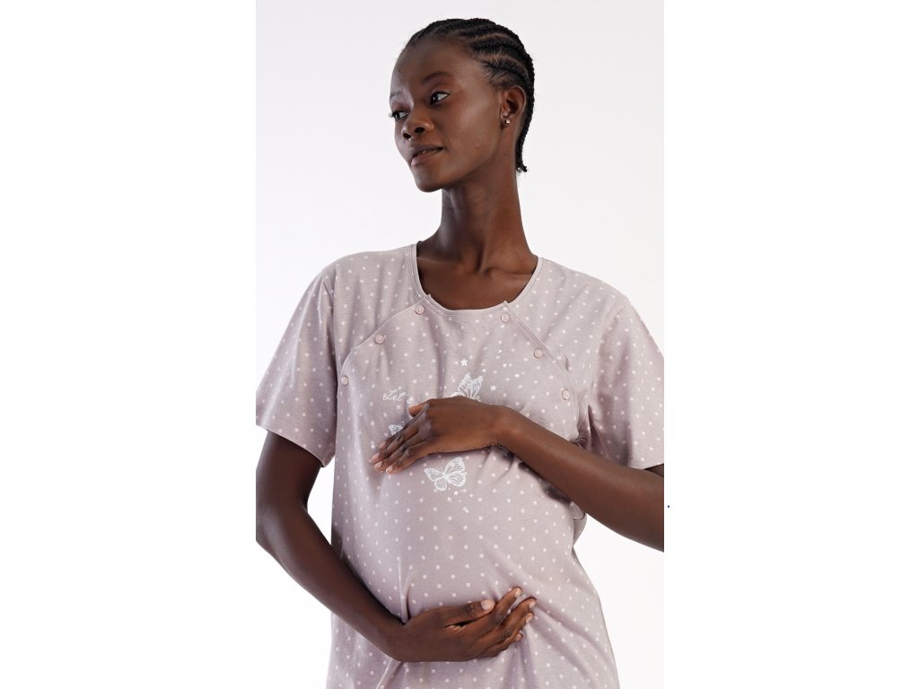 Dámska bavlnená materská nočná košeľa Sabina. Nočná košeľa je svojim strihom určená na dobu tehotenstva, do pôrodnice aj na dojčenie. Na dojčenie slúžia prestrihy po stranách košele, ktoré sú uzatvárateľné na gombíky. Puntíkovaný podklad košele zdobí v prednej časti jemné motýle. Použitý materiál s podielom bavlny 100% je príjemný a poddajný na dotyk.