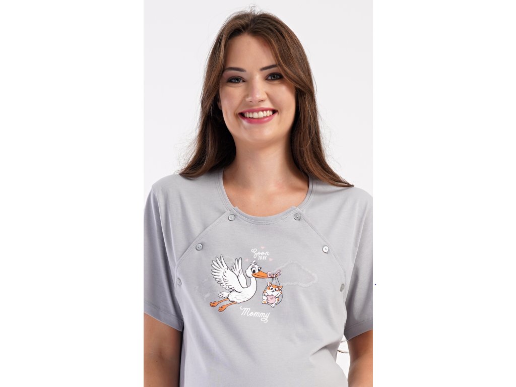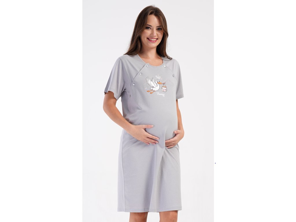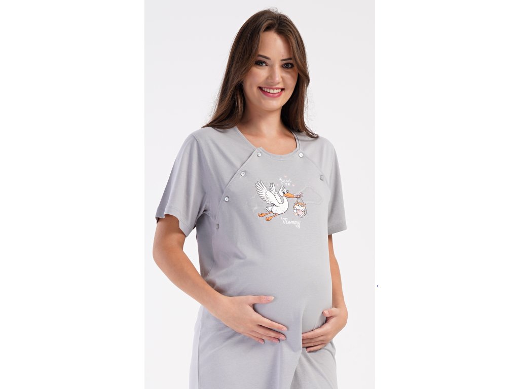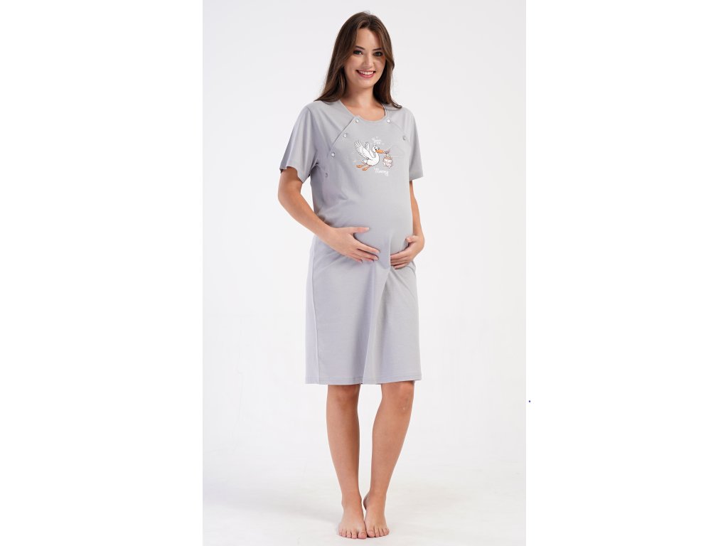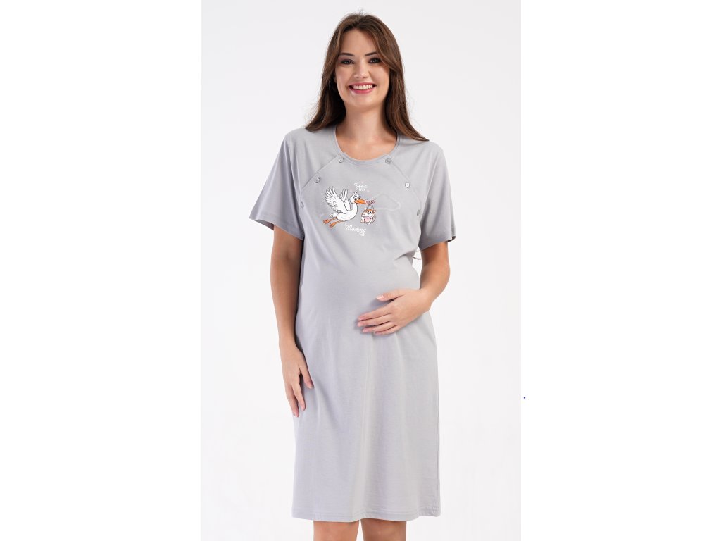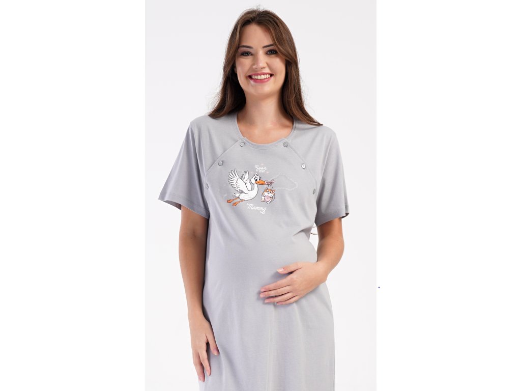 Dámska bavlnená materská nočná košeľa Bocian s bábätkom. Nočná košeľa je svojim strihom určená na dobu tehotenstva, do pôrodnice aj na dojčenie. Na dojčenie slúžia prestrihy po stranách košele, ktoré sú uzatvárateľné na gombíky. Jednofarebná košeľa je na hrudi ozdobená obrázkom bociana, ktorý nesie v zobáku mačiatko. Použitý materiál s podielom bavlny 100% je príjemný a poddajný na dotyk.