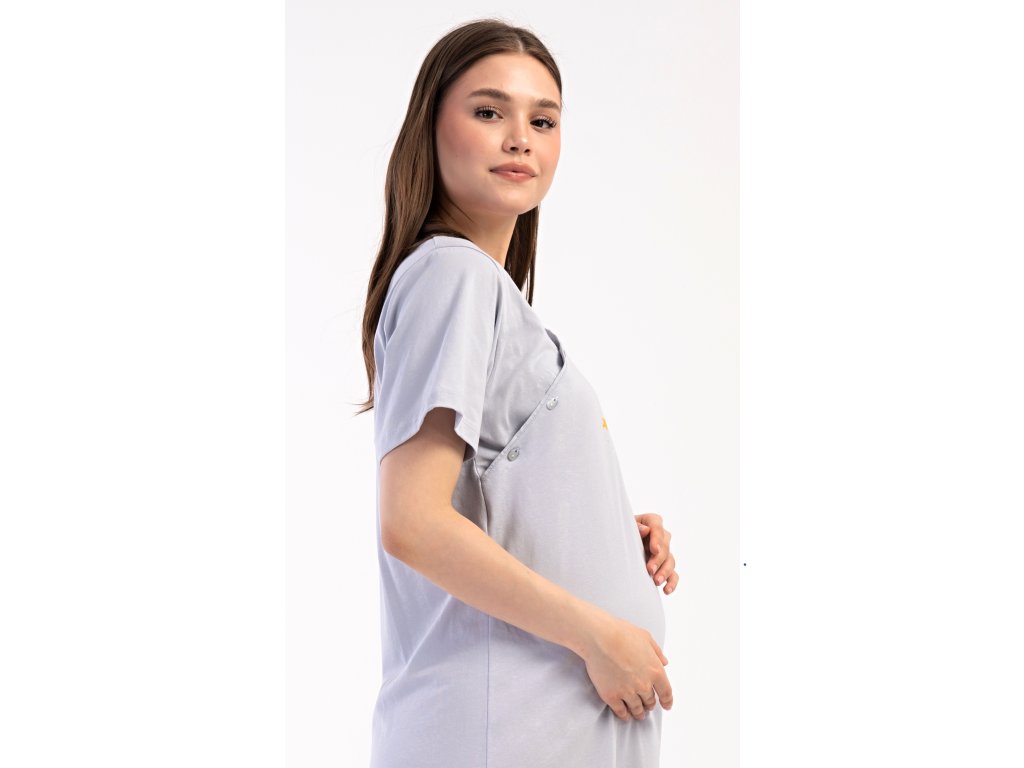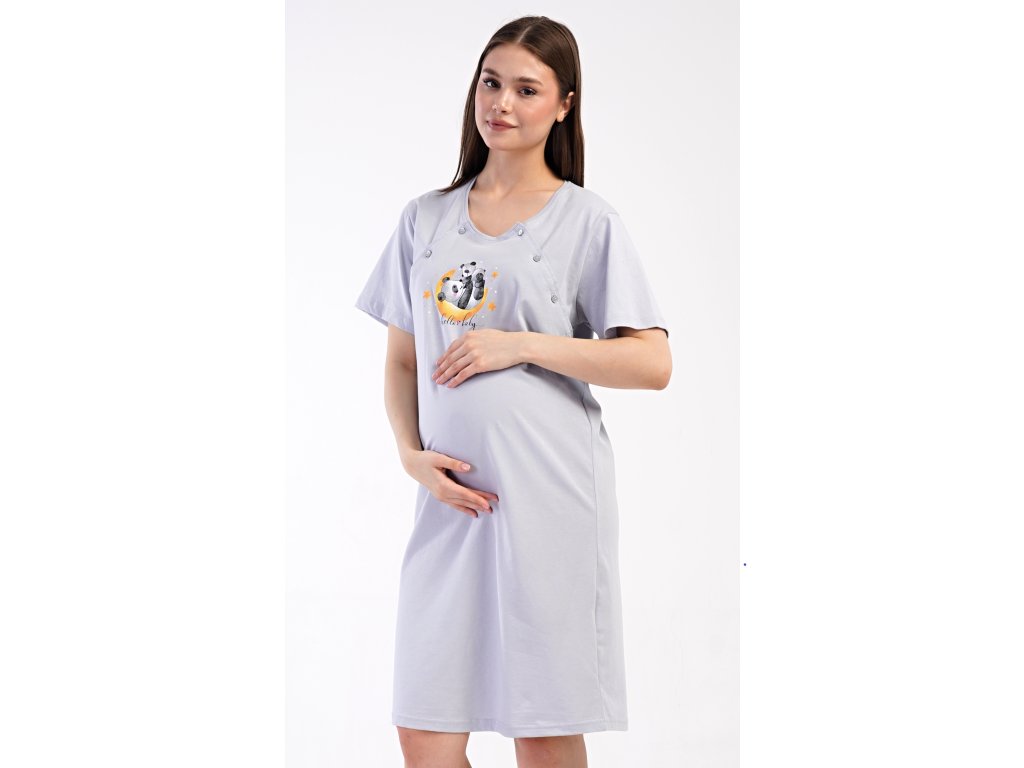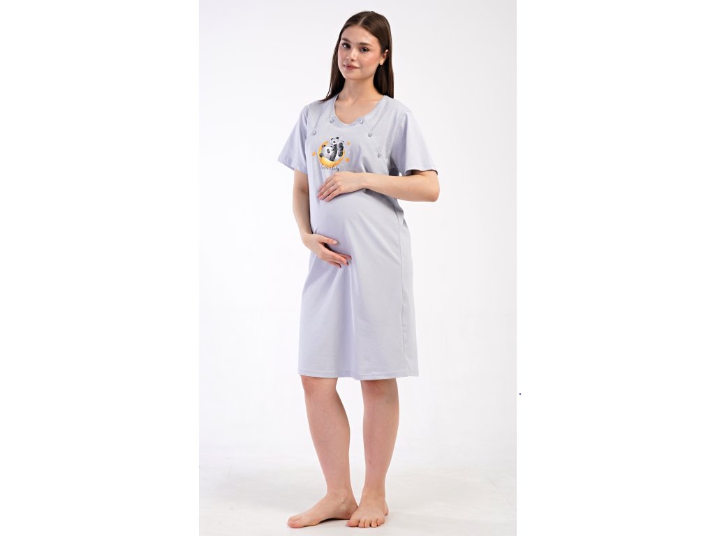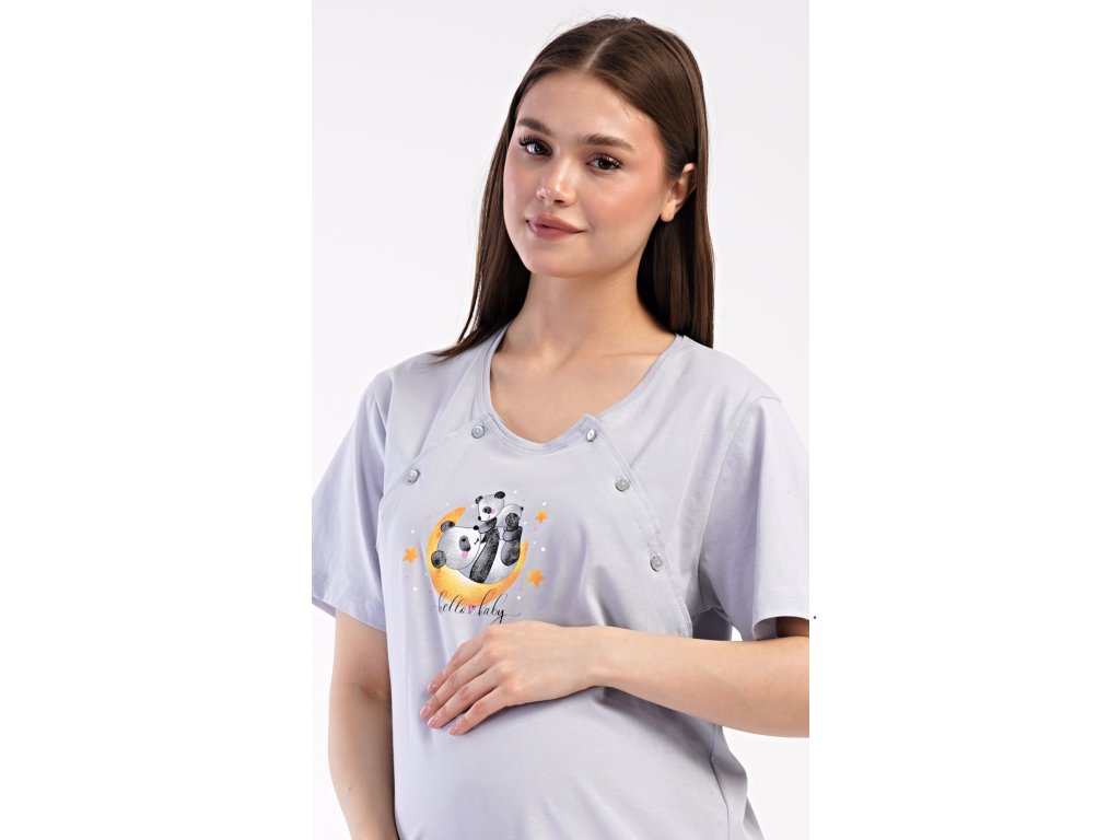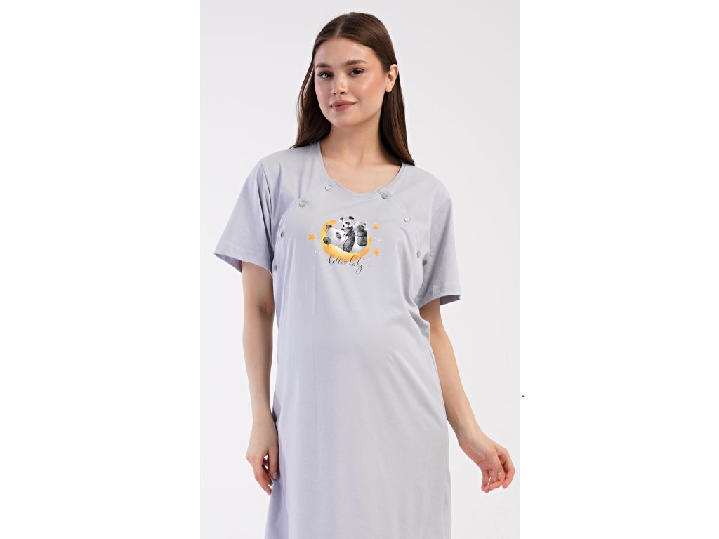 Dámska bavlnená materská nočná košeľa Hello baby. Nočná košeľa je svojim strihom určená na dobu tehotenstva, do pôrodnice aj na dojčenie. Na dojčenie slúžia prestrihy po stranách košele, ktoré sú uzatvárateľné na gombíky. Jednofarebná košeľa je ozdobená obrázkom pandy s bábätkom. Použitý materiál s podielom bavlny 100% je príjemný a poddajný na dotyk.