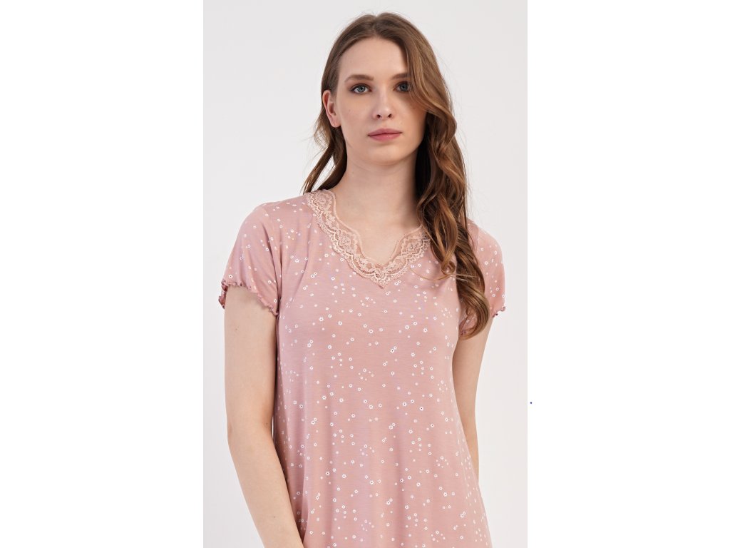 Dámska nočná košeľa s krátkym rukávom Judita. Nočná košeľa má príjemnú dĺžku nad kolená a ozdobné žliabkovanie okolo rukávov a spodného lemu. Výstrih je ozvláštnený jemnou čipkou. Košeľa s krátkym rukávom je potlačená drobnými kvietkami. Použitý materiál zo zmesi viskózy a lycry je príjemný a poddajný na dotyk.