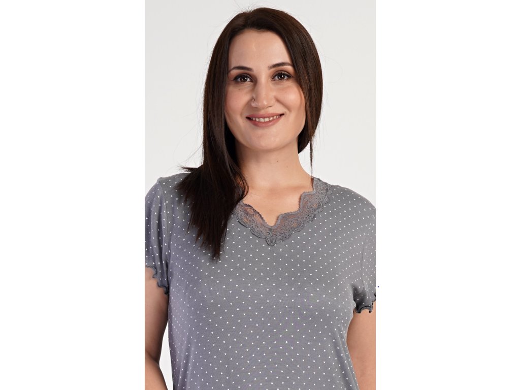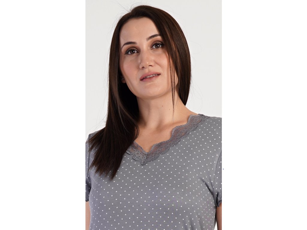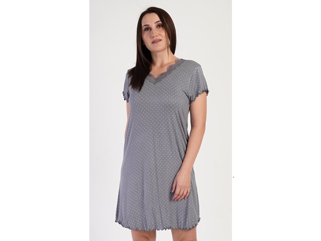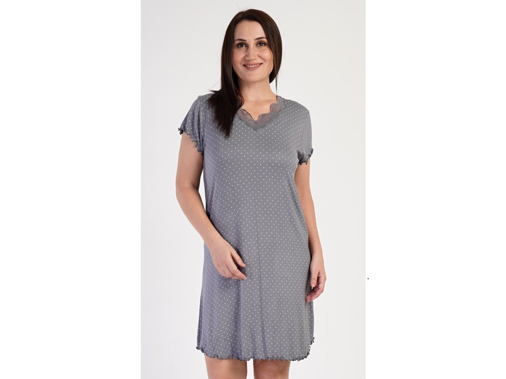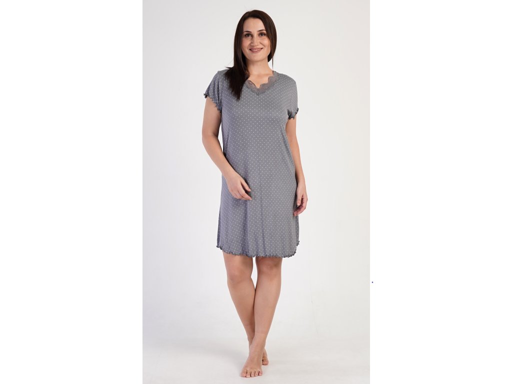 Dámska nočná košeľa s krátkym rukávom Pavlína. Nočná košeľa s príjemnou dĺžkou po kolená má žliabkovanie na rukávoch a spodnom leme, výstrih je ozdobený čipkou. Na látke košele sú vytlačené drobné bodky. Použitý viskózový materiál s prímesou lycry je príjemný a poddajný na dotyk.