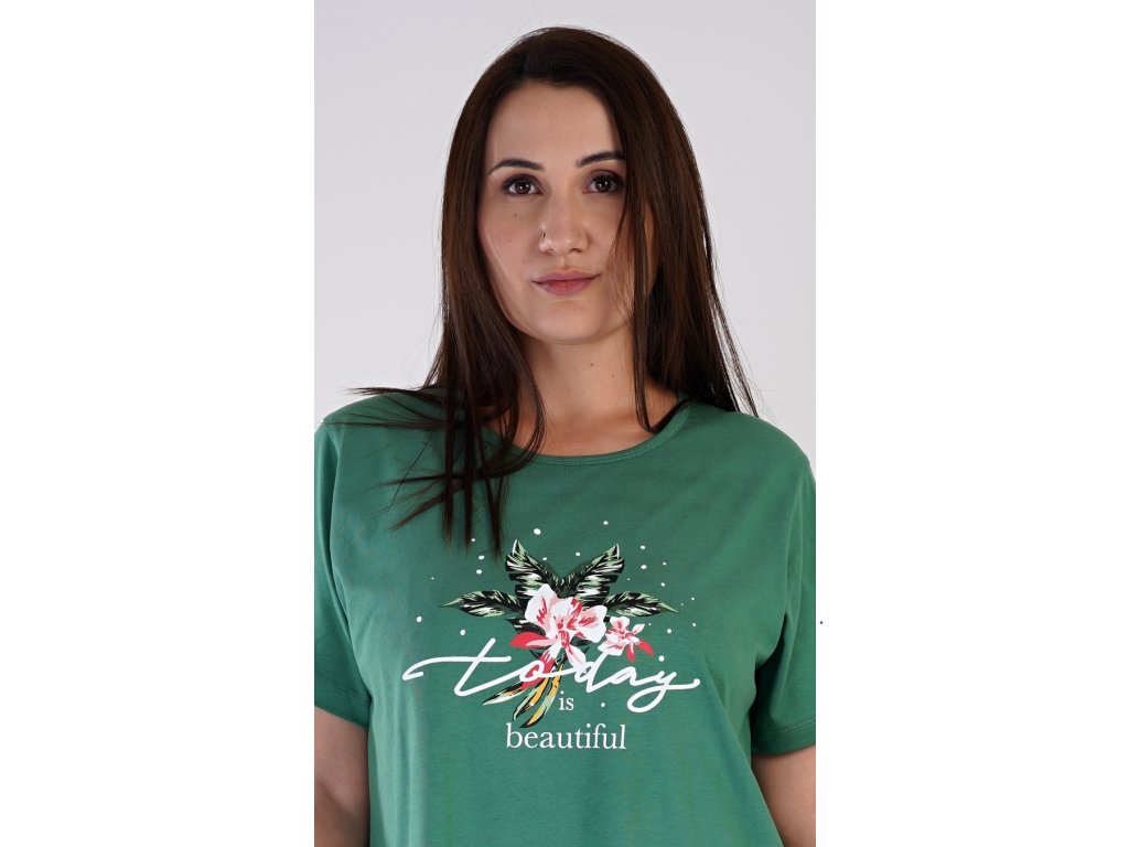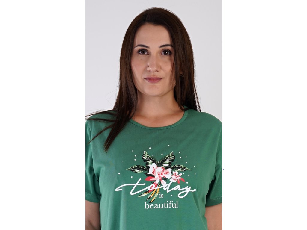 Dámska bavlnená nočná košeľa s krátkym rukávom Today is beautiful. Dámska nočná košeľa je v smaragdovej farbe, na hrudi má nápis 'Today is beautiful' a obrázok exotických kvetov. Použitý materiál s obsahom bavlny 100% je príjemný a poddajný na dotyk.