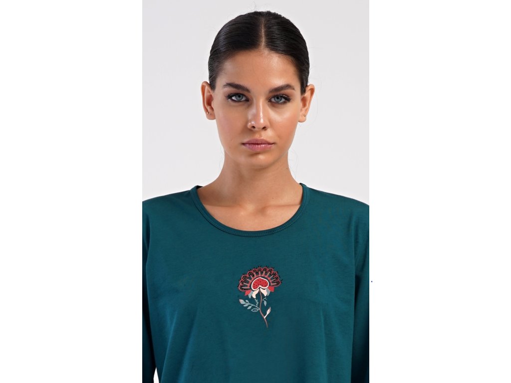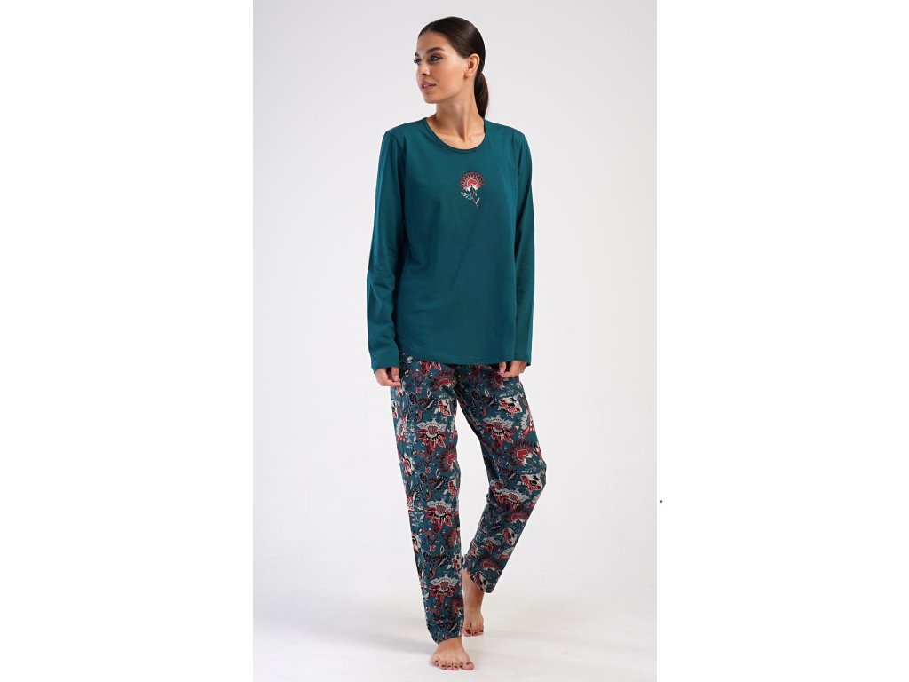 Dámske bavlnené dlhé pyžamo Jazmína. Dámske pyžamo sa skladá z trička s dlhým rukávom a dlhých nohavíc. Tričko je jednofarebné, zdobené obrázkom orientálneho kvetu. Tento motív sa opakuje aj na nohaviciach, ktoré majú v páse gumu a šnúrku na stiahnutie, nemajú vrecká. Použitý bavlnený materiál je poddajný a príjemný na dotyk.