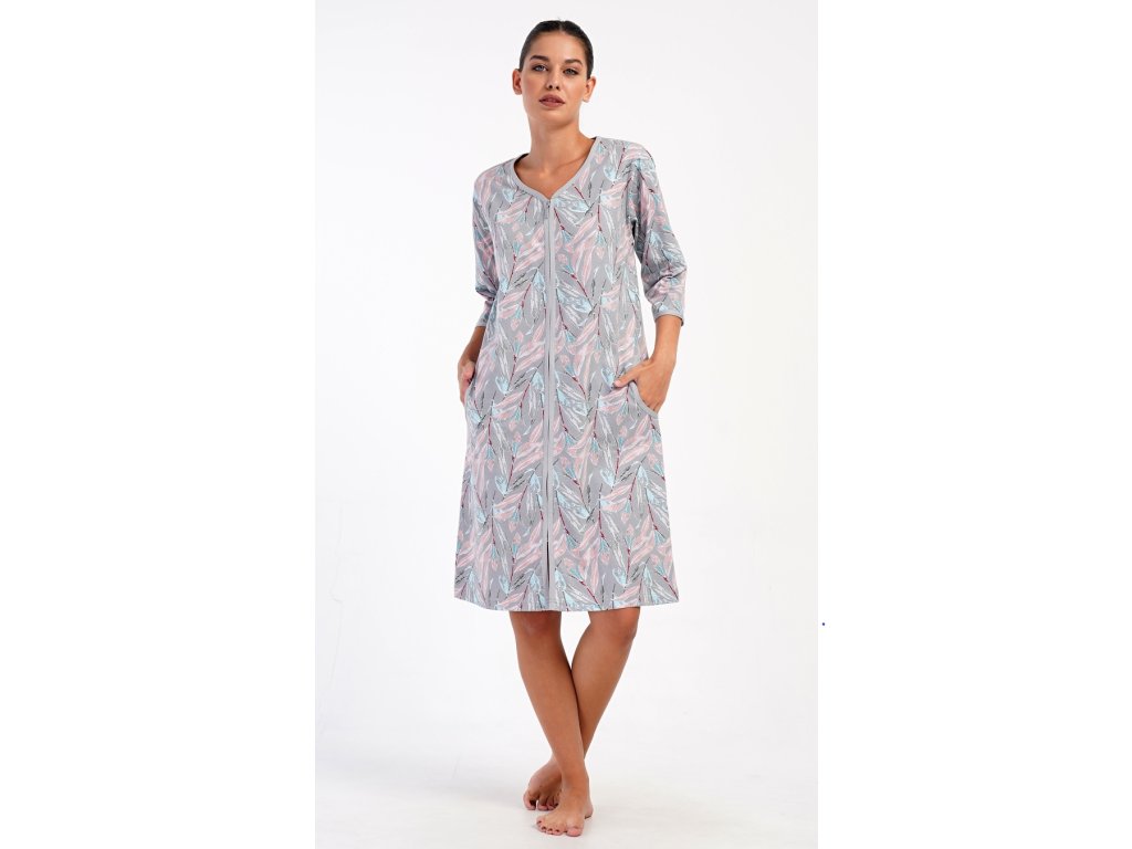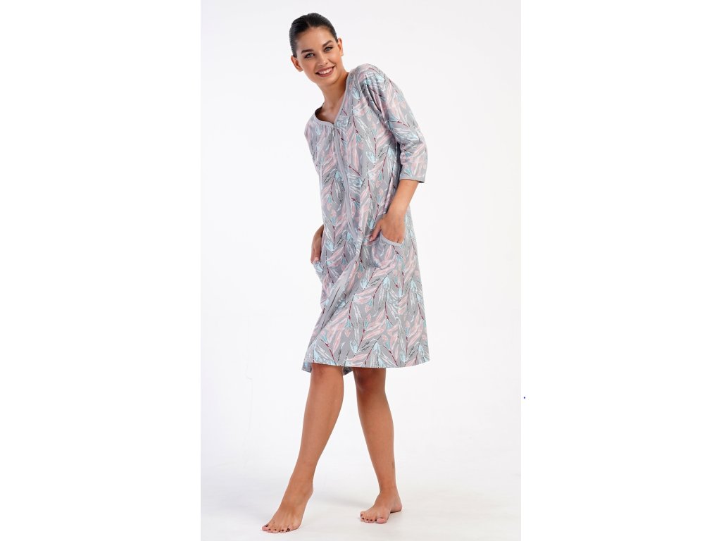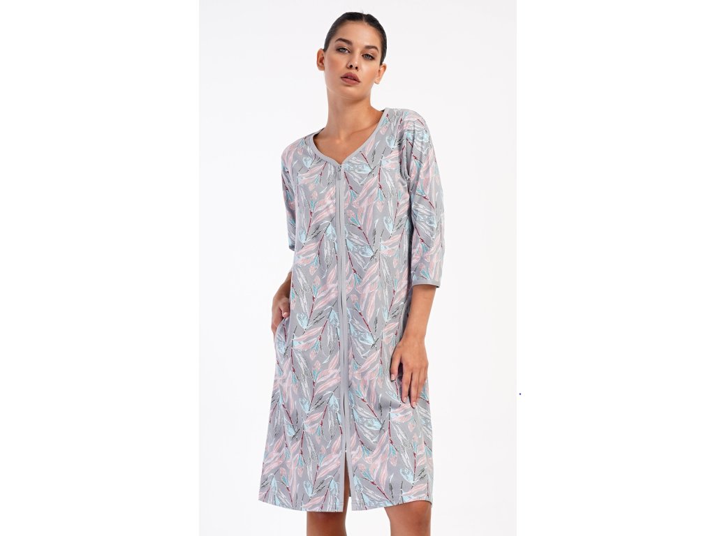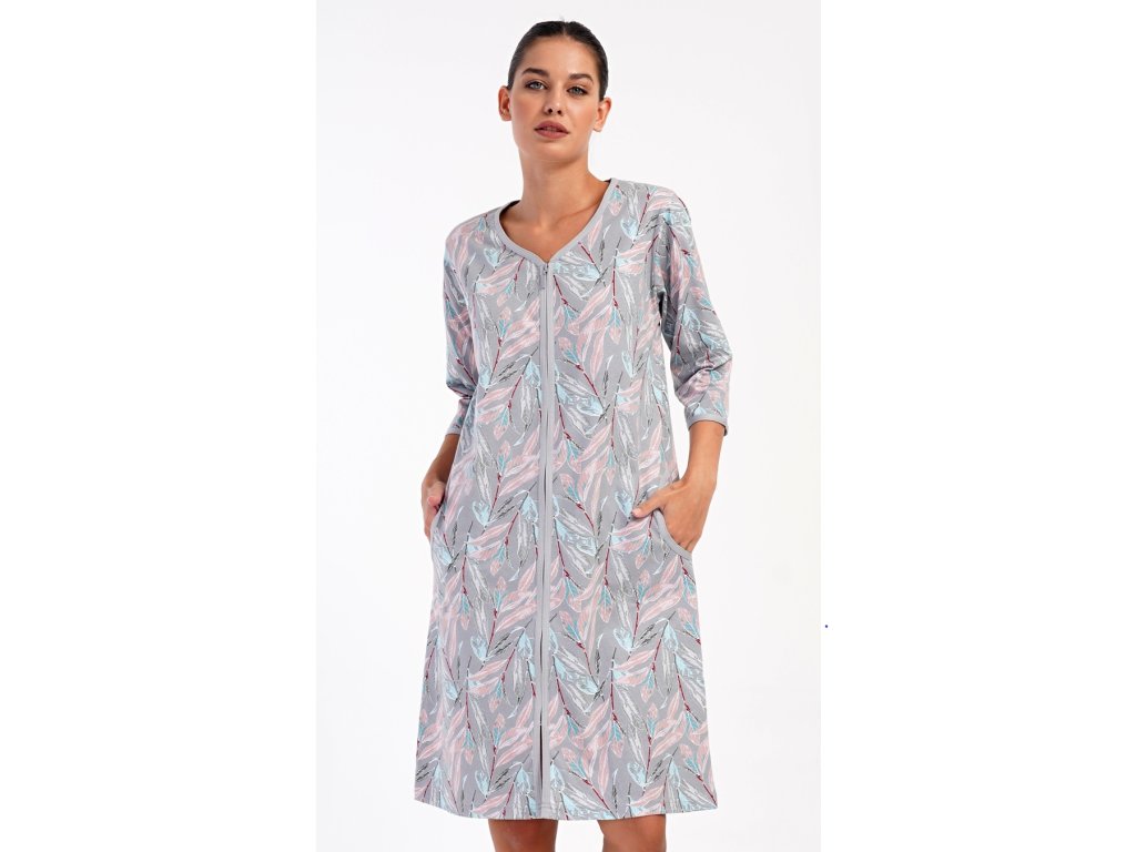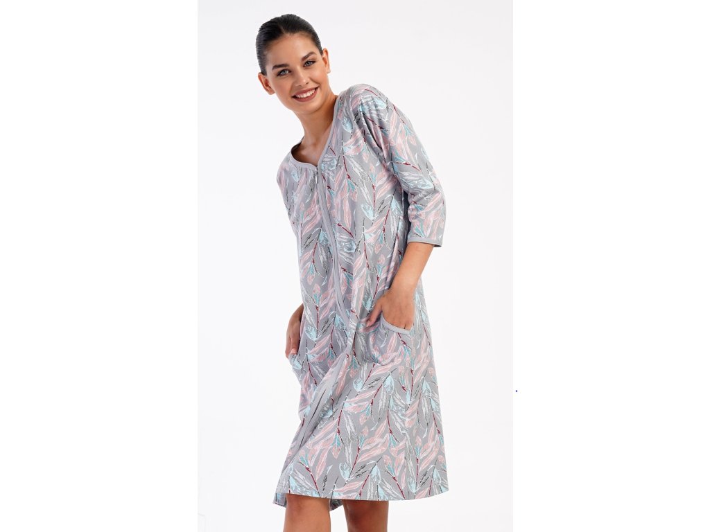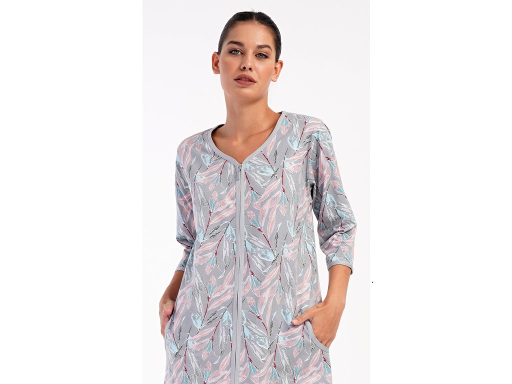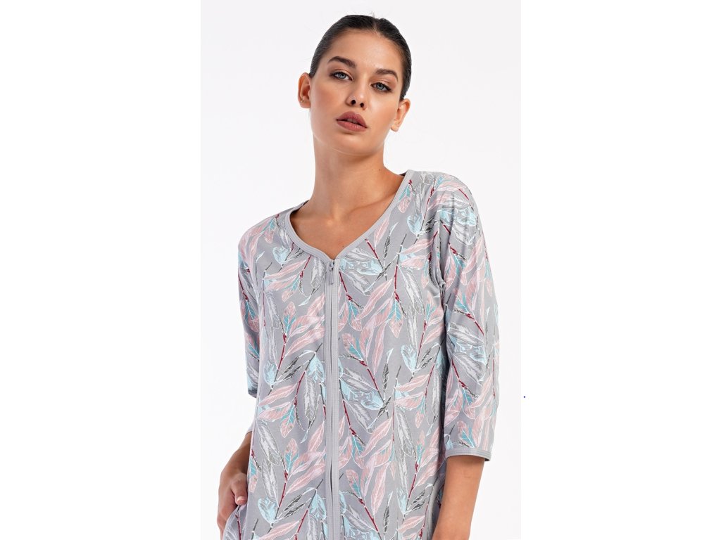 Dámske bavlnené domáce šaty s trojštvrťovým rukávom Kika. Pohodlné rozopínacie šaty v príjemnej dĺžke pod kolená využijete takmer pri všetkých voľnočasových aktivitách. Majú praktické vrecká a zapínanie na zips. Šedé šaty sú potlačené vetvičkami a listami v mentolovej a lososovej farbe. Použitý bavlnený materiál je príjemný a poddajný na dotyk.