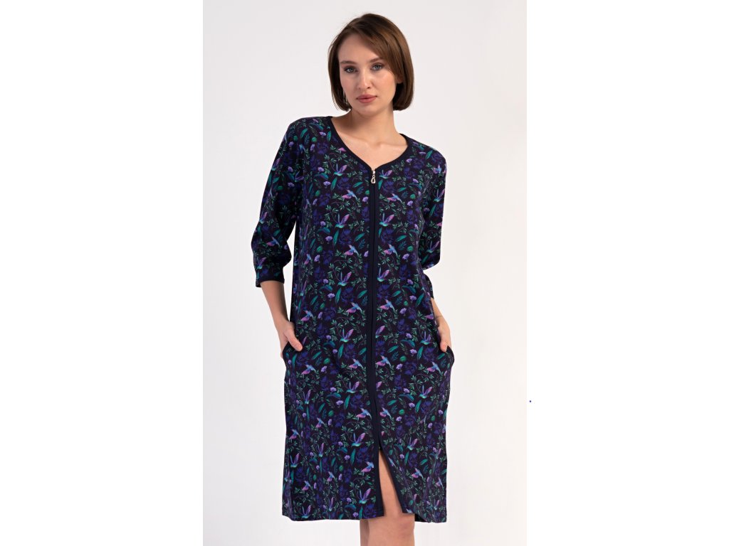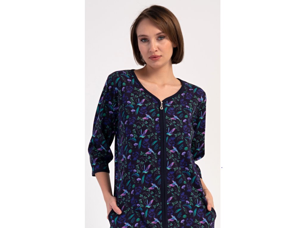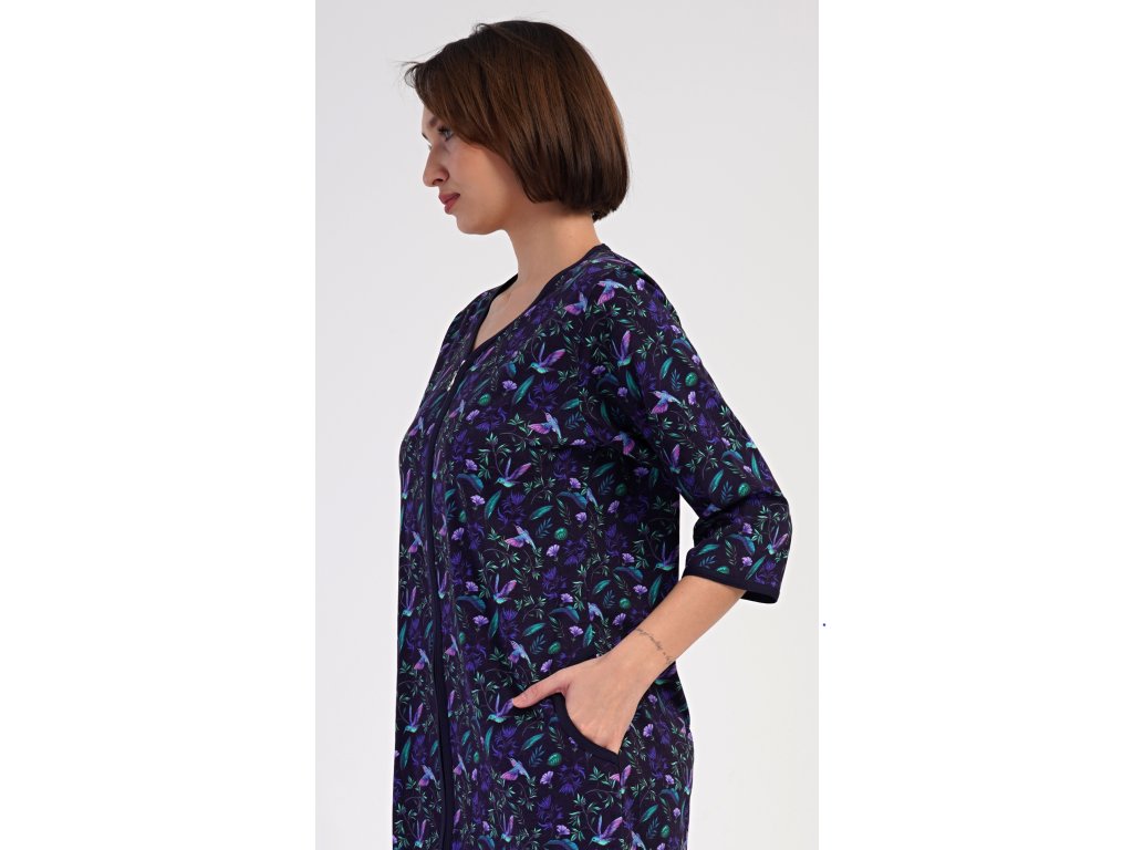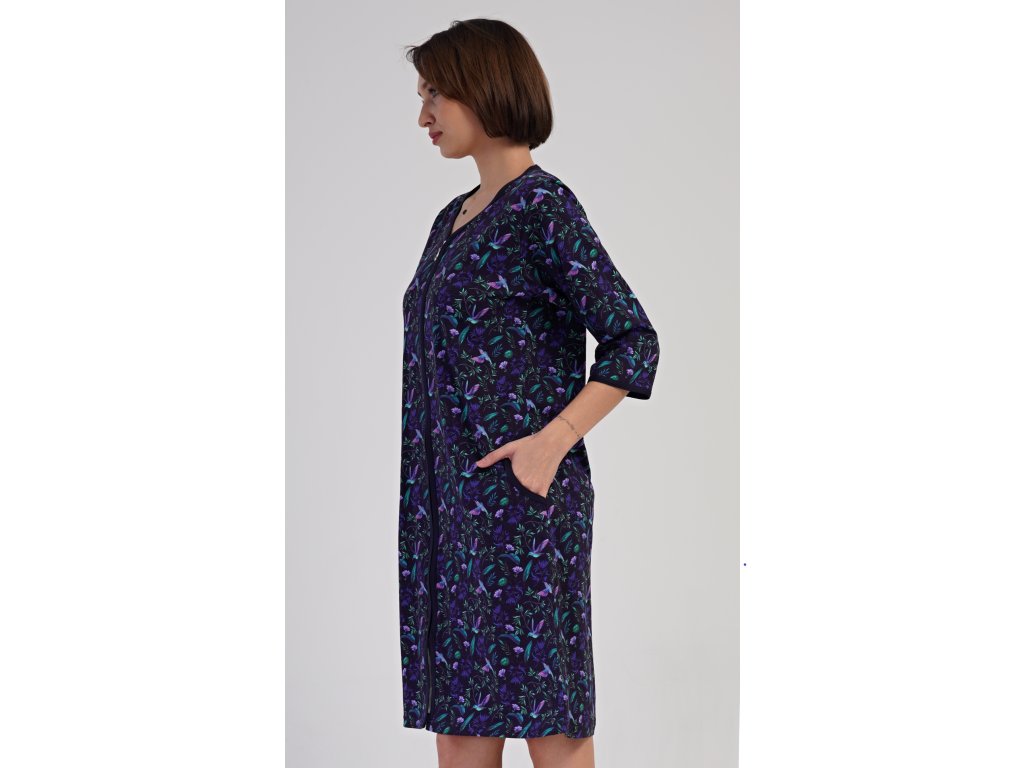 Dámske bavlnené domáce šaty s trojštvrťovým rukávom Kolibrík. Pohodlné rozopínacie šaty v príjemnej dĺžke pod kolená využijete takmer pri všetkých voľnočasových aktivitách. Majú praktické vrecká a zapínanie na zips. Šaty sú potlačené kolibríkmi. Použitý bavlnený materiál je príjemný a poddajný na dotyk.
