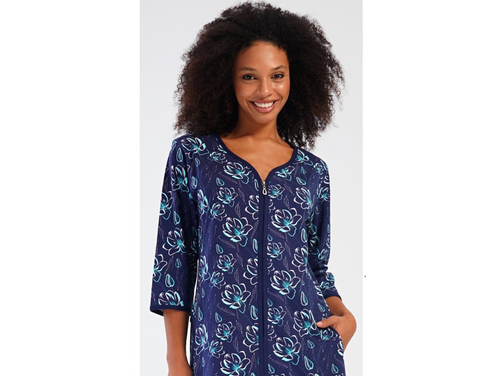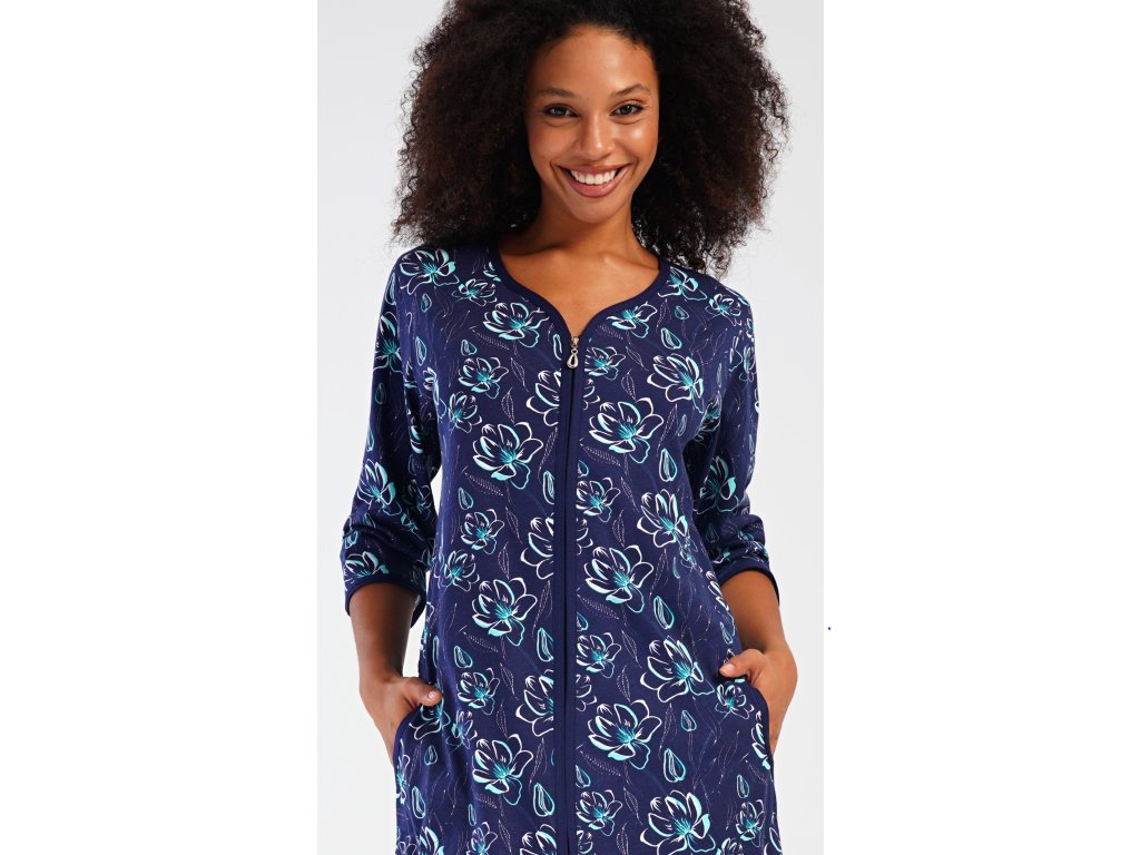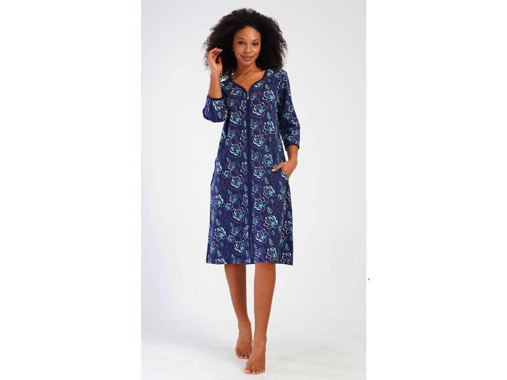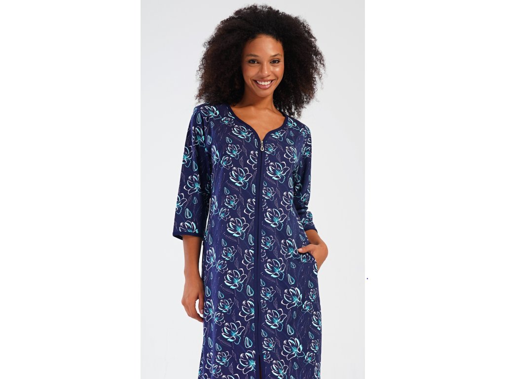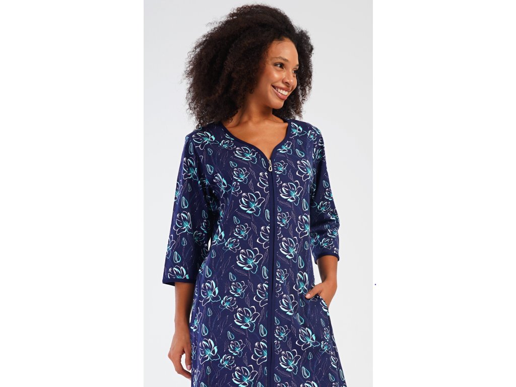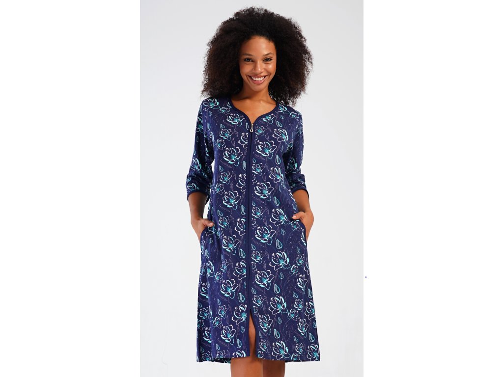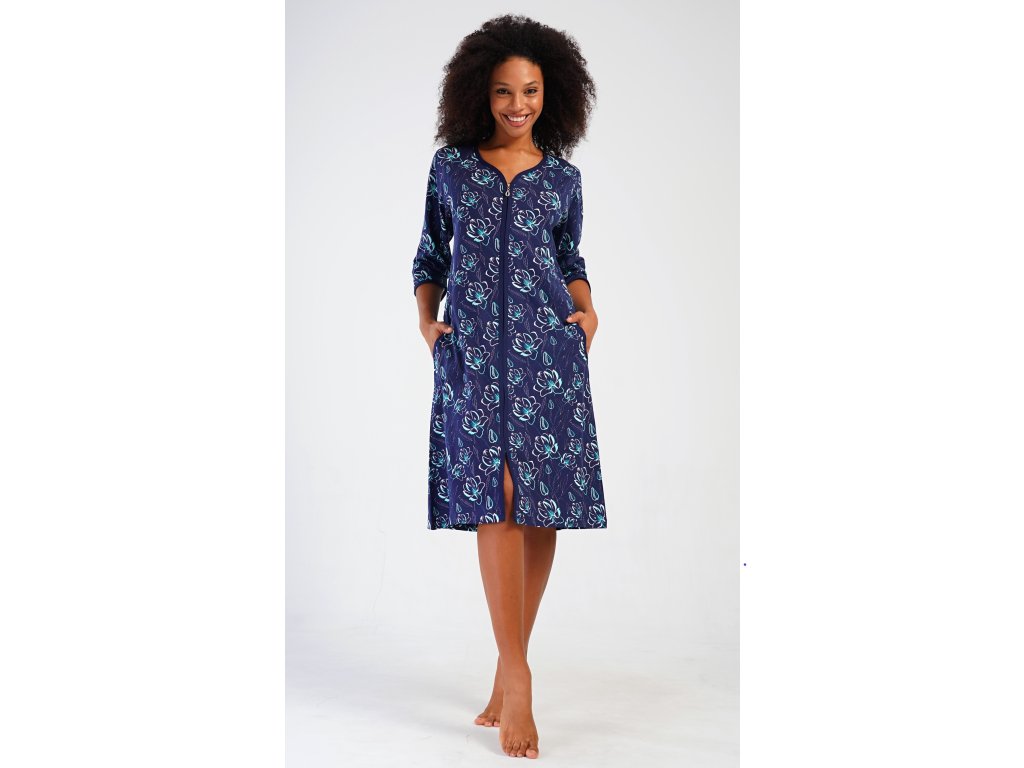 Dámske bavlnené domáce šaty s trojštvrťovým rukávom Lekná. Pohodlné rozopínacie šaty v príjemnej dĺžke pod kolená využijete takmer pri všetkých voľnočasových aktivitách. Majú praktické vrecká a zapínanie na zips. Šaty sú potlačené leknami. Použitý bavlnený materiál je príjemný a poddajný na dotyk.