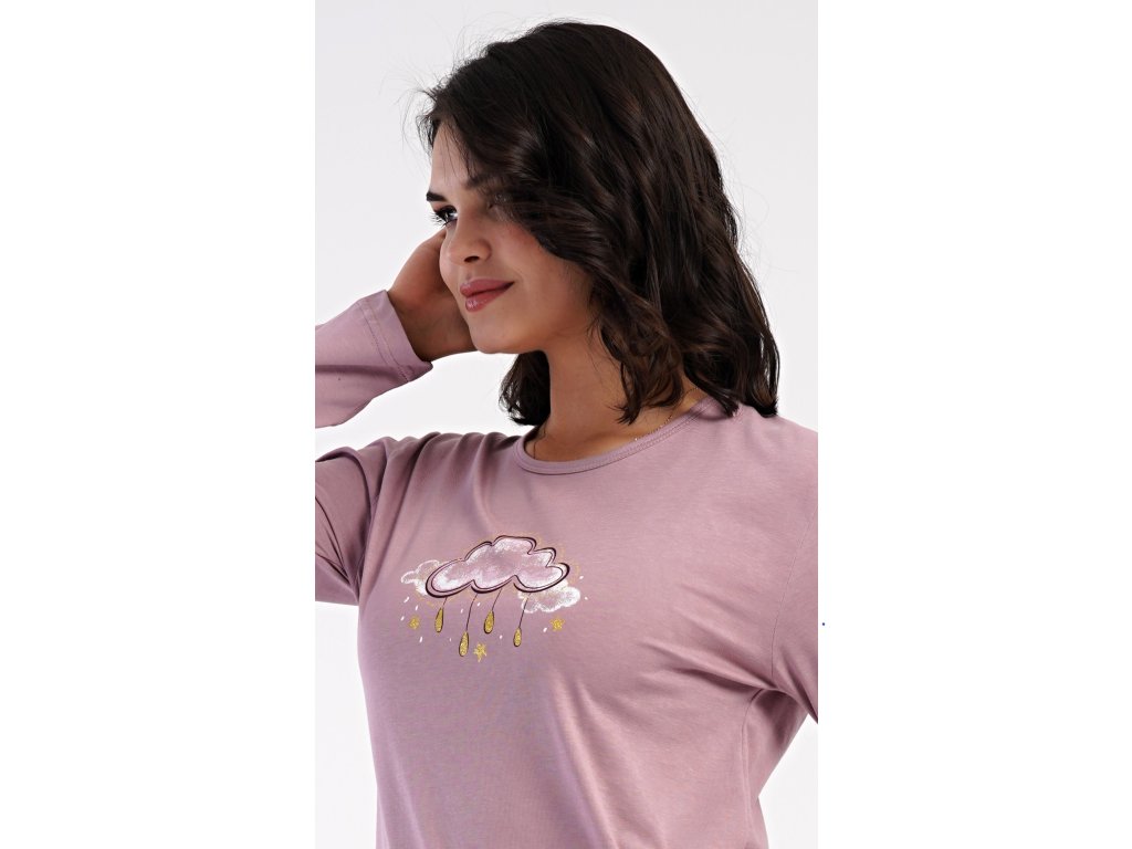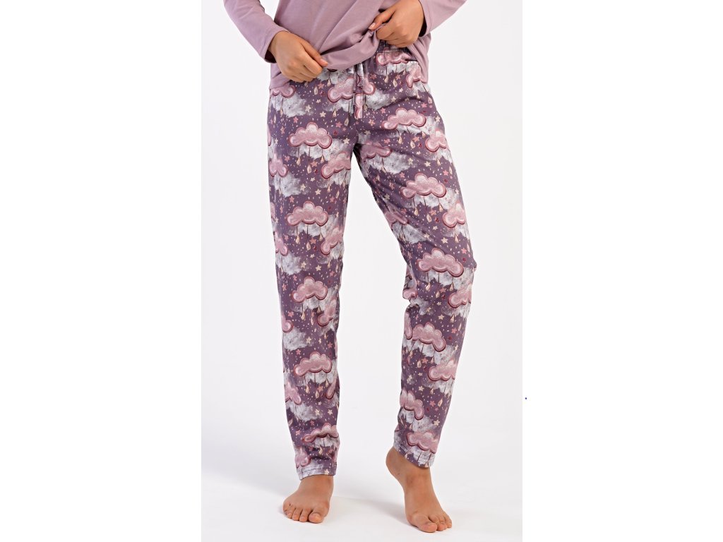 Dámske bavlnené dlhé pyžamo Amelia. Dámske pyžamo sa skladá z trička s dlhým rukávom a dlhých nohavíc. Jednofarebné tričko s okrúhlym výstrihom zdobí obrázok obláčika. Tento motív sa opakuje aj na nohaviciach, ktoré majú v páse gumu a šnúrku na stiahnutie, nemajú vrecká. Použitý bavlnený materiál je poddajný a príjemný na dotyk.