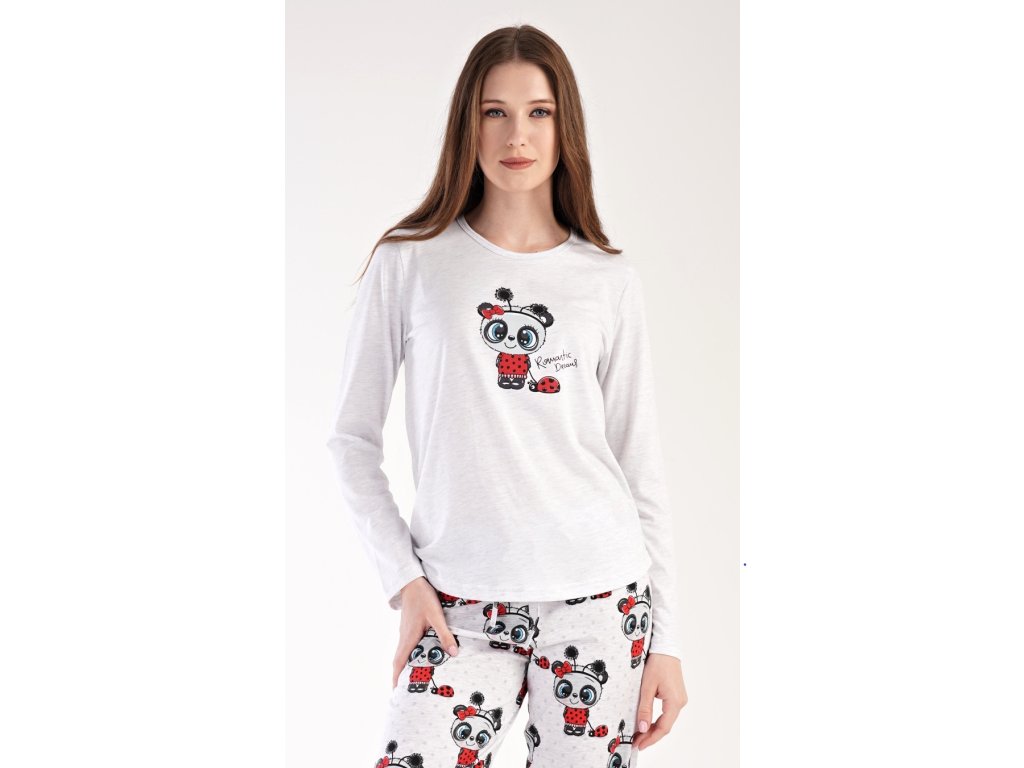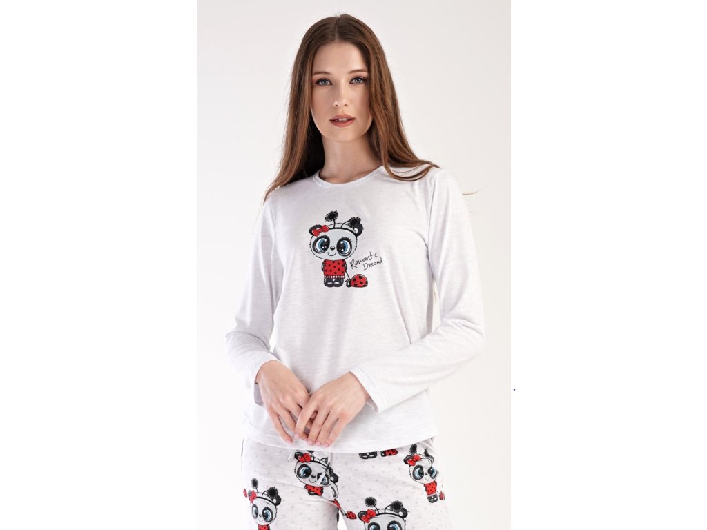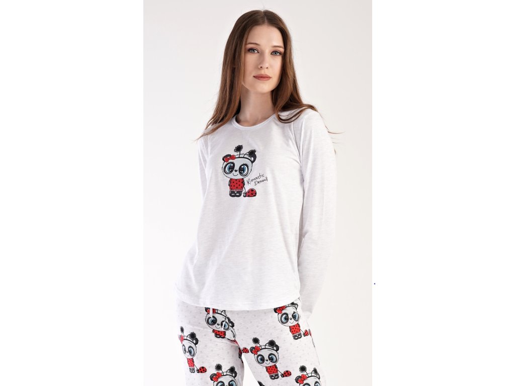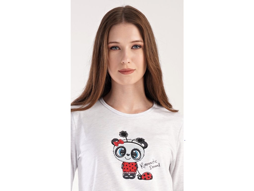 Dámske pyžamo dlhé Anežka. Dámske pyžamo sa skladá z trička s dlhým rukávom a dlhých nohavíc. Tričko je jednofarebné, zdobené nápisom ROMANTIC DREAMS a obrázkom roztomilé pandy. Nohavice sú svetlo šedé, potlačené rovnakým motívom. Nohavice majú v páse gumu a šnúrku na stiahnutie. Použitý materiál je poddajný a jemný na dotyk.