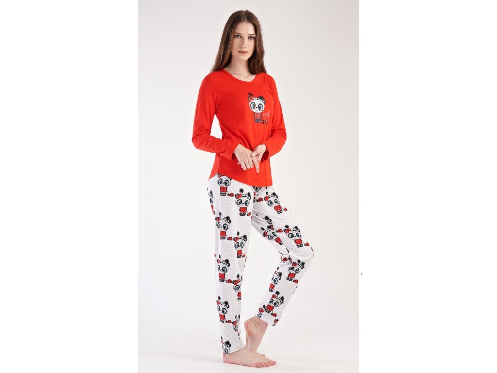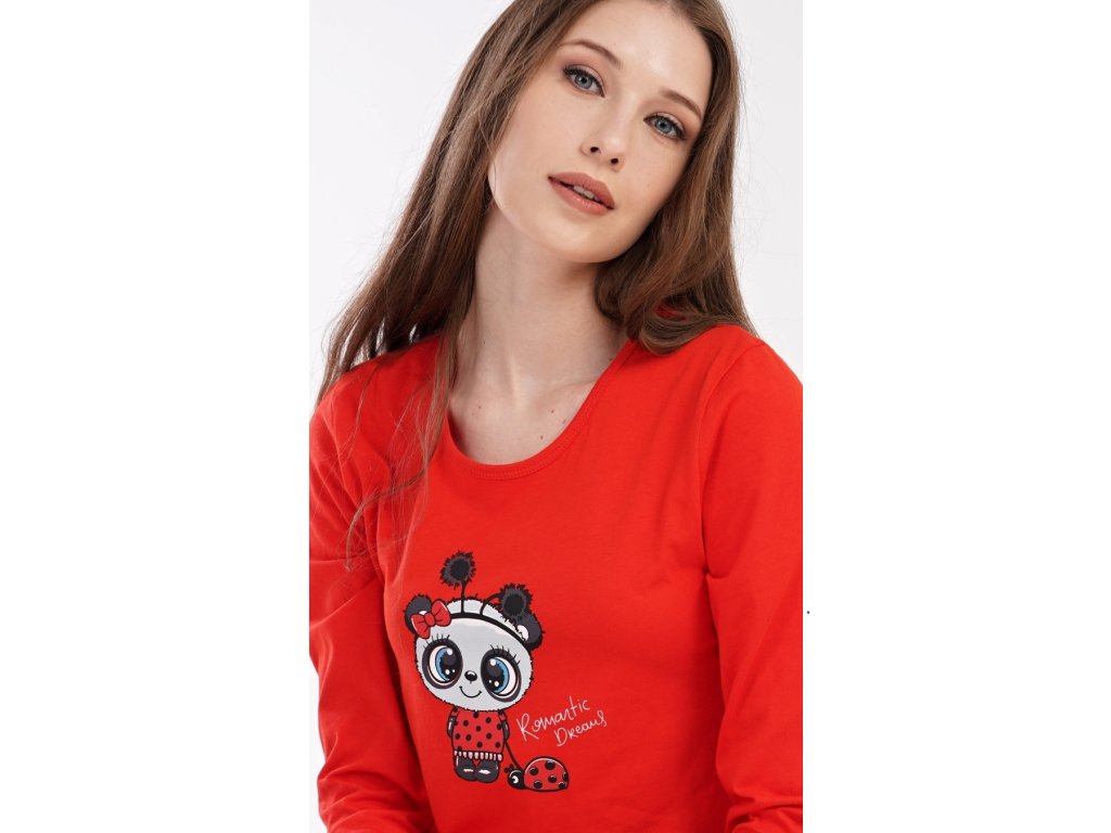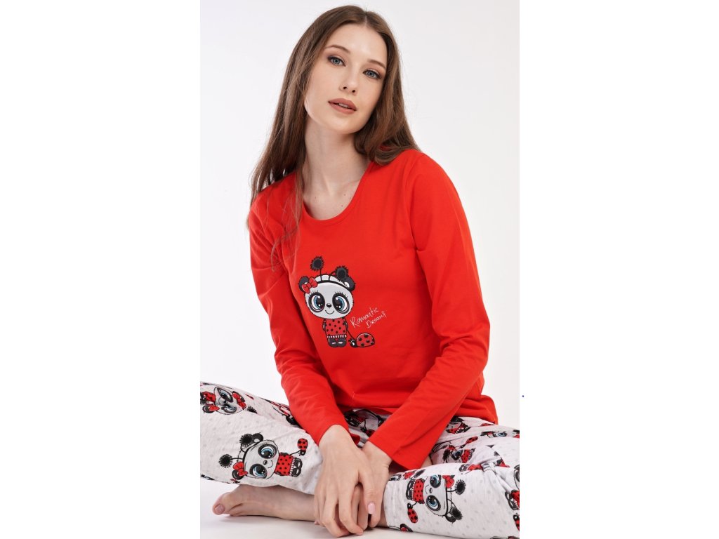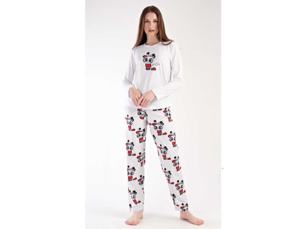 Dámske pyžamo dlhé Anežka. Dámske pyžamo sa skladá z trička s dlhým rukávom a dlhých nohavíc. Tričko je jednofarebné, zdobené nápisom ROMANTIC DREAMS a obrázkom roztomilé pandy. Nohavice sú svetlo šedé, potlačené rovnakým motívom. Nohavice majú v páse gumu a šnúrku na stiahnutie. Použitý materiál je poddajný a jemný na dotyk.