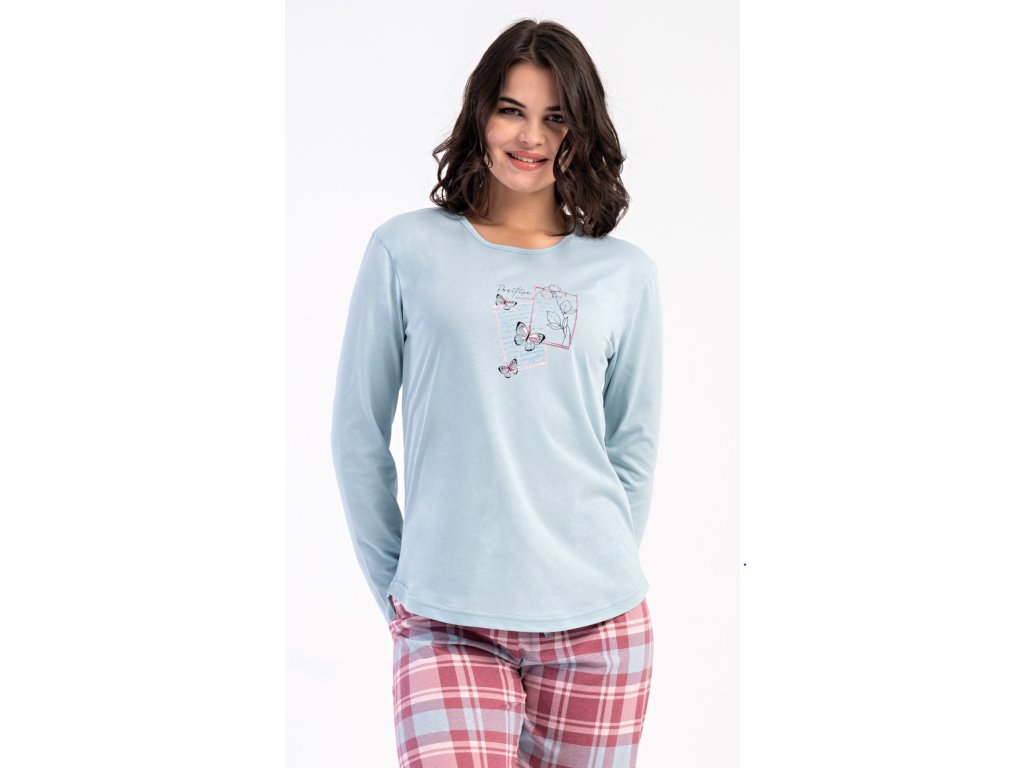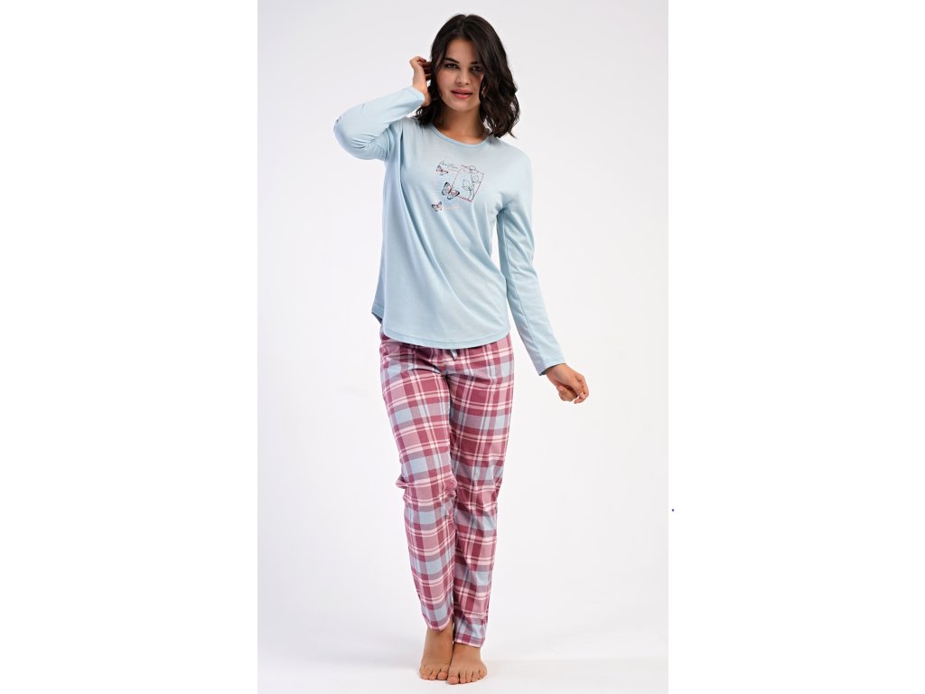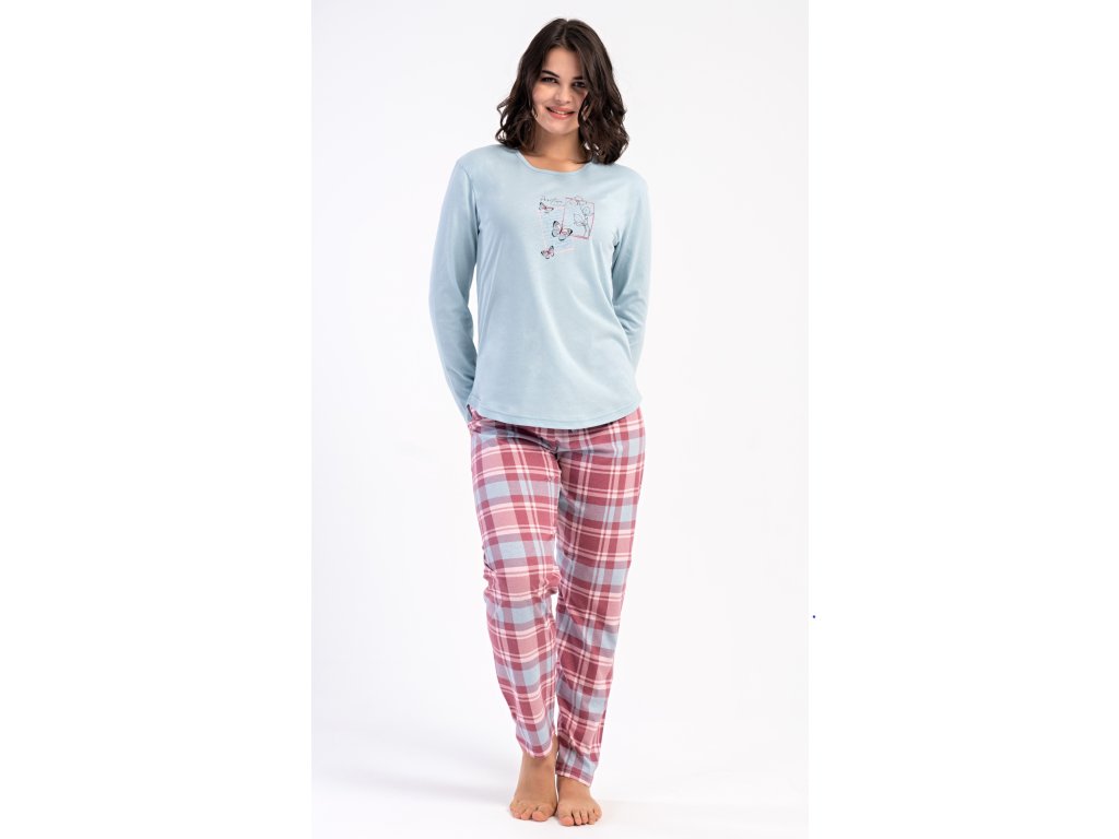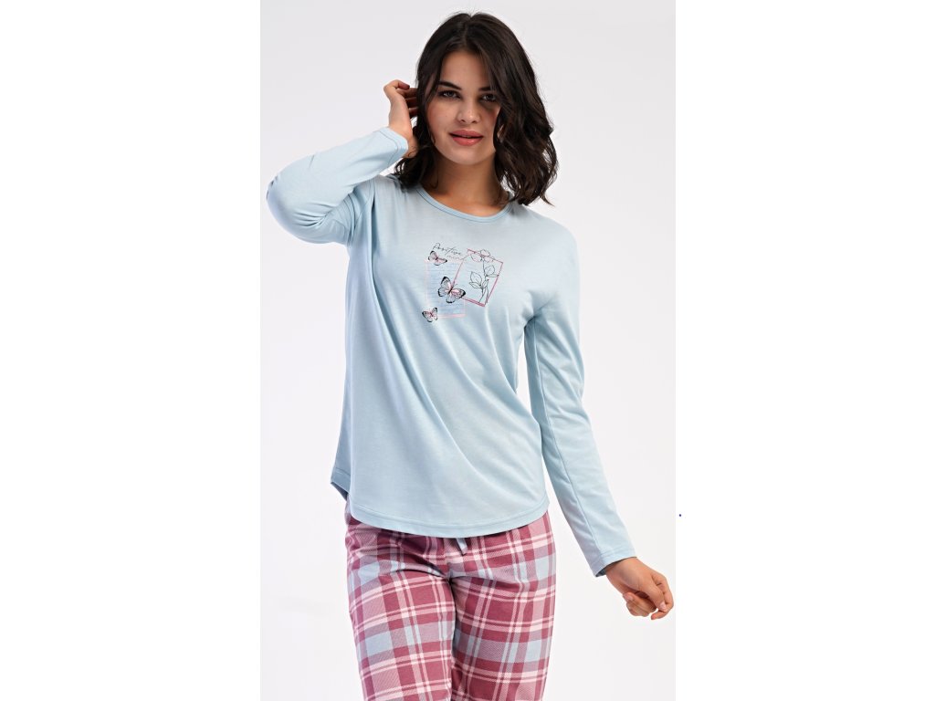 Dámske bavlnené dlhé pyžamo Charlotte. Dámske pyžamo sa skladá z trička s dlhým rukávom a dlhých nohavíc. Jednofarebné tričko s okrúhlym výstrihom zdobia na hrudi motýliky. Kárované nohavice majú v páse gumu a šnúrku na stiahnutie, nemajú vrecká. Použitý bavlnený materiál je poddajný a príjemný na dotyk.