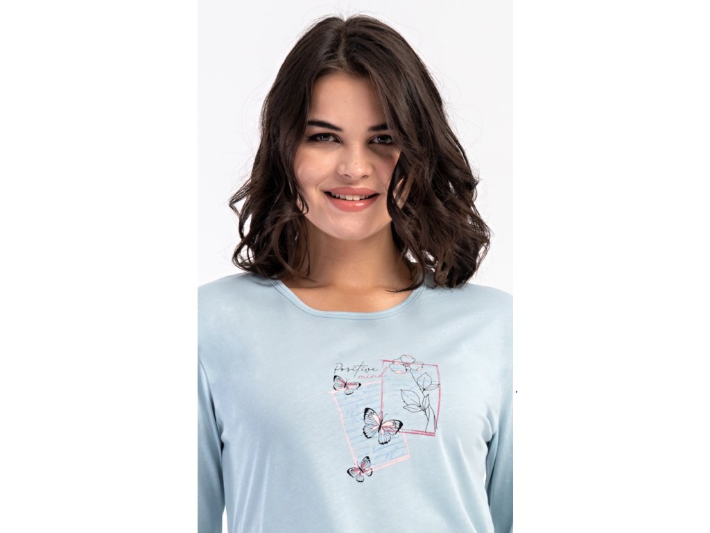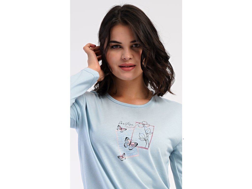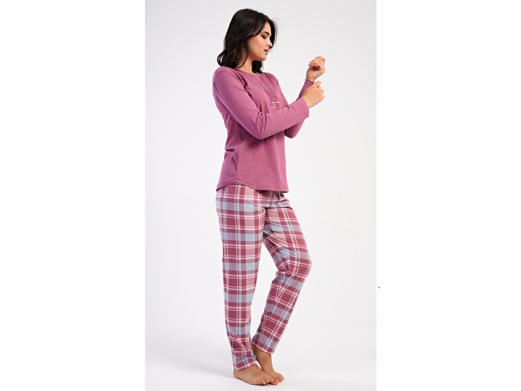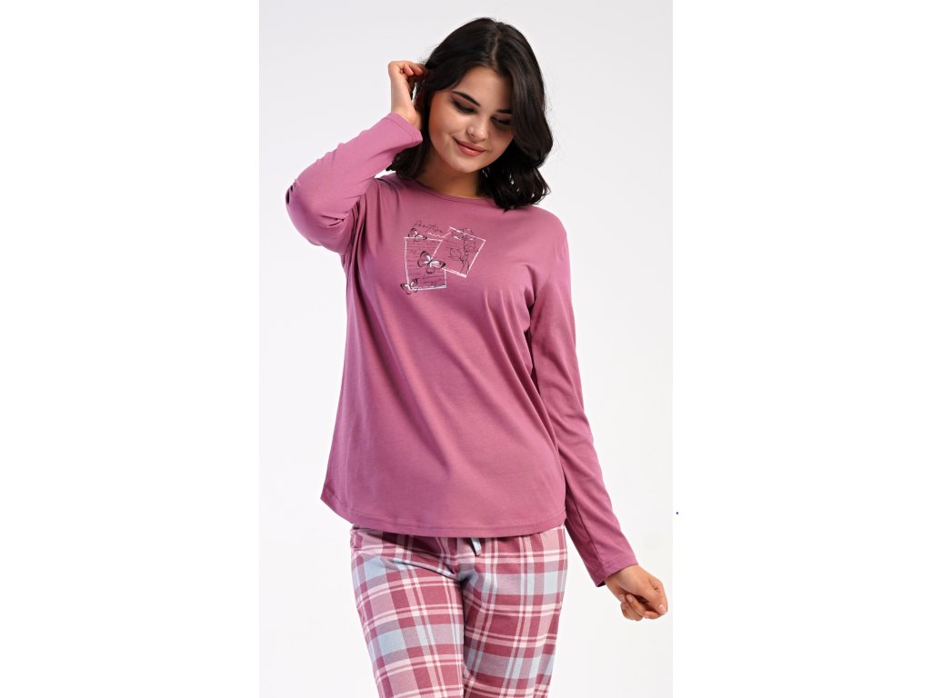 Dámske bavlnené dlhé pyžamo Charlotte. Dámske pyžamo sa skladá z trička s dlhým rukávom a dlhých nohavíc. Jednofarebné tričko s okrúhlym výstrihom zdobia na hrudi motýliky. Kárované nohavice majú v páse gumu a šnúrku na stiahnutie, nemajú vrecká. Použitý bavlnený materiál je poddajný a príjemný na dotyk.