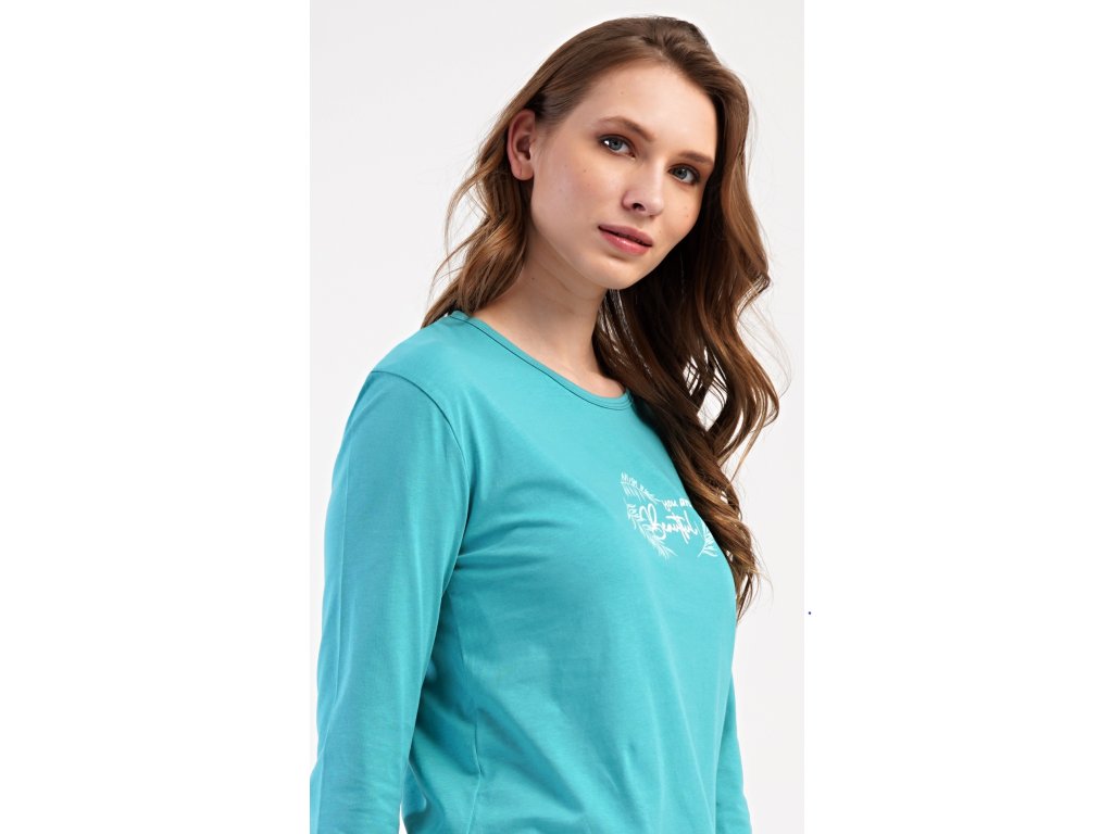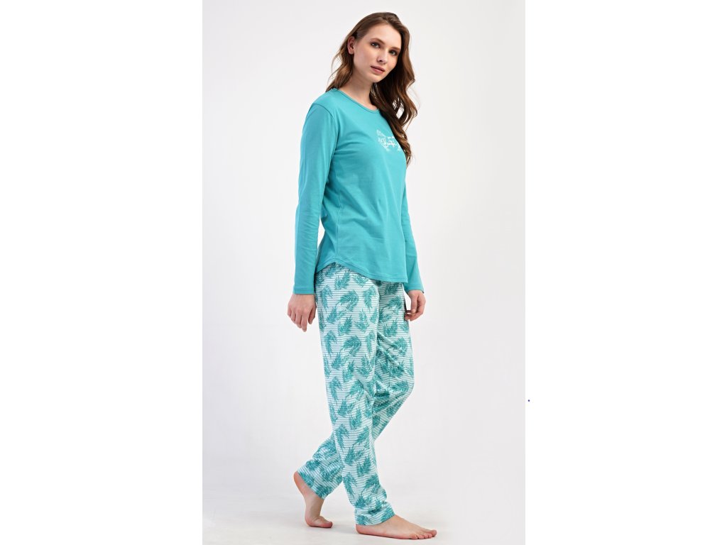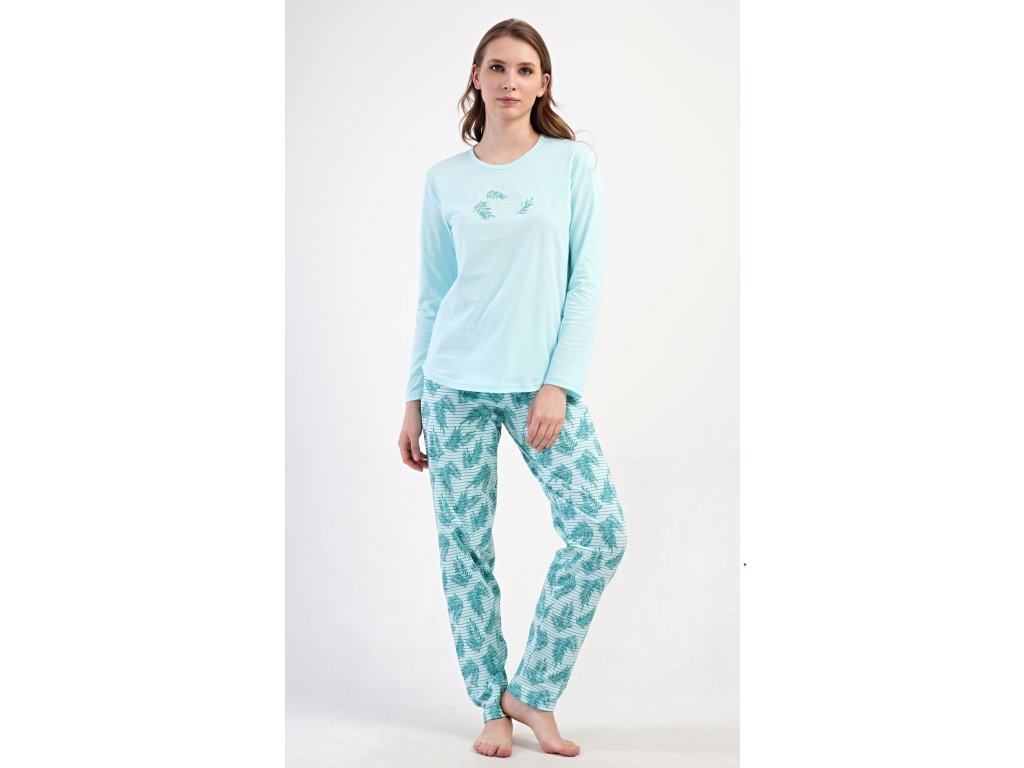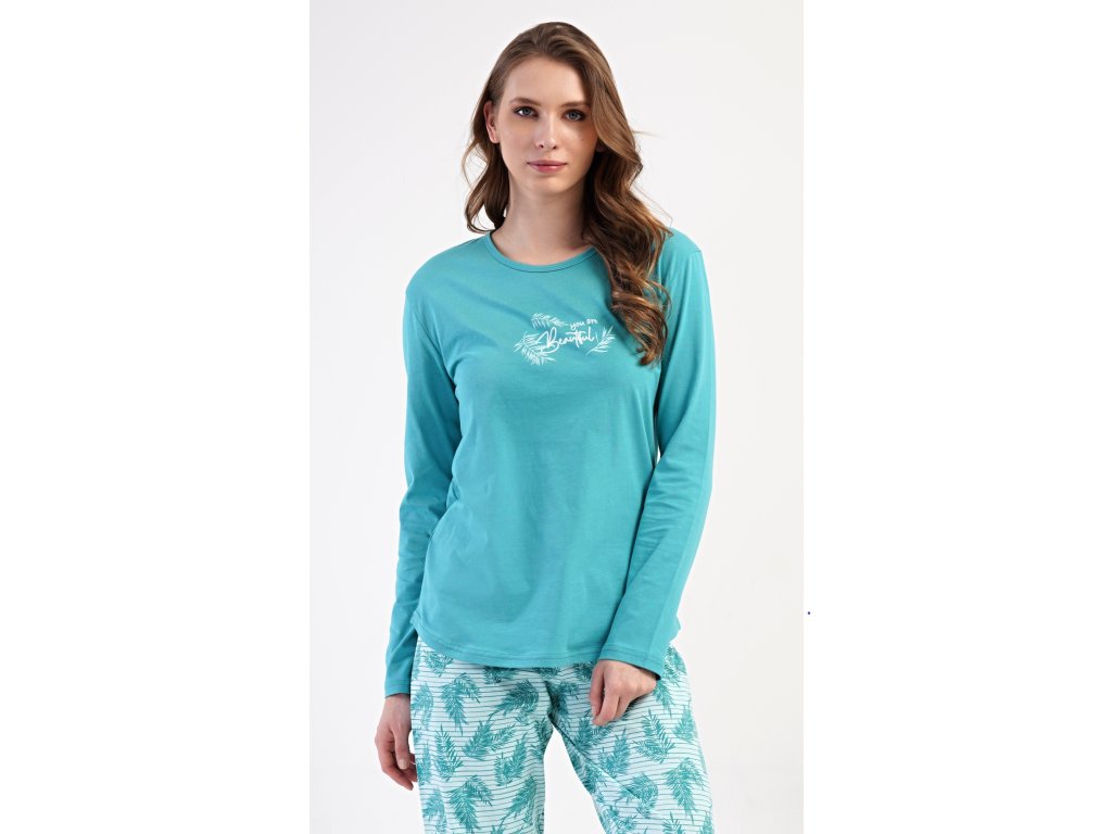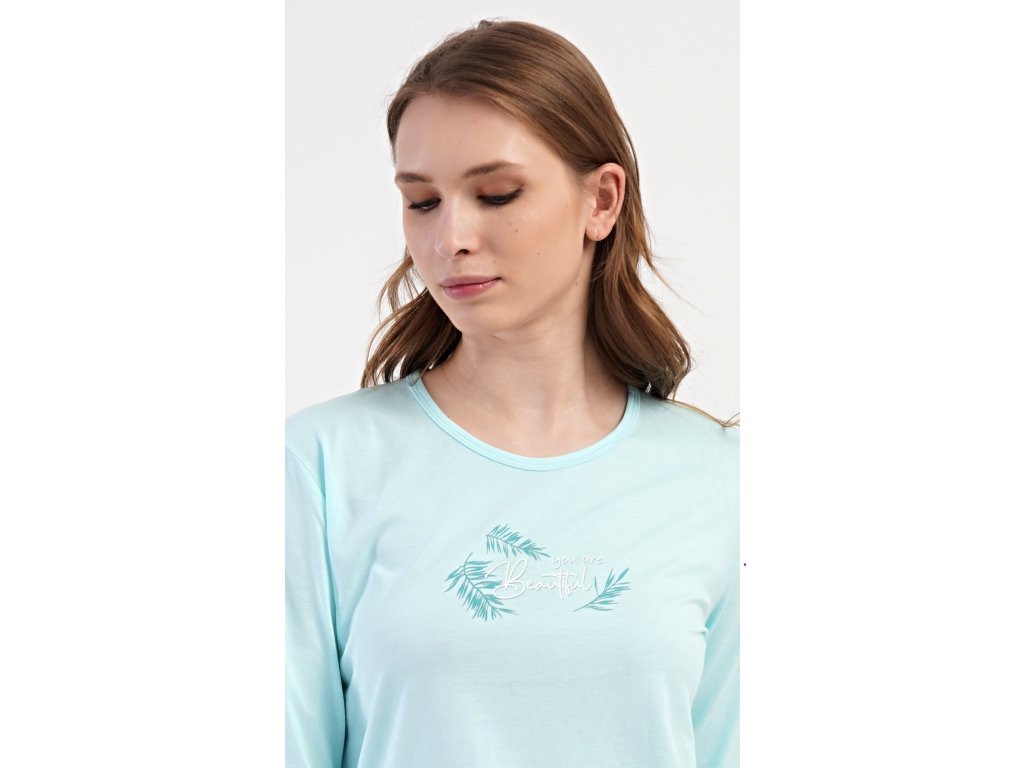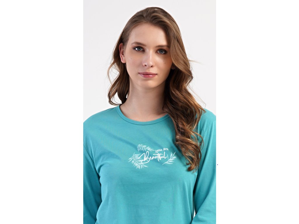 Dámske bavlnené dlhé pyžamo Denisa. Dámske pyžamo sa skladá z trička s dlhým rukávom a dlhých nohavíc. Tričko je jednofarebné, zdobené na hrudi drobným obrázkom vetvičiek a nápis 'You are beautiful'. Motív vetvičiek sa opakuje aj na nohaviciach, ktoré majú v páse gumu a šnúrku na stiahnutie, nemajú vrecká. Použitý bavlnený materiál je poddajný a príjemný na dotyk.