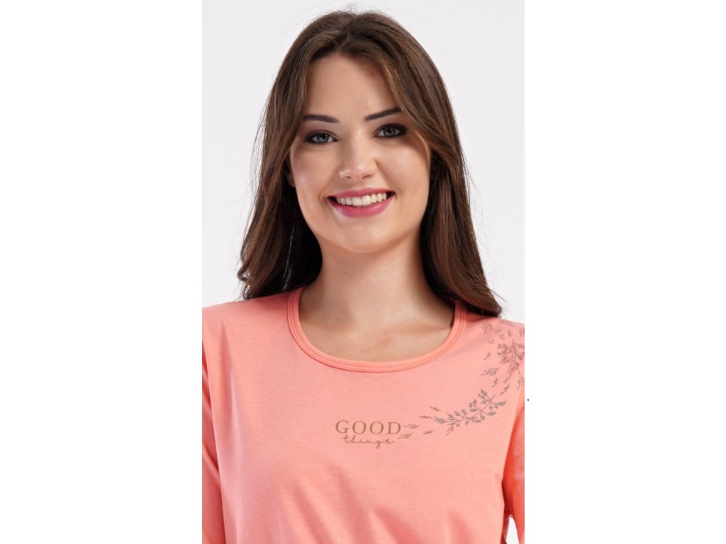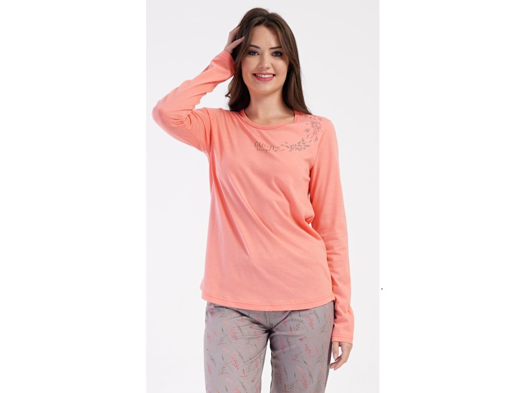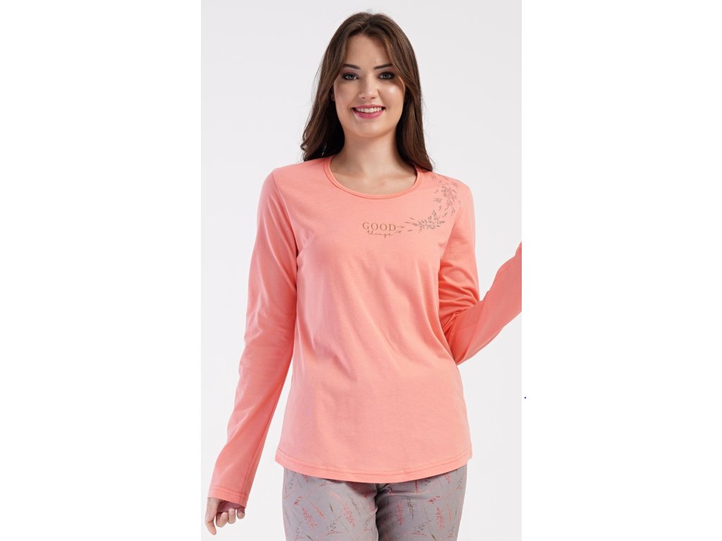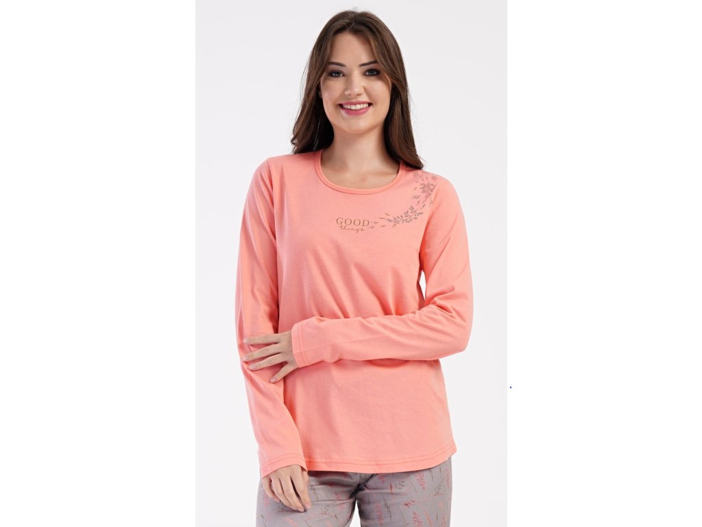 Dámske bavlnené dlhé pyžamo Good things. Dámske pyžamo sa skladá z trička s dlhým rukávom a dlhých nohavíc. Tričko je jednofarebné, zdobené menším obrázkom a nápisom 'Good things'. Nohavice majú v páse gumu a šnúrku na stiahnutie, nemajú vrecká. Použitý bavlnený materiál je poddajný a príjemný na dotyk.