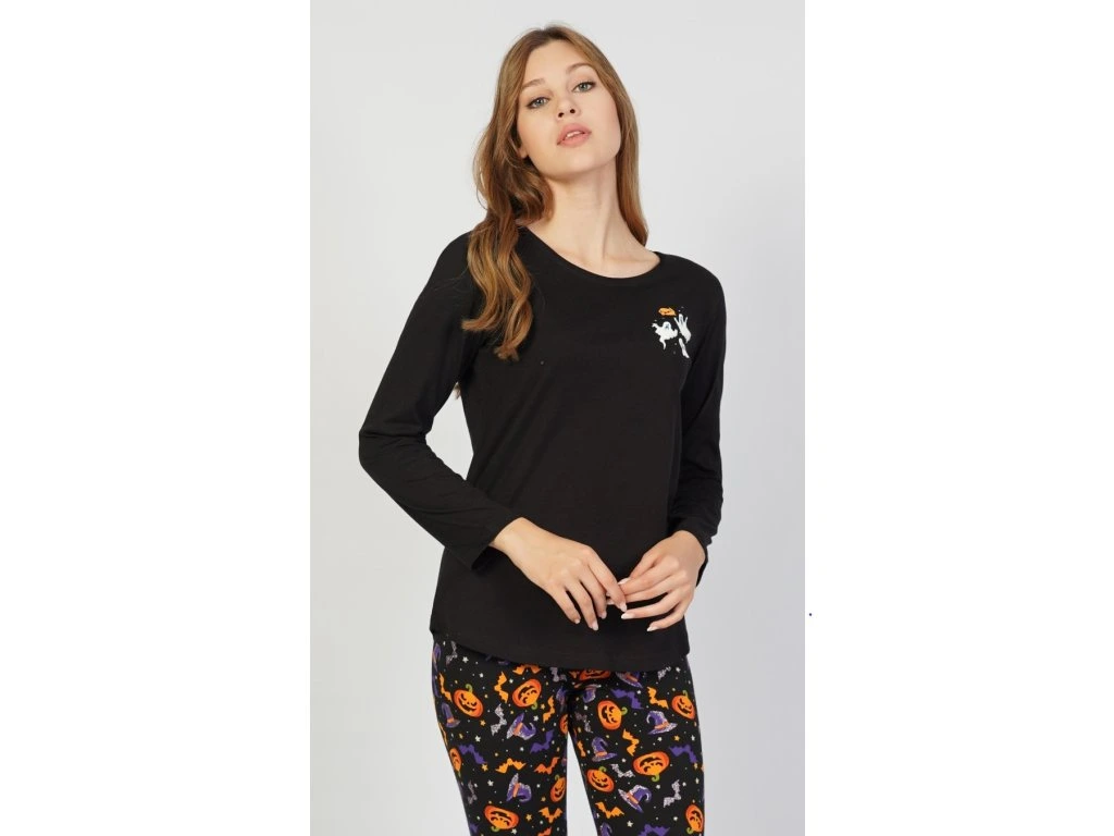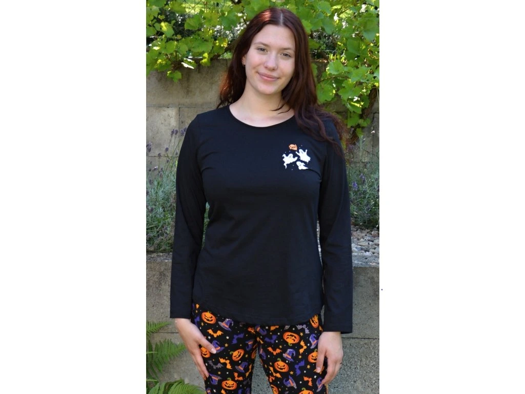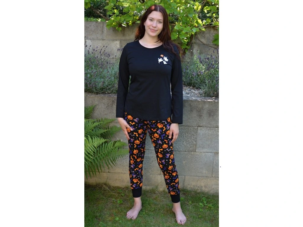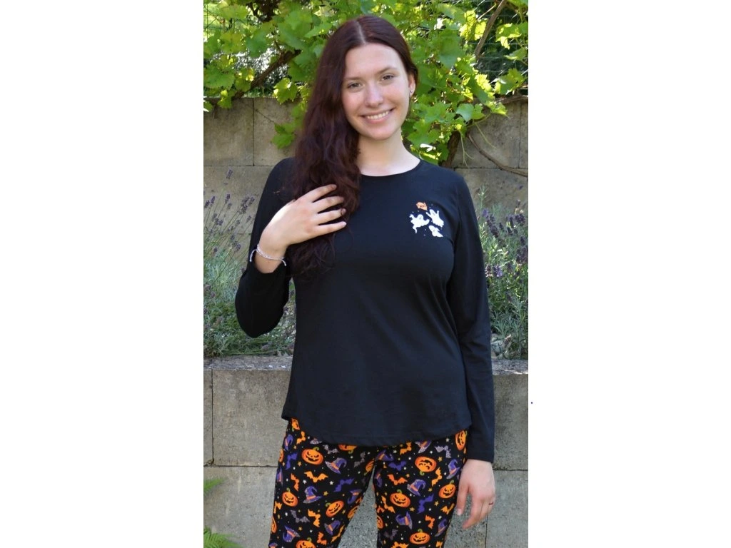 Dámske pyžamo dlhé Halloween. Dámske pyžamo sa skladá z tričká s dlhým rukávom a dlhých nohavíc. Na tričku je malý obázok s halloweenskymi motívmi, ktoré sa opakujú aj na dlhých nohaviciach. Nohavice majú gumu a šnúrku na stiahnutie, nemajú vrecká. Použitý bavlnený materiál je poddajný a príjemný na dotyk.