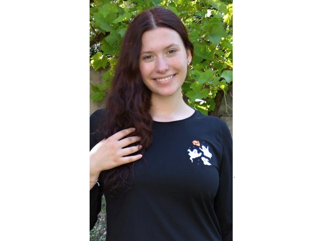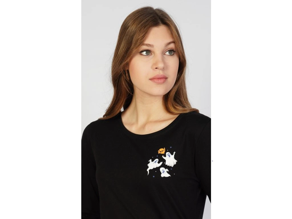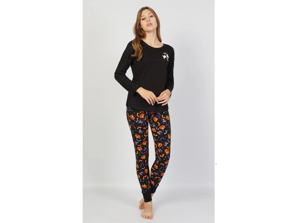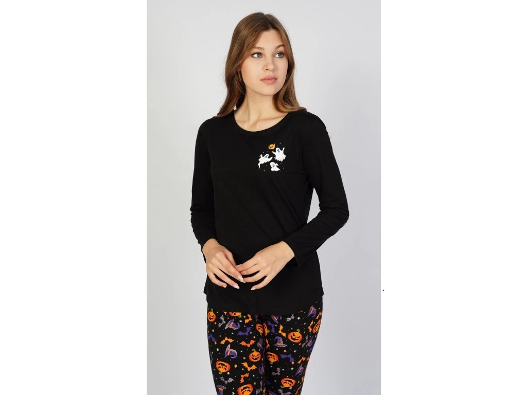 Dámske pyžamo dlhé Halloween. Dámske pyžamo sa skladá z tričká s dlhým rukávom a dlhých nohavíc. Na tričku je malý obázok s halloweenskymi motívmi, ktoré sa opakujú aj na dlhých nohaviciach. Nohavice majú gumu a šnúrku na stiahnutie, nemajú vrecká. Použitý bavlnený materiál je poddajný a príjemný na dotyk.