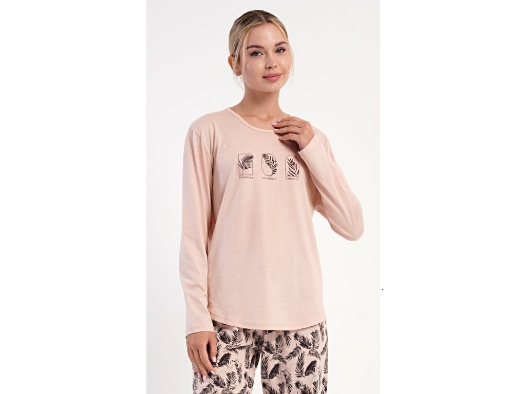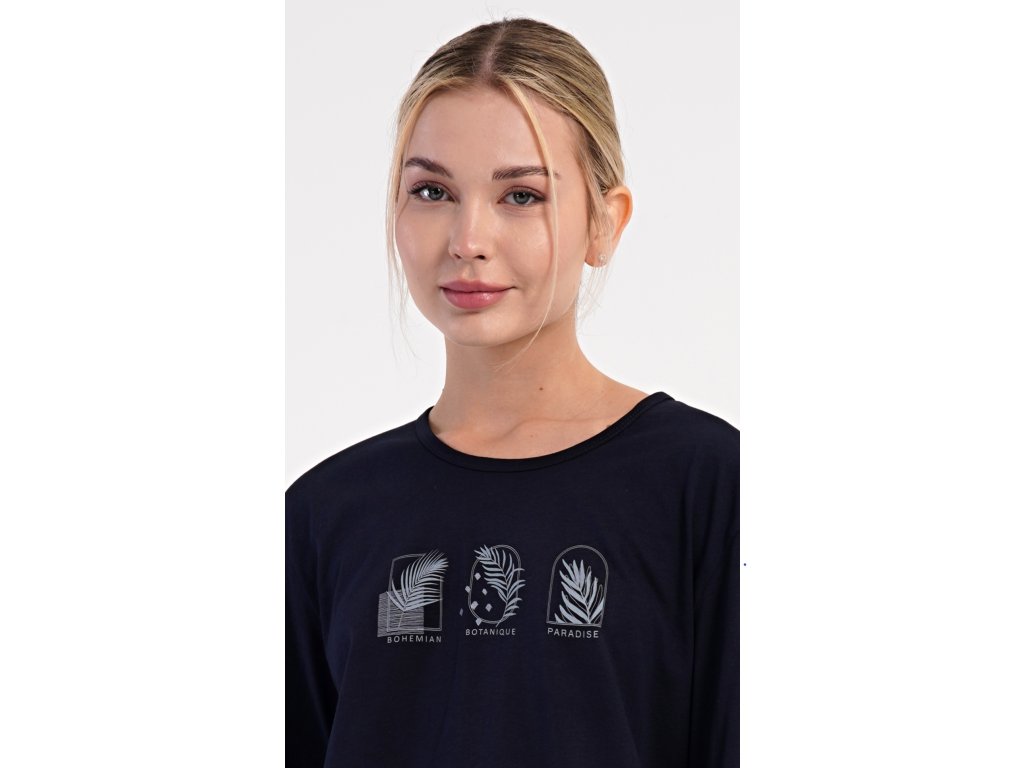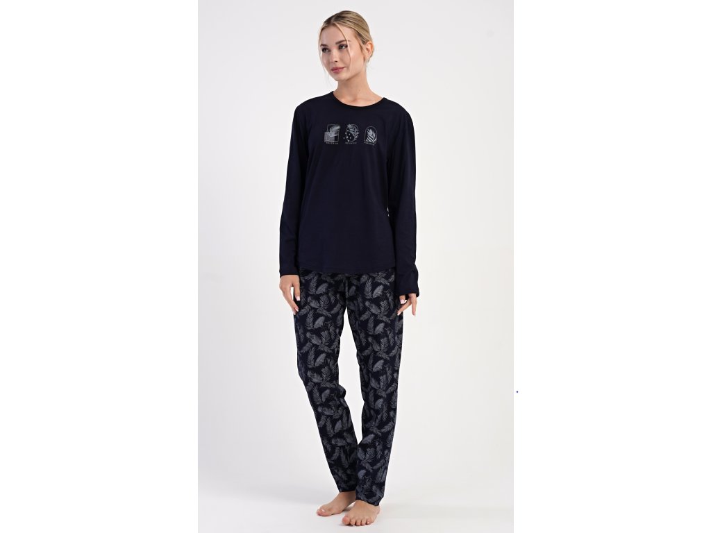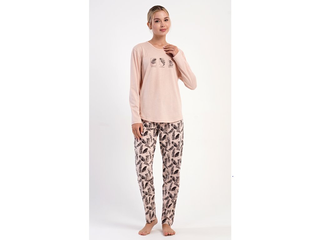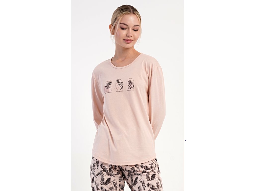 Dámske bavlnené dlhé pyžamo Isabela. Dámske pyžamo sa skladá z trička s dlhým rukávom a dlhých nohavíc. Tričko s výstrihom do V je na hrudi zdobené obrázkami vetvičiek a drobným nápisom. Motív vetvičiek sa opakuje aj na nohaviciach, ktoré majú v páse gumu a šnúrku na stiahnutie, nemajú vrecká. Použitý bavlnený materiál je poddajný a príjemný na dotyk.