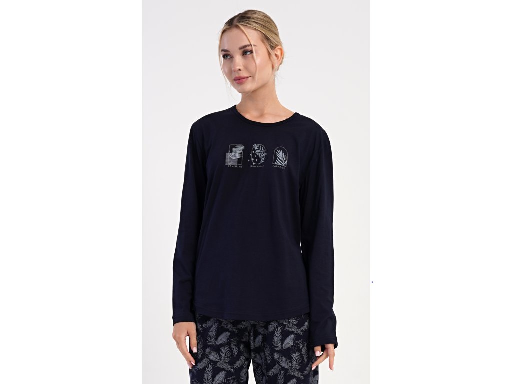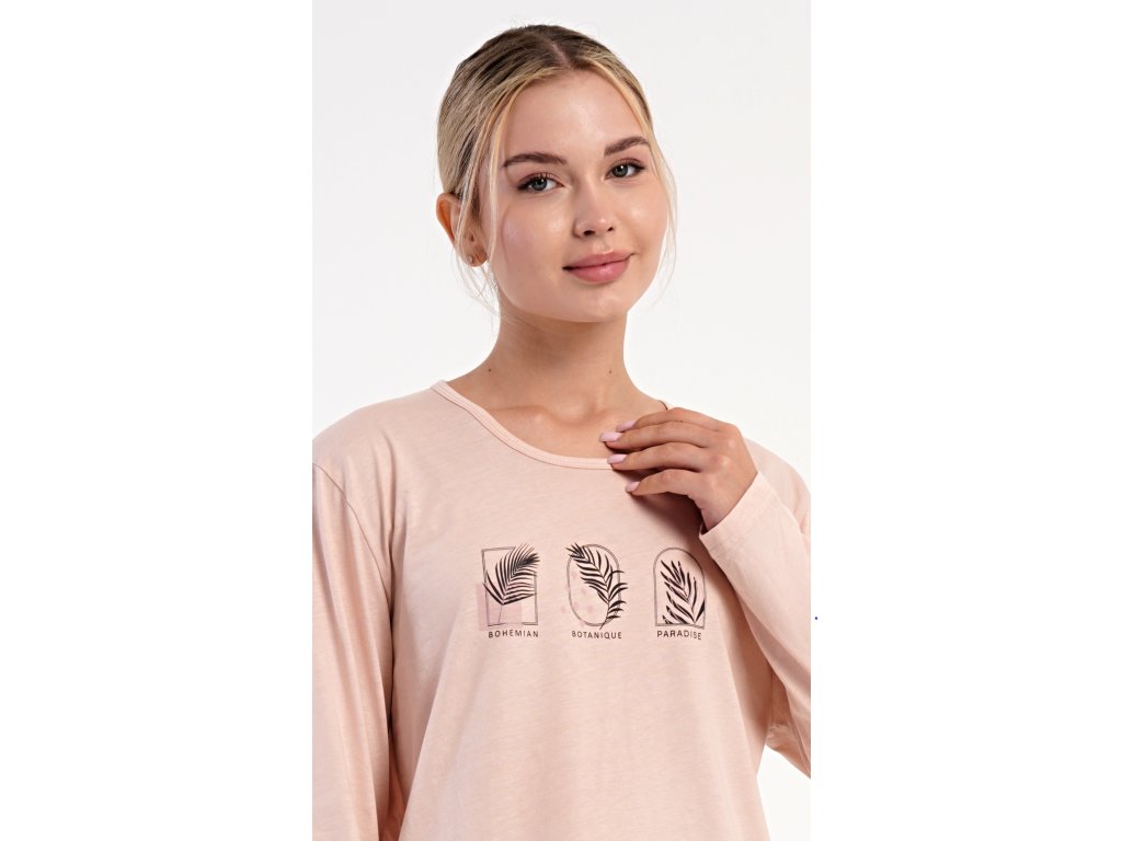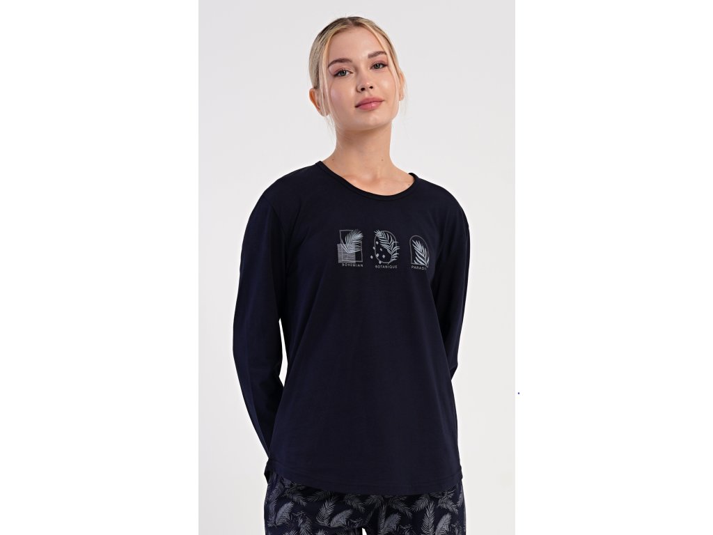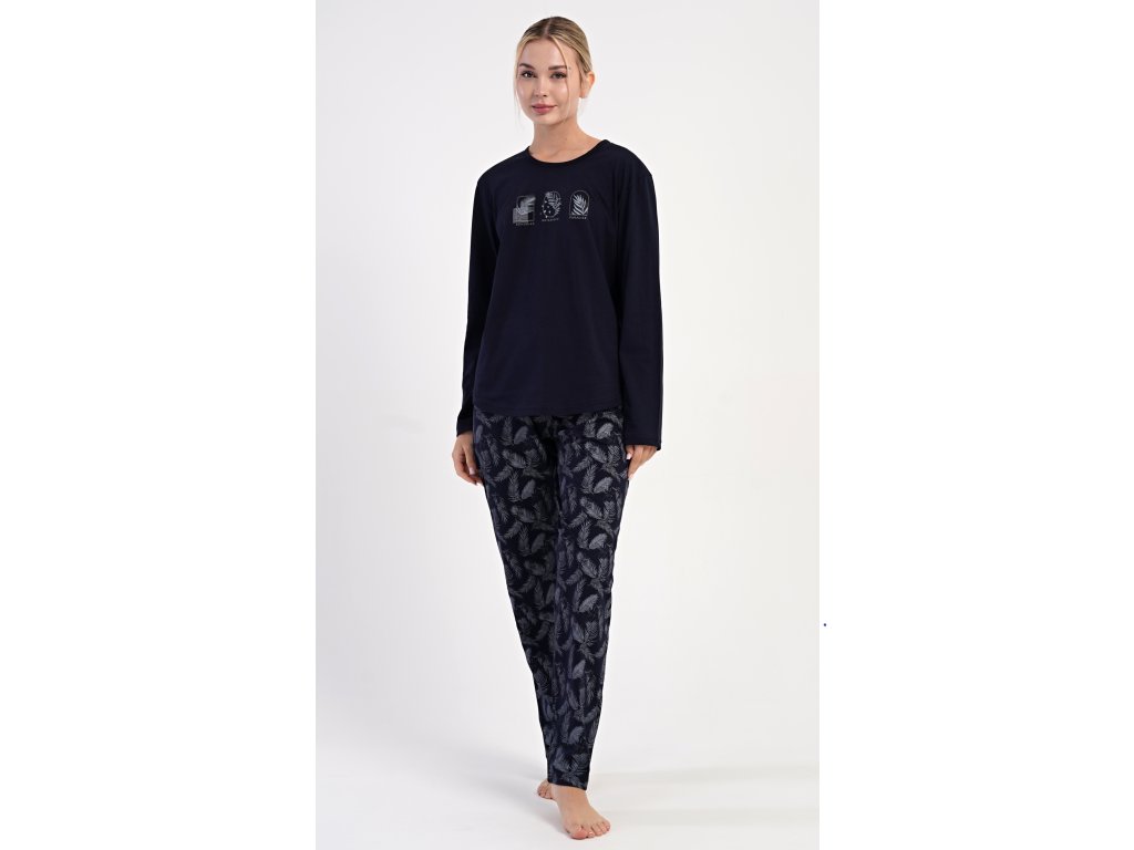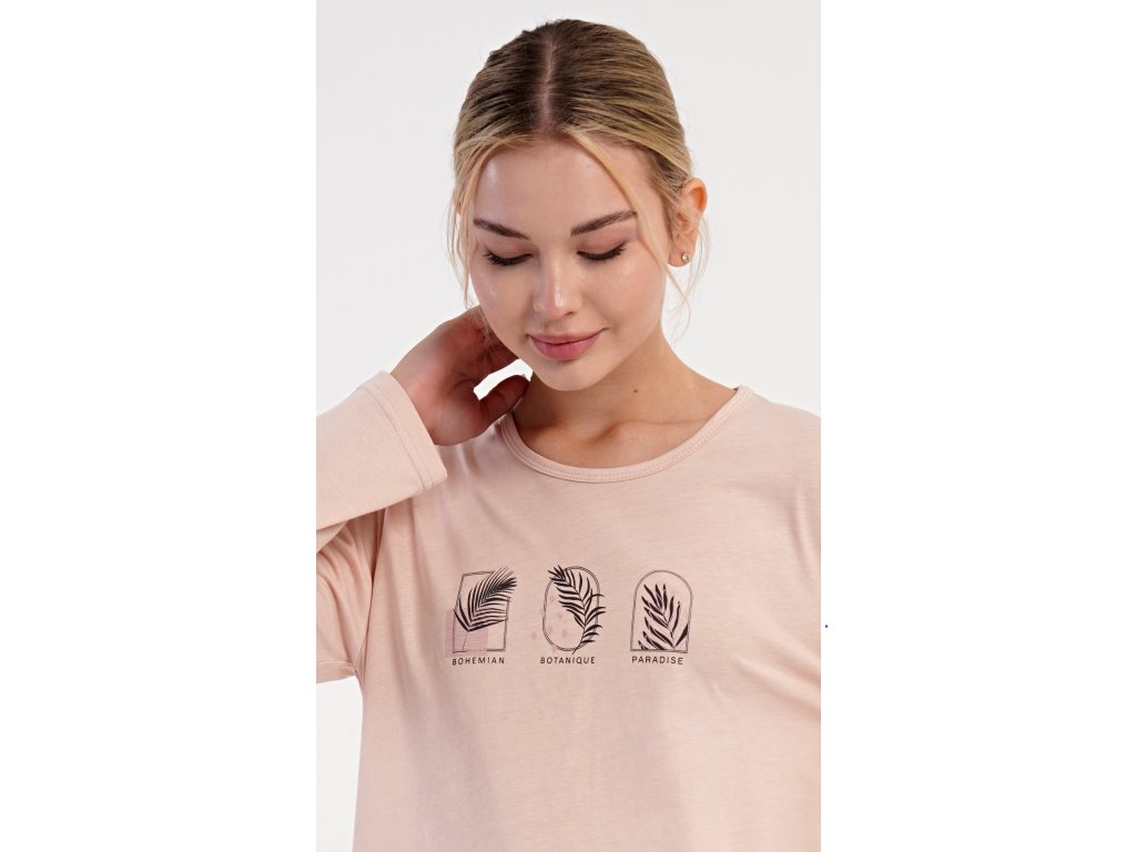Dámske bavlnené dlhé pyžamo Isabela. Dámske pyžamo sa skladá z trička s dlhým rukávom a dlhých nohavíc. Tričko s výstrihom do V je na hrudi zdobené obrázkami vetvičiek a drobným nápisom. Motív vetvičiek sa opakuje aj na nohaviciach, ktoré majú v páse gumu a šnúrku na stiahnutie, nemajú vrecká. Použitý bavlnený materiál je poddajný a príjemný na dotyk.