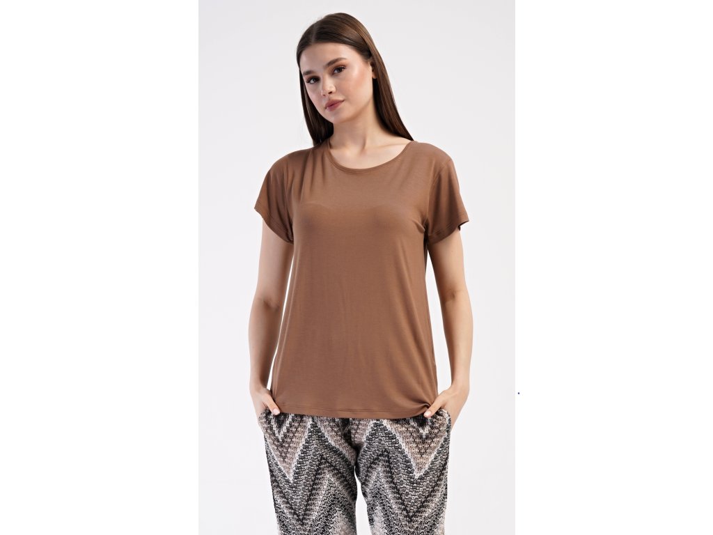 Dámske pyžamo s krátkym rukávom Julie. Dámske pyžamo sa skladá z trička s krátkym rukávom a dlhých nohavíc. Tričko je jednofarebné, bez potlače, má okrúhly výstrih. Nohavice potlačené geometrickým vzorom majú v páse gumu a šnúrku na stiahnutie, nemajú vrecká. Použitý viskózový materiál je poddajný a príjemný na dotyk.