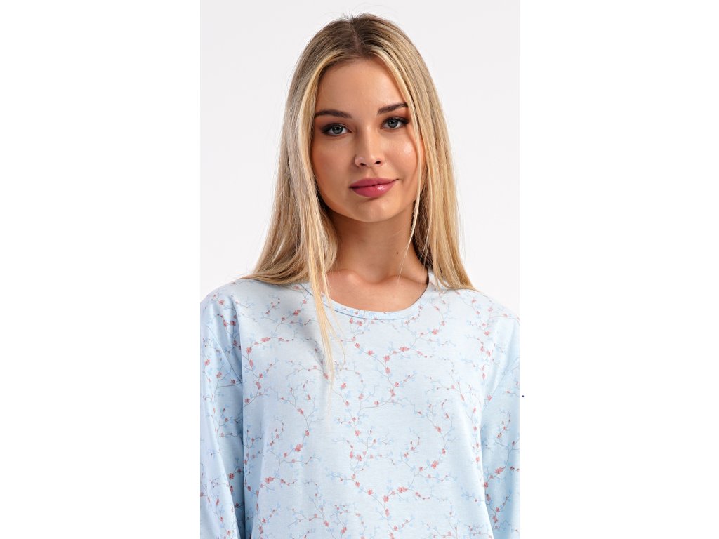 Dámske bavlnené dlhé pyžamo Lauren. Dámske pyžamo sa skladá z trička s dlhým rukávom a dlhých nohavíc. Tričko s okrúhlym výstrihom zdobia drobné kvety. Jednofarebné nohavice majú v páse gumu a šnúrku na stiahnutie, nemajú vrecká. Použitý bavlnený materiál je poddajný a príjemný na dotyk.
