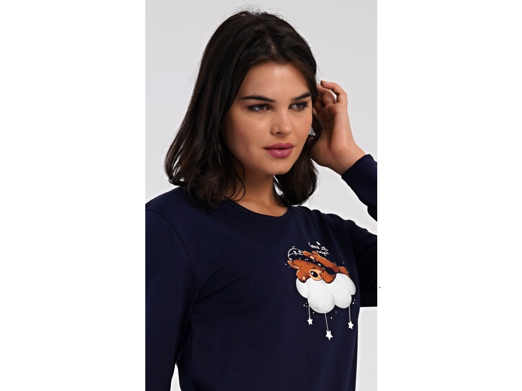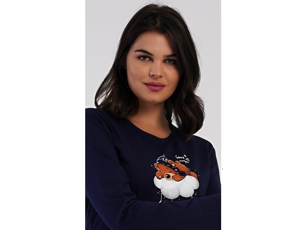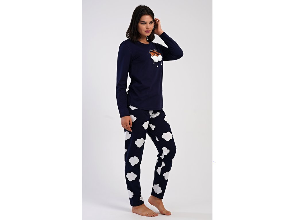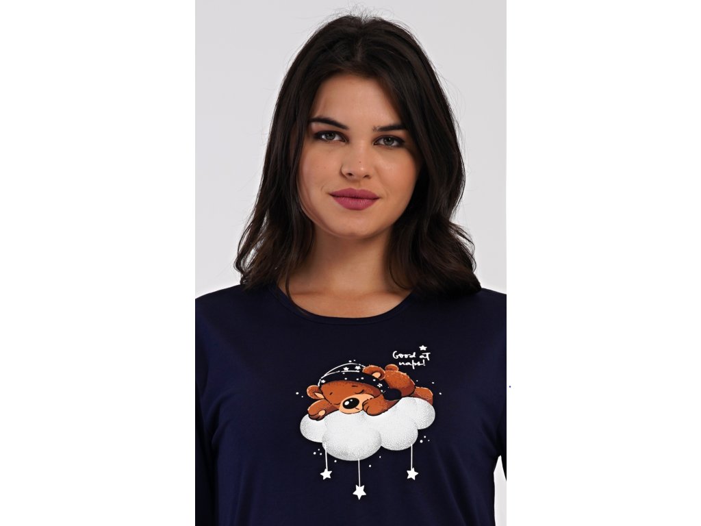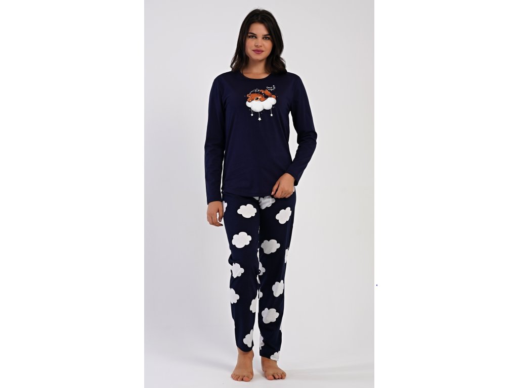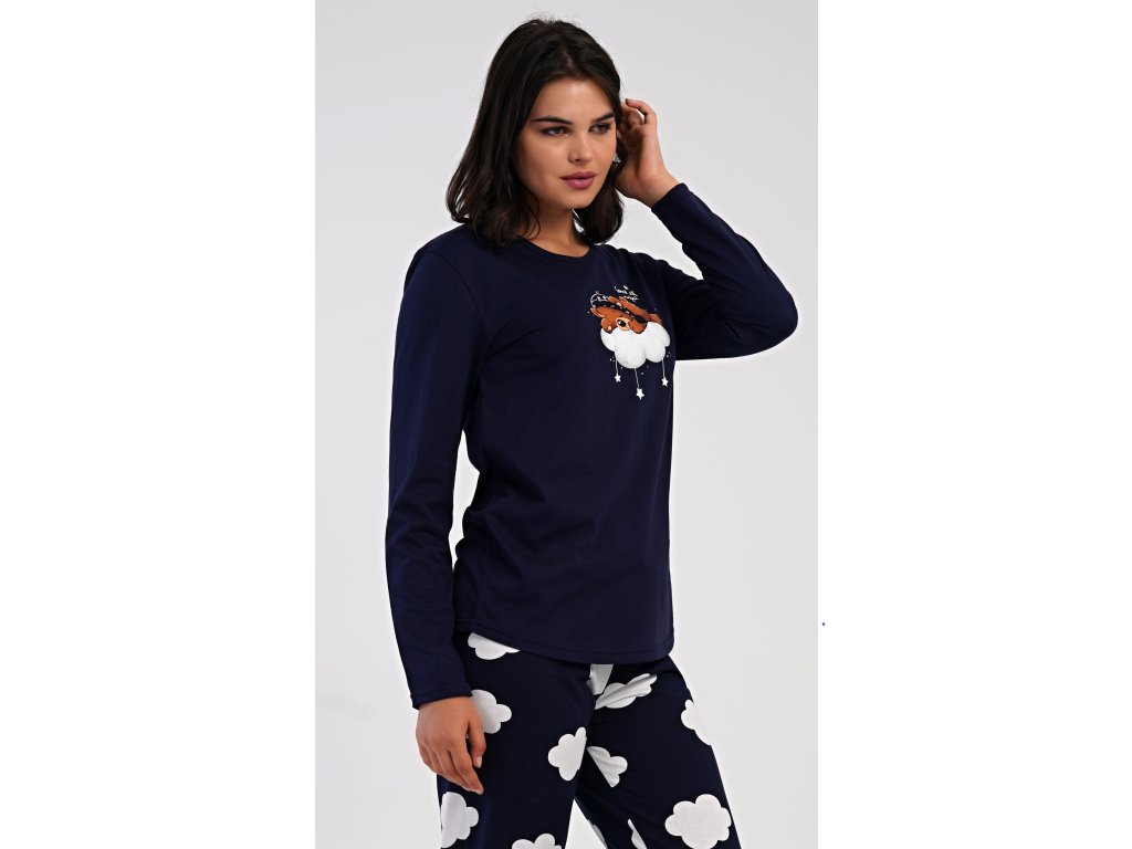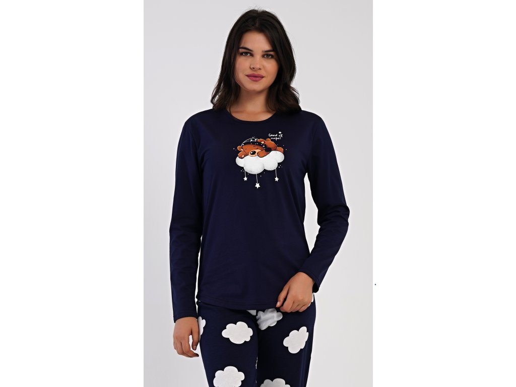 Dámske bavlnené dlhé pyžamo Méďa na obláčiku. Dámske pyžamo sa skladá z trička s dlhým rukávom a dlhých nohavíc. Jednofarebné tričko je ozdobené obrázkom medveďa na obláčiku. Tento motív sa opakuje aj na nohaviciach, ktoré majú v páse gumu a šnúrku na stiahnutie, nemajú vrecká. Použitý bavlnený materiál je poddajný a príjemný na dotyk.