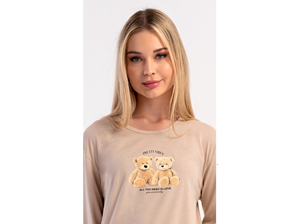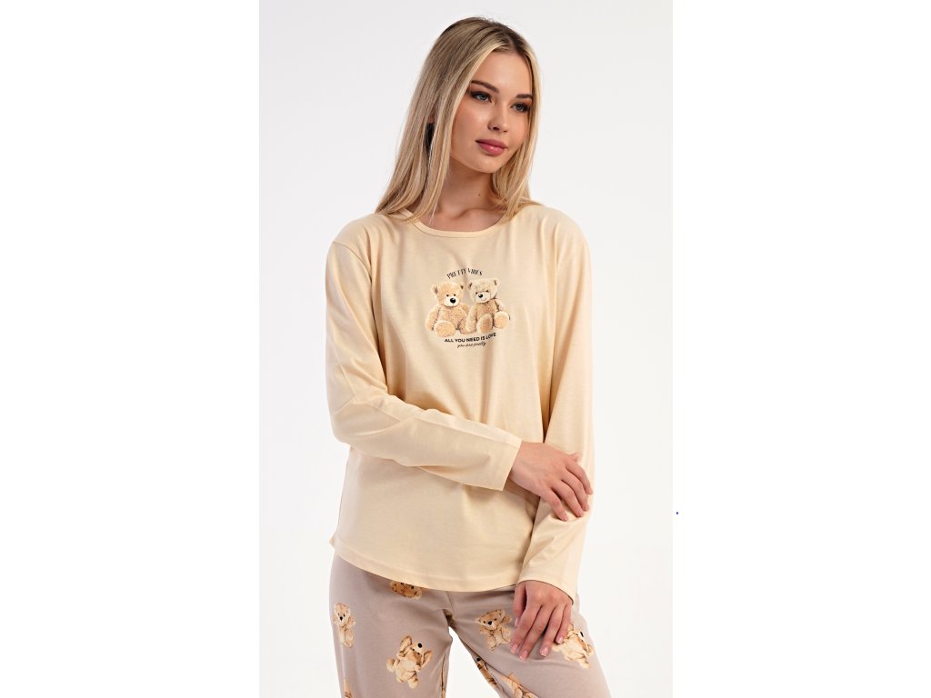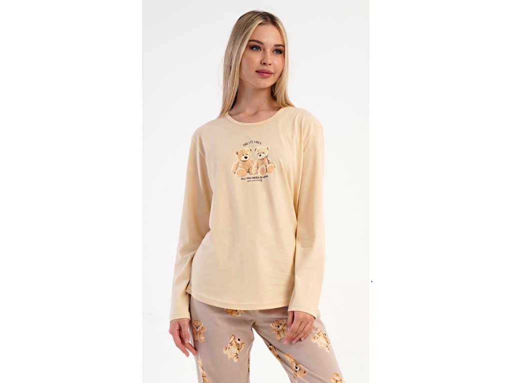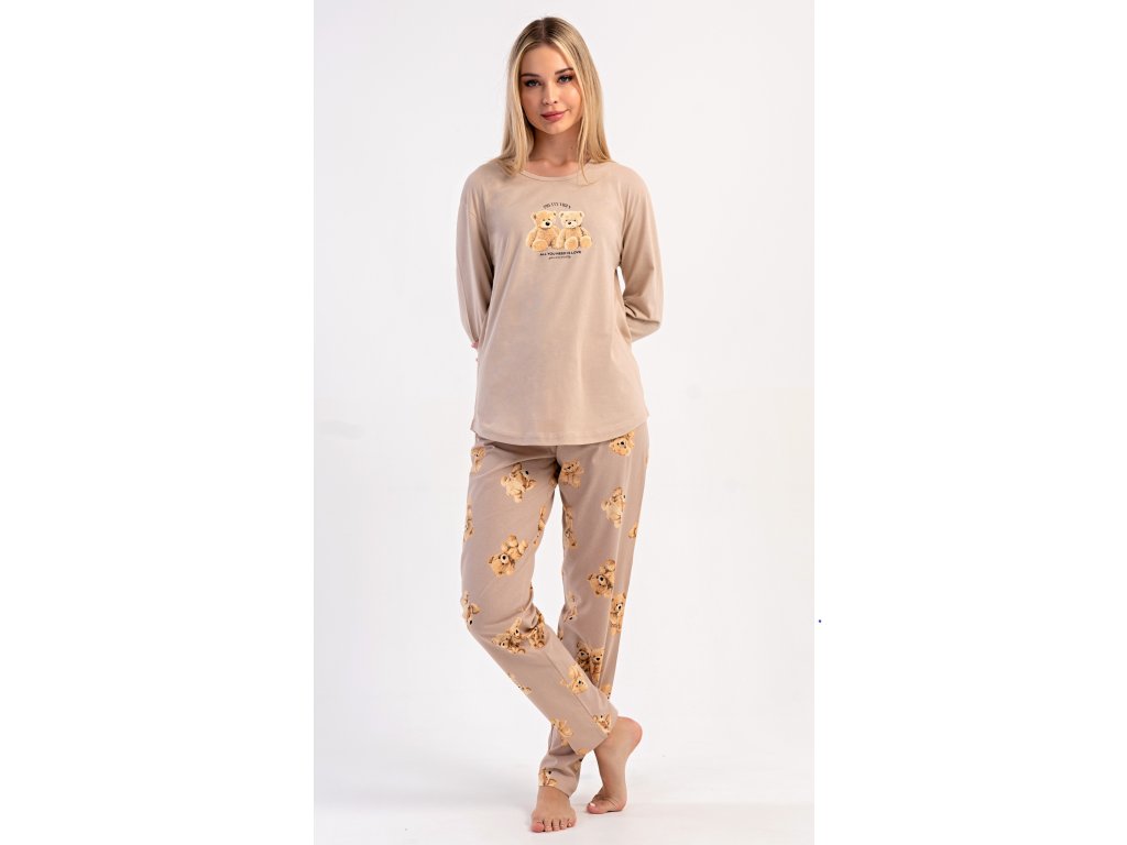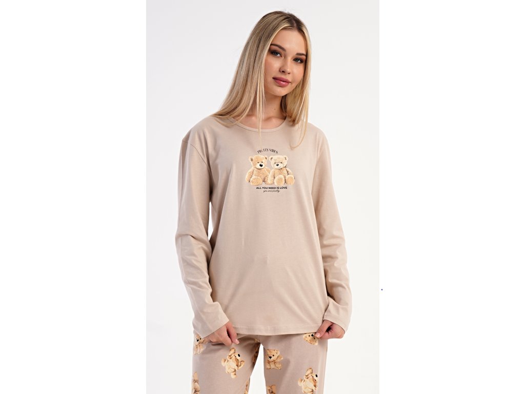 Dámske bavlnené dlhé pyžamo Monika. Dámske pyžamo sa skladá z trička s dlhým rukávom a dlhých nohavíc. Tričko s okrúhlym výstrihom je na hrudi zdobené obrázkom plyšových medveďov. Tento motív sa opakuje aj na nohaviciach, ktoré majú v páse gumu a šnúrku na stiahnutie, nemajú vrecká. Použitý bavlnený materiál je poddajný a príjemný na dotyk.