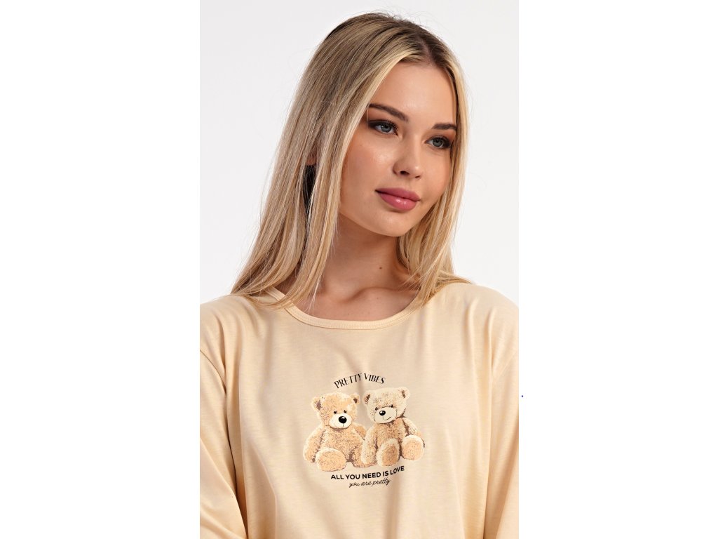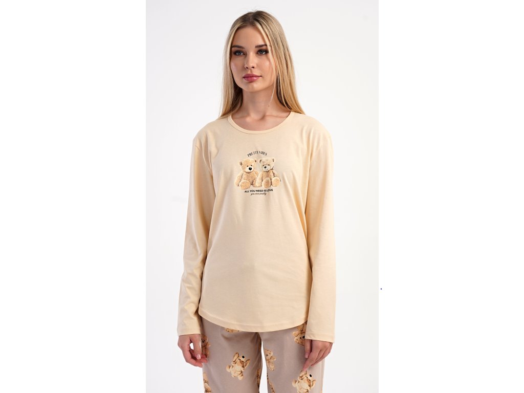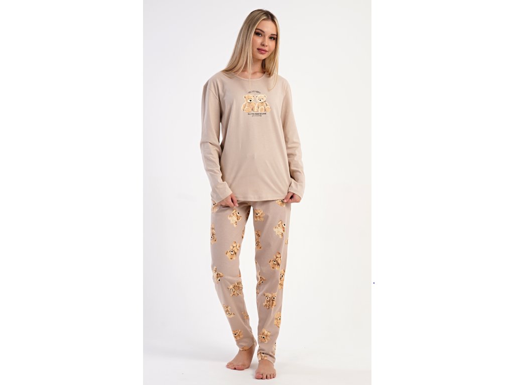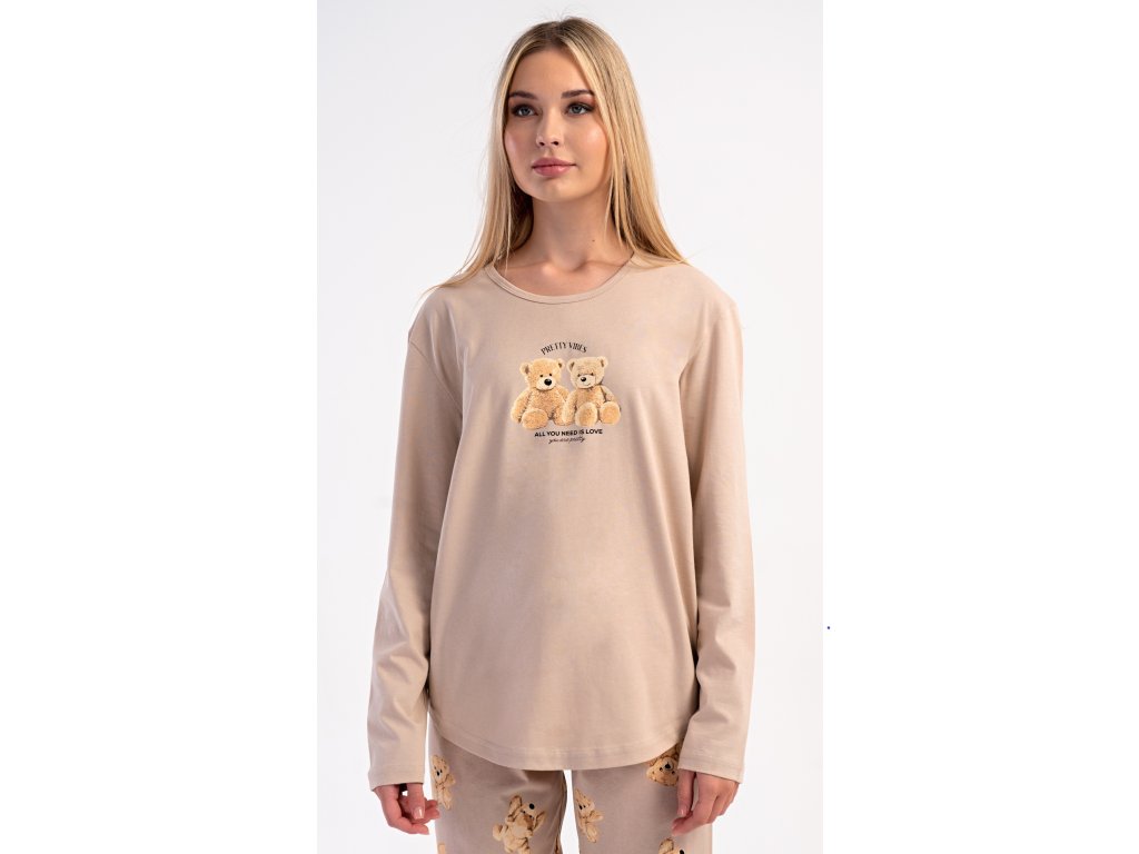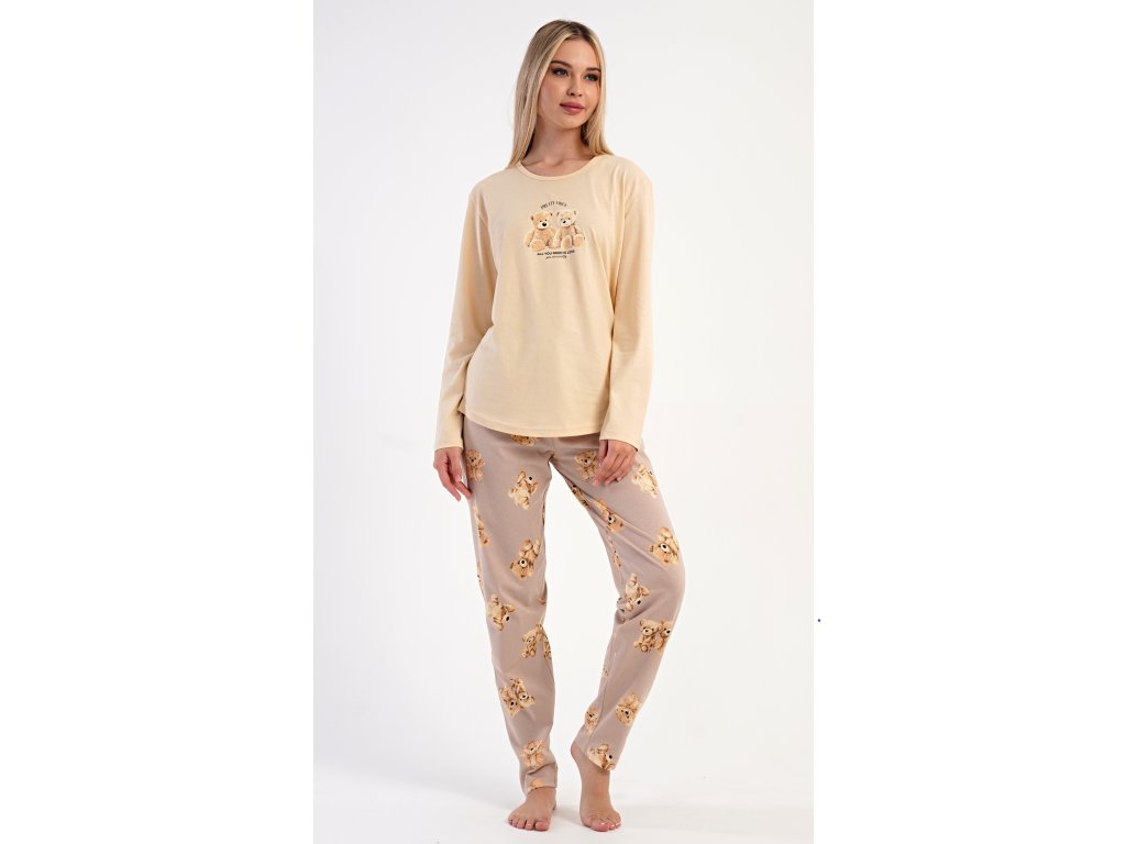 Dámske bavlnené dlhé pyžamo Monika. Dámske pyžamo sa skladá z trička s dlhým rukávom a dlhých nohavíc. Tričko s okrúhlym výstrihom je na hrudi zdobené obrázkom plyšových medveďov. Tento motív sa opakuje aj na nohaviciach, ktoré majú v páse gumu a šnúrku na stiahnutie, nemajú vrecká. Použitý bavlnený materiál je poddajný a príjemný na dotyk.