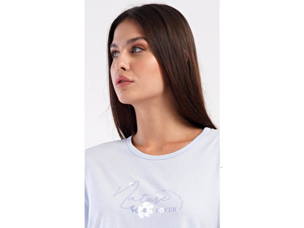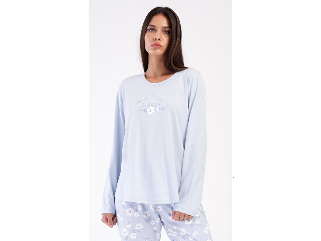 Dámske bavlnené dlhé pyžamo Nature lover. Dámske pyžamo sa skladá z trička s dlhým rukávom a dlhých nohavíc. Tričko je jednofarebné, zdobené obrázkom s kvetinovým motívom. Kvetinová potlač sa opakuje aj na nohaviciach, ktoré majú v páse gumu a šnúrku na stiahnutie, nemajú vrecká. Použitý bavlnený materiál je poddajný a príjemný na dotyk.