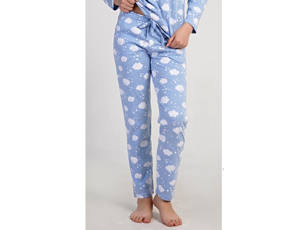 Dámske dlhé pyžamo Obláčik. Dámske pyžamo sa skladá z trička s dlhým rukávom a dlhých nohavíc. Tričko je potlačené obláčikmi a hviezdičkami. Táto potlač sa opakuje aj na nohaviciach, ktoré majú v páse gumu a šnúrku na stiahnutie, nemajú vrecká. Použitý materiál s obsahom bavlny 70% je poddajný a príjemný na dotyk.