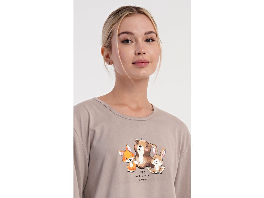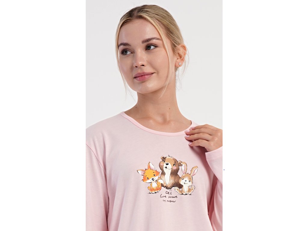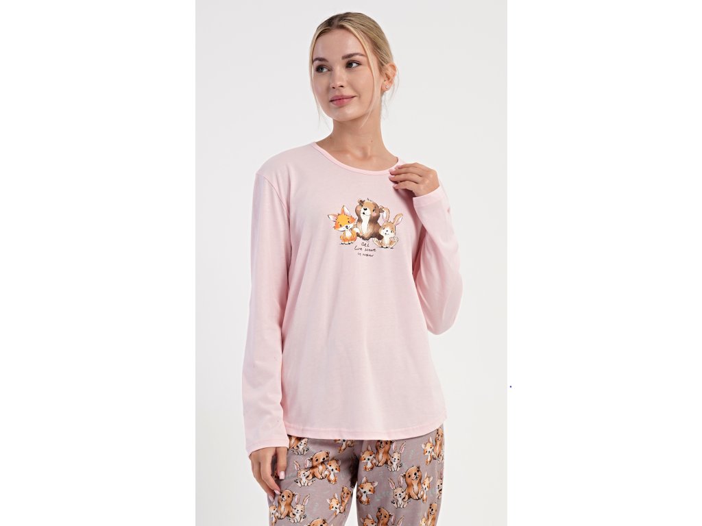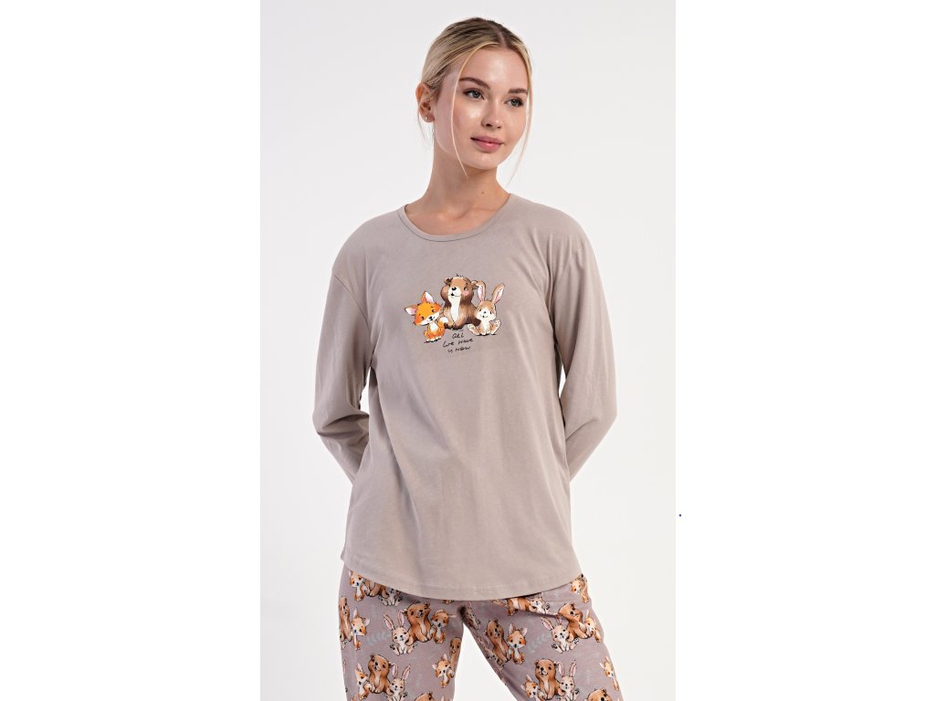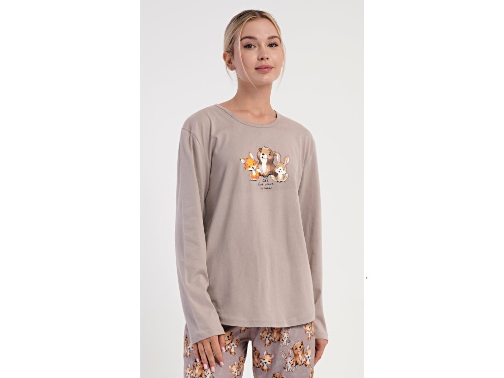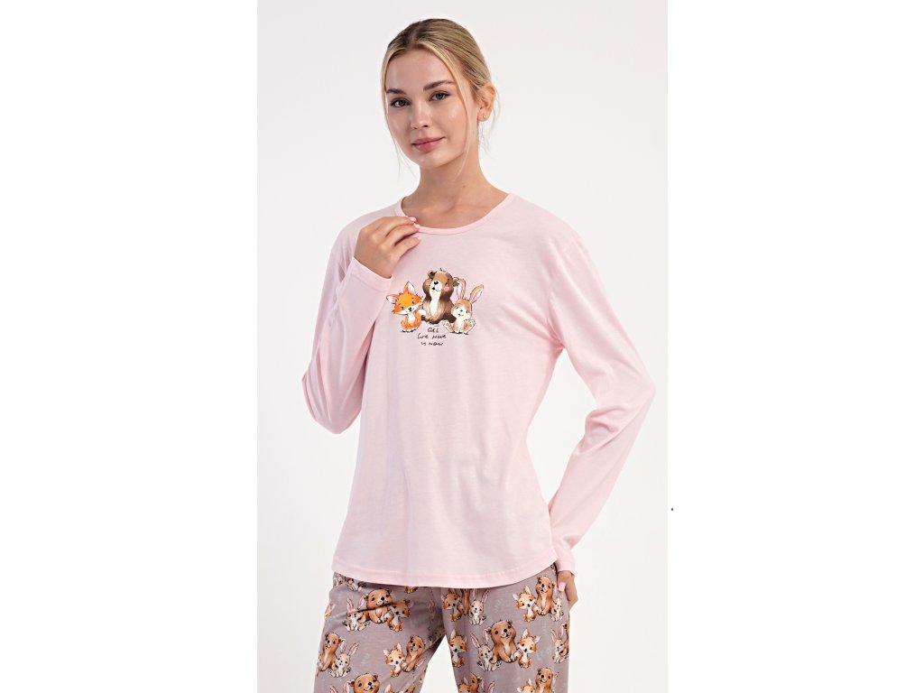 Dámske bavlnené dlhé pyžamo Olivia. Dámske pyžamo sa skladá z trička s dlhým rukávom a dlhých nohavíc. Jednofarebné tričko zdobí na hrudi obrázok malé líšky, šteňaťa a zajačika. Tento motív sa opakuje aj na nohaviciach, ktoré majú v páse gumu a šnúrku na stiahnutie, nemajú vrecká. Použitý bavlnený materiál je poddajný a príjemný na dotyk.
