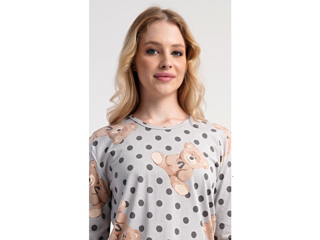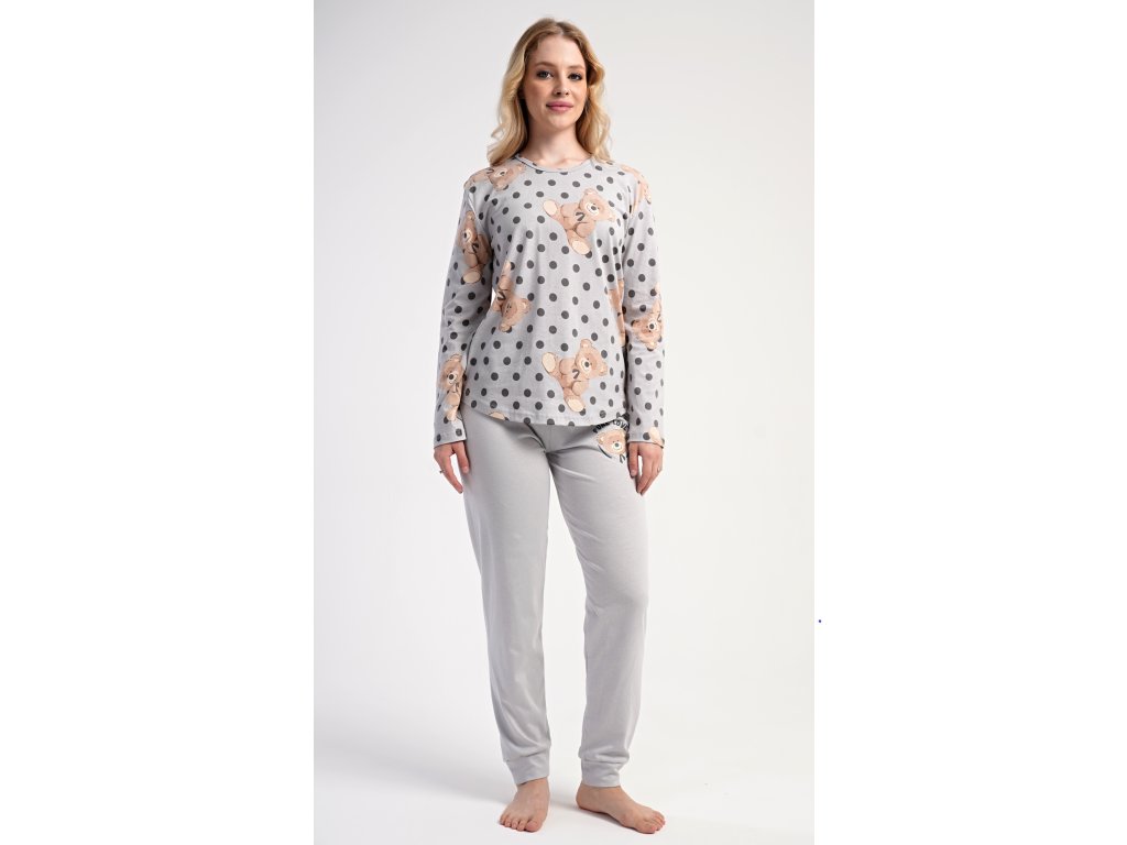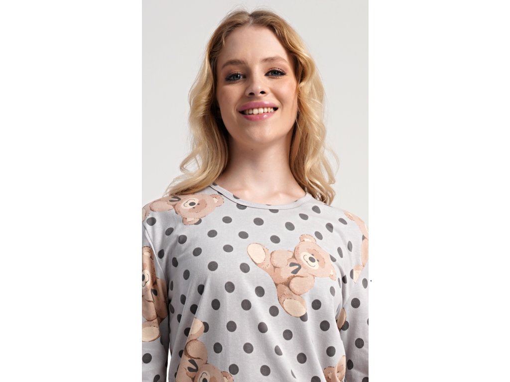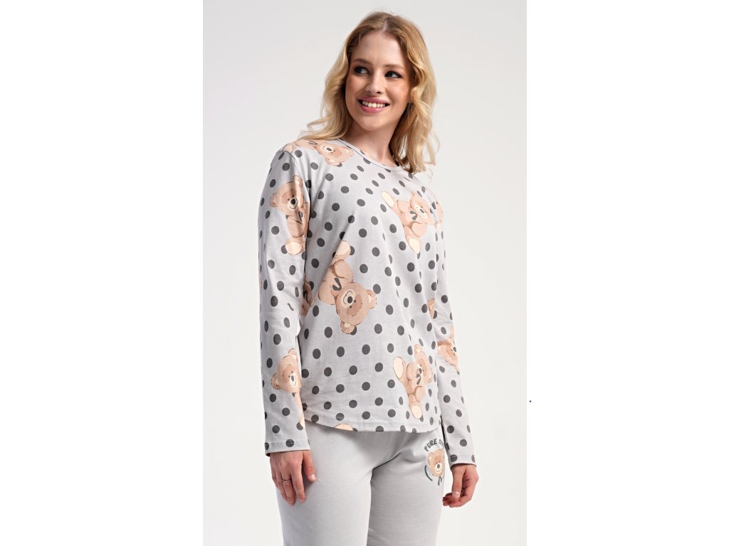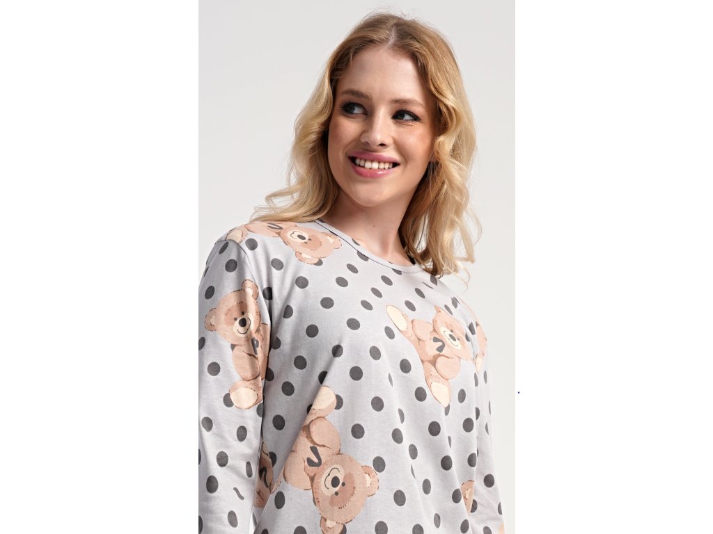 Dámske bavlnené dlhé pyžamo Paula. Dámske pyžamo sa skladá z trička s dlhým rukávom a dlhých nohavíc. Jednofarebné tričko je ozdobené obrázkom medveďov. Tento motív sa opakuje aj na nohaviciach, ktoré majú v páse gumu a šnúrku na stiahnutie, nemajú vrecká. Použitý bavlnený materiál je poddajný a príjemný na dotyk.