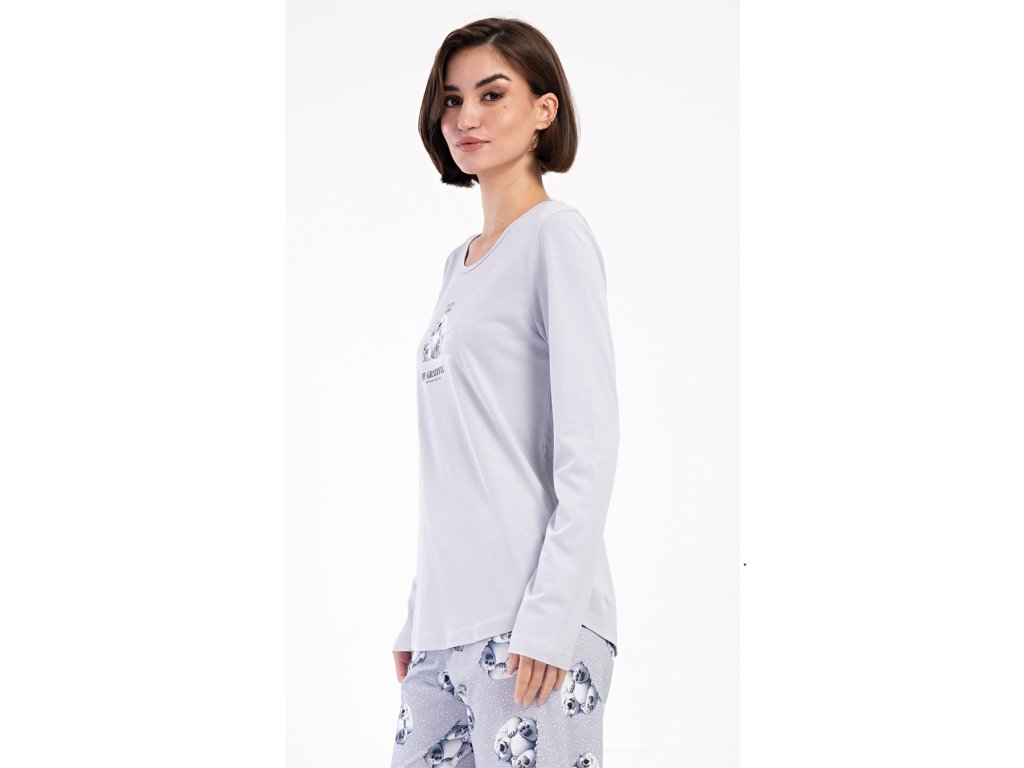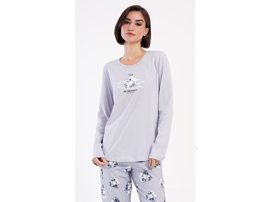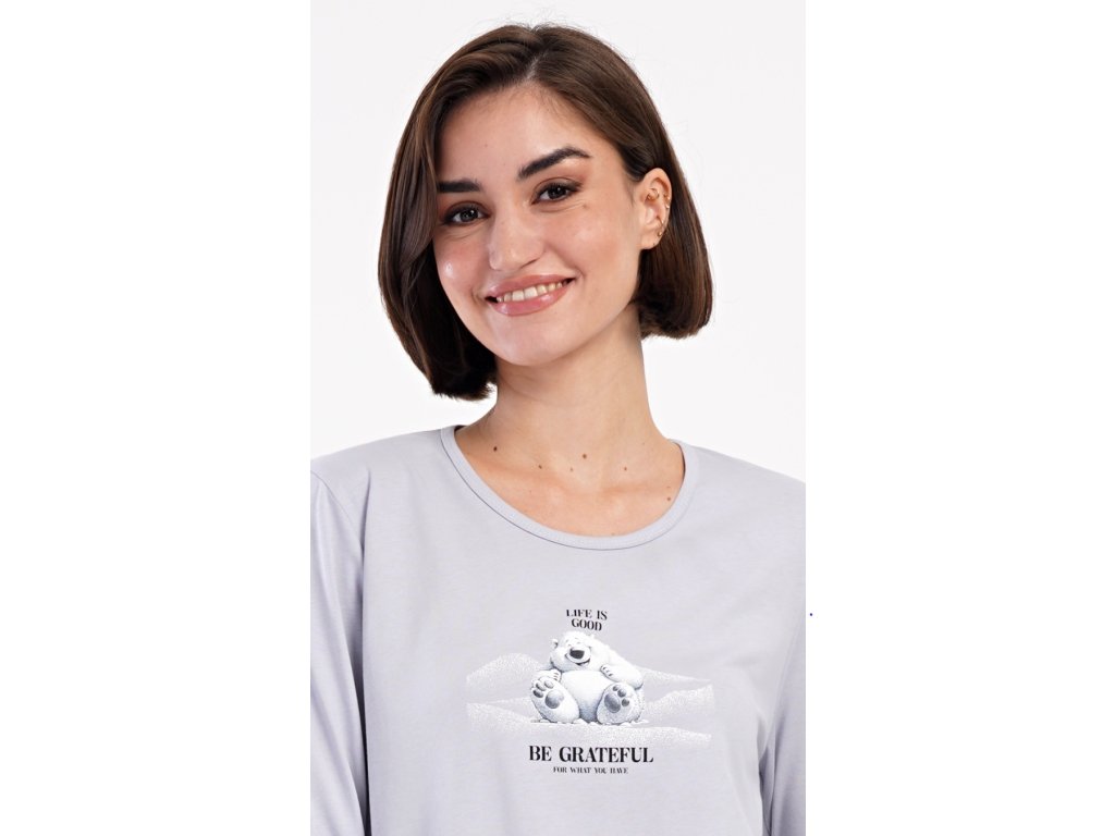 Dámske bavlnené dlhé pyžamo Polar bear. Dámske pyžamo sa skladá z trička s dlhým rukávom a dlhých nohavíc. Tričko je jednofarebné, zdobené obrázkom veselého ľadového medveďa a nápisom 'Be grateful'. Obrázky medveďov sa opakujú aj na nohaviciach, ktoré majú v páse gumu a šnúrku na stiahnutie, nemajú vrecká. Použitý bavlnený materiál je poddajný a príjemný na dotyk.