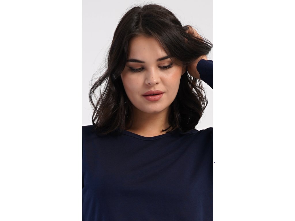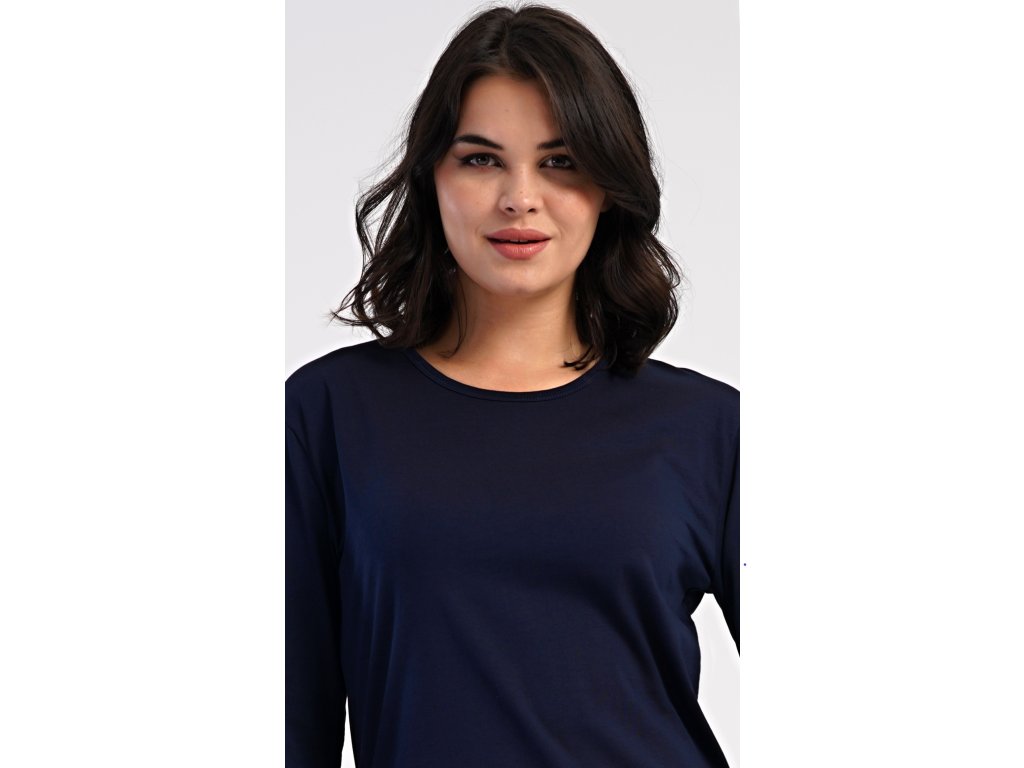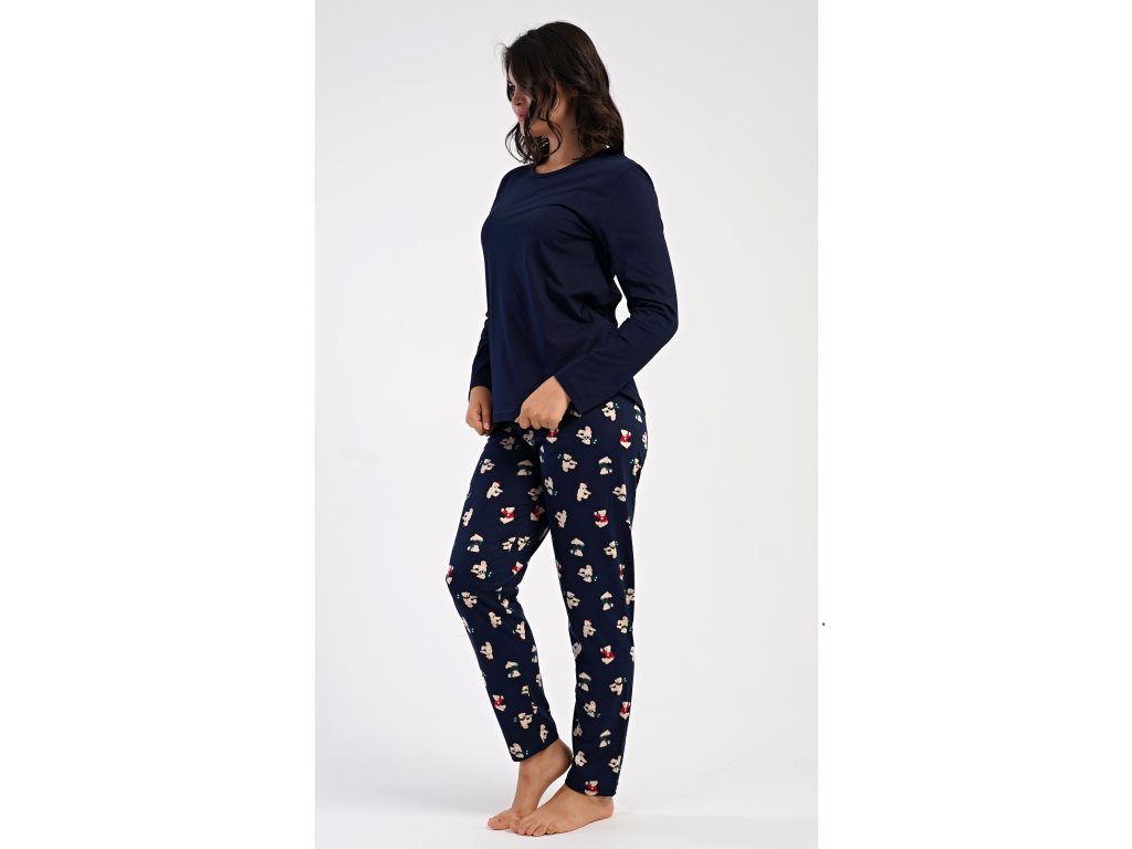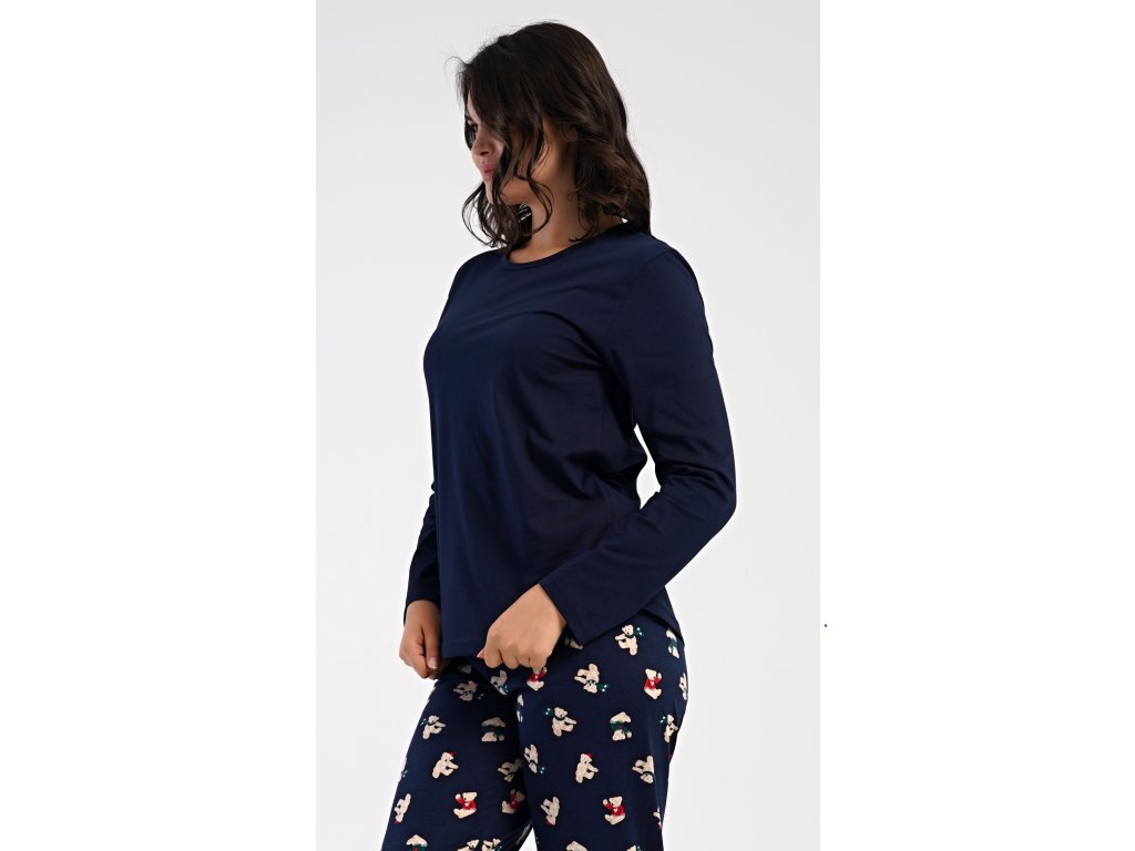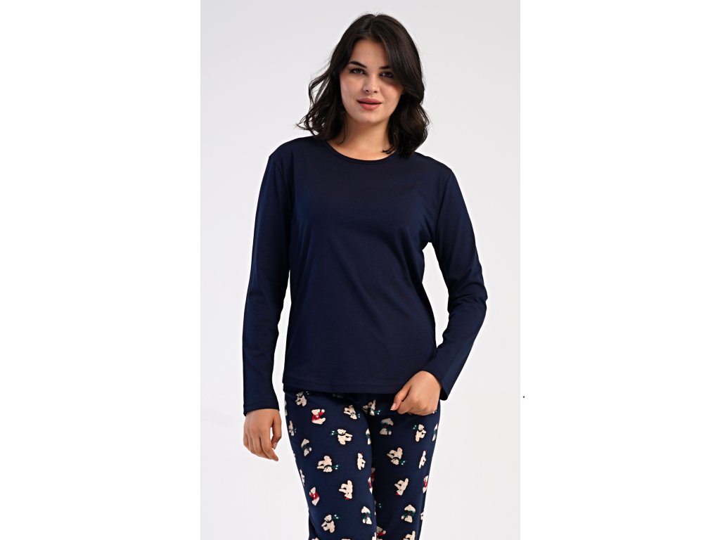 Dámske bavlnené dlhé pyžamo Sabrina. Dámske pyžamo sa skladá z trička s dlhým rukávom a dlhých nohavíc. Tričko je jednofarebné, bez potlače, má okrúhly výstrih. Nohavice s potlačou medvedíkov majú v páse gumu a šnúrku na stiahnutie, nemajú vrecká. Použitý bavlnený materiál je poddajný a príjemný na dotyk.
