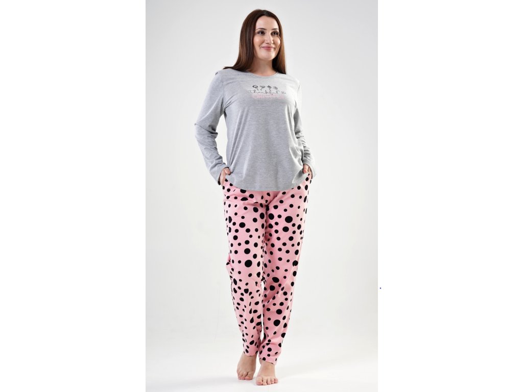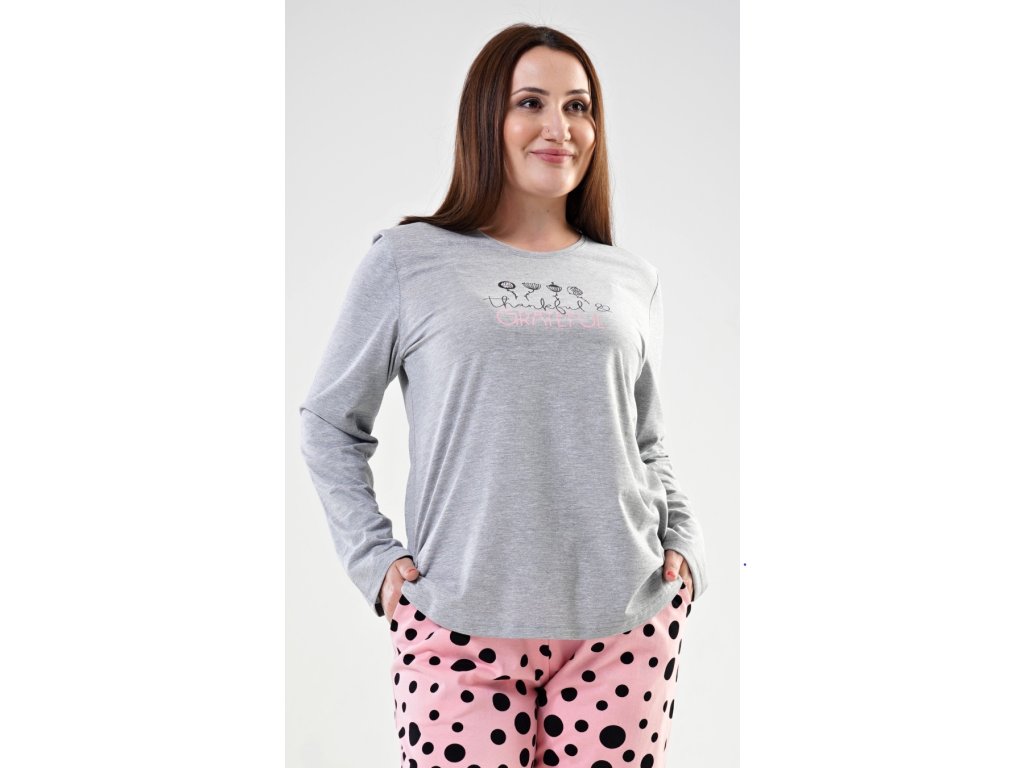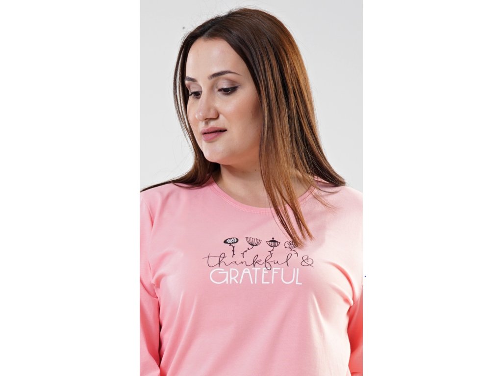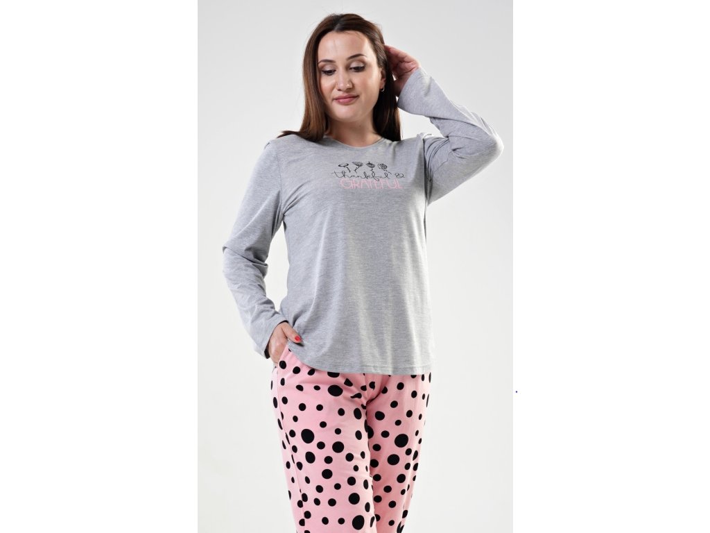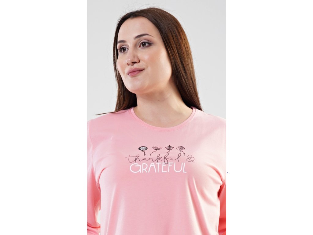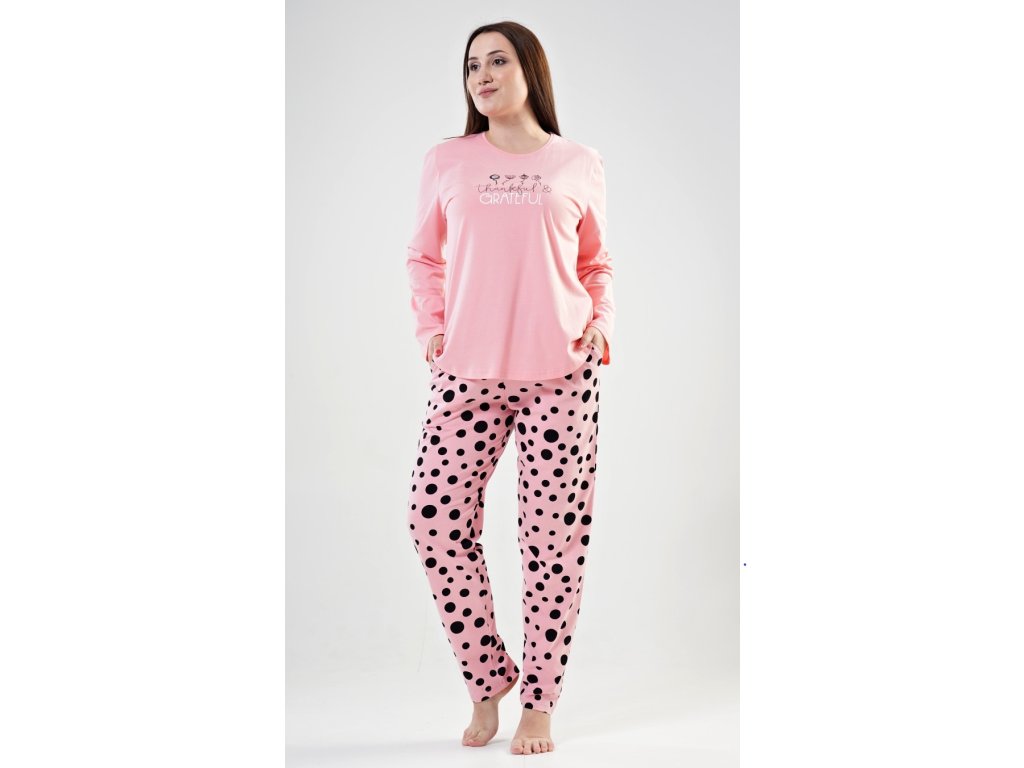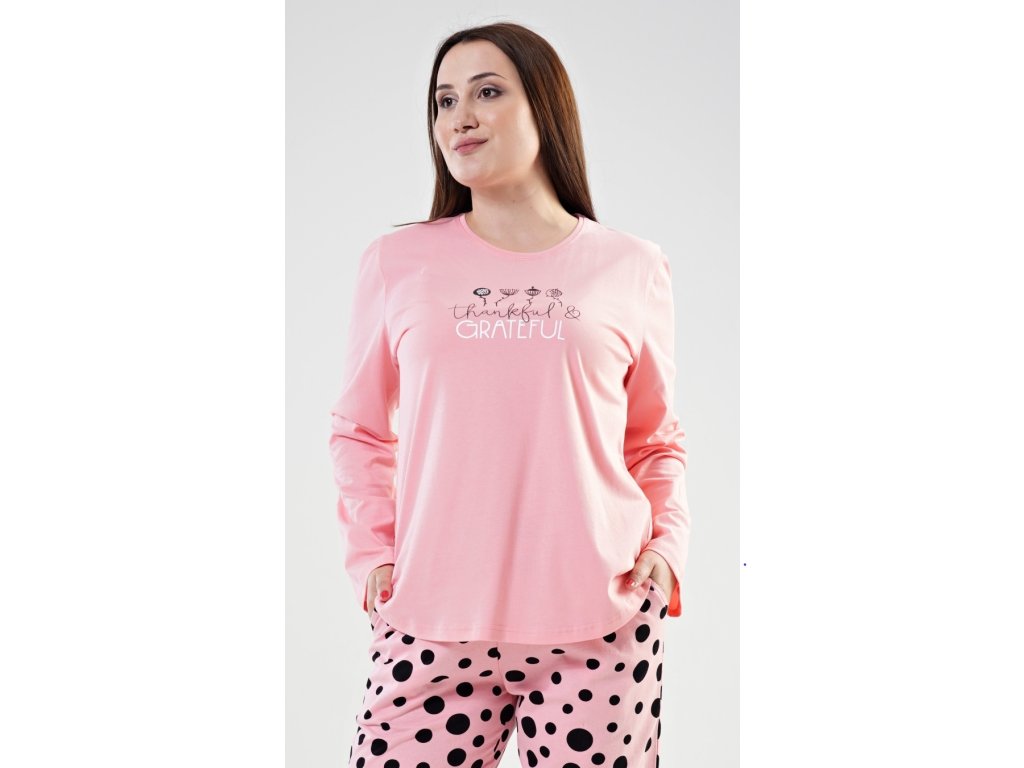 Dámske pyžamo dlhé Simona. Dámske pyžamo sa skladá z tričká s dlhým rukávom a dlhých nohavíc. Tričko je jednofarebné, zdobené potlačou kvetov a nápisom 'Thankful and grateful'. Nohavice sú svetlo lososové, potlačené čiernymi bodkami. Nohavice sú do gumy, na stiahnutie šnúrkou a majú vrecká. Použitý materiál je poddajný a jemný na dotyk.