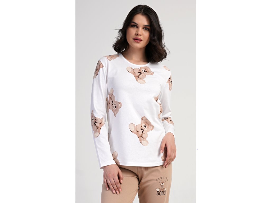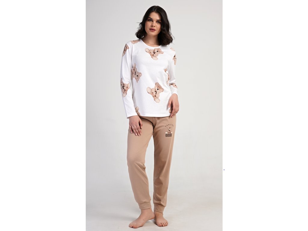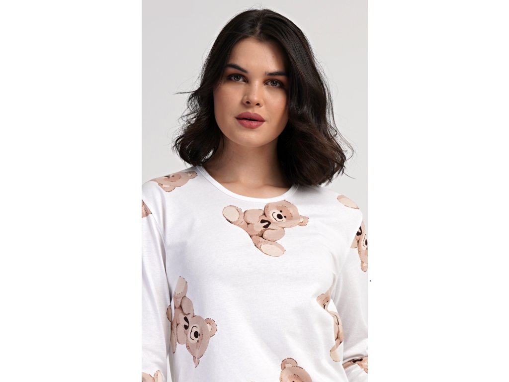 Dámske bavlnené dlhé pyžamo Teddy bear. Dámske pyžamo sa skladá z trička s dlhým rukávom a dlhých nohavíc. Tričko je potlačené plyšovými medvedíkmi. Tento motív sa opakuje aj na nohaviciach, ktoré majú v páse gumu a šnúrku na stiahnutie, nemajú vrecká. Použitý bavlnený materiál je poddajný a príjemný na dotyk.