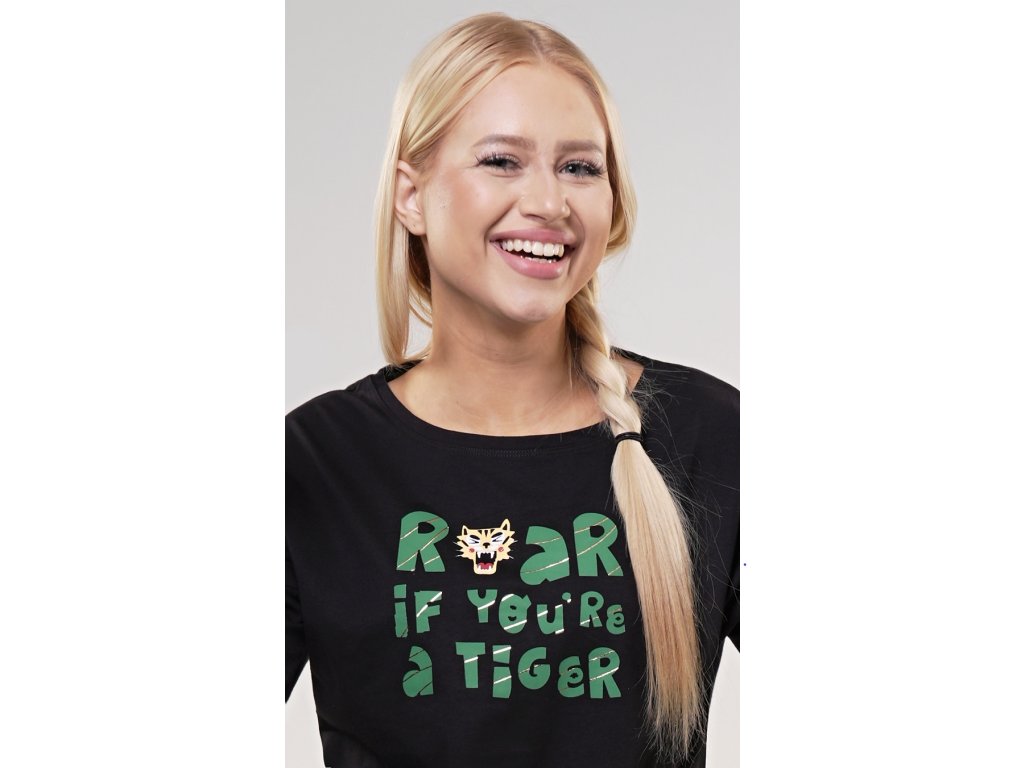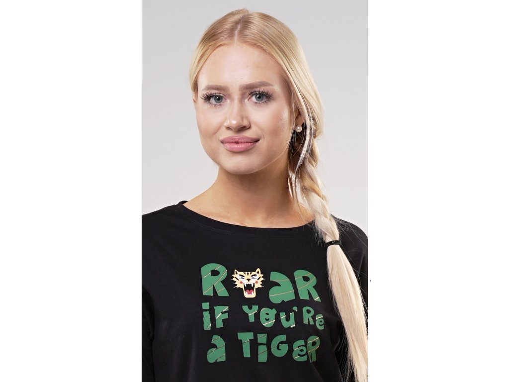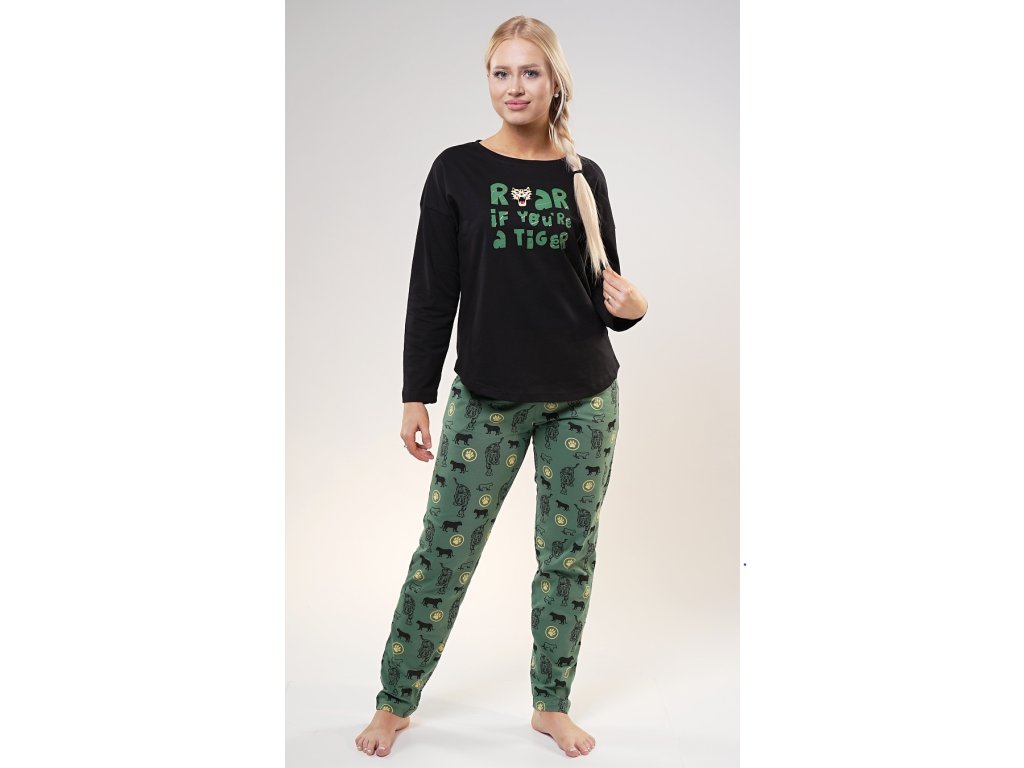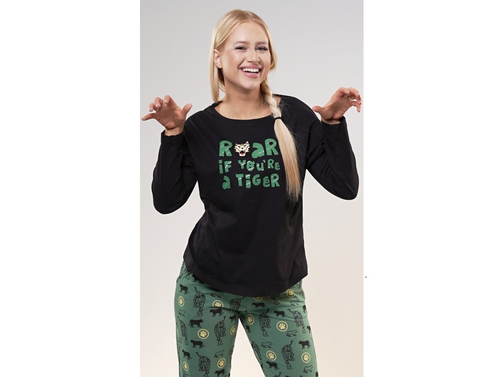 Dámske bavlnené pyžamo dlhé Tiger. Dámske pyžamo sa skladá z trička s dlhým rukávom a dlhých nohavíc. Tričko je jednofarebné, zdobené obrázkom tigra a nápisom. Tigrie motív sa opakuje aj na nohaviciach, ktoré majú v páse gumu, šnúrku na stiahnutie a praktické vrecká. Použitý bavlnený materiál je poddajný a príjemný na dotyk.