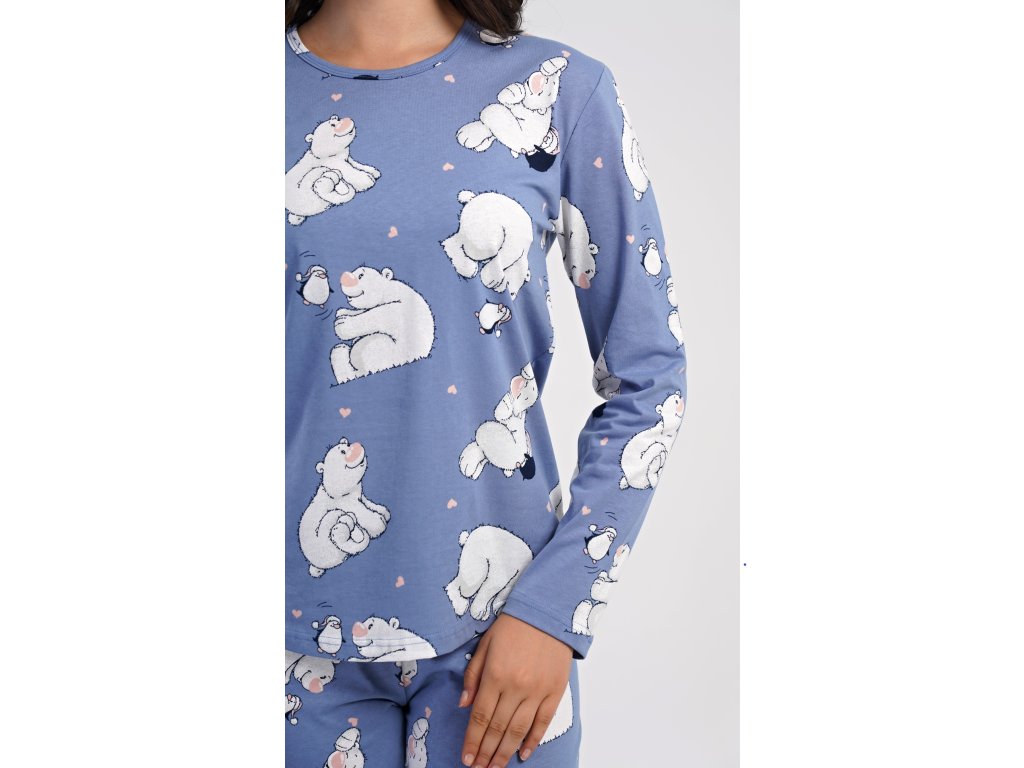 Dámske bavlnené dlhé pyžamo Tučniak a medvedík. Dámske pyžamo sa skladá z trička s dlhým rukávom a dlhých nohavíc. Tričko s okrúhlym výstrihom je ozdobené obrázkami ľadových medveďov. Tento motív sa opakuje aj na nohaviciach, ktoré majú v páse gumu a šnúrku na stiahnutie, nemajú vrecká. Použitý bavlnený materiál je poddajný a príjemný na dotyk.