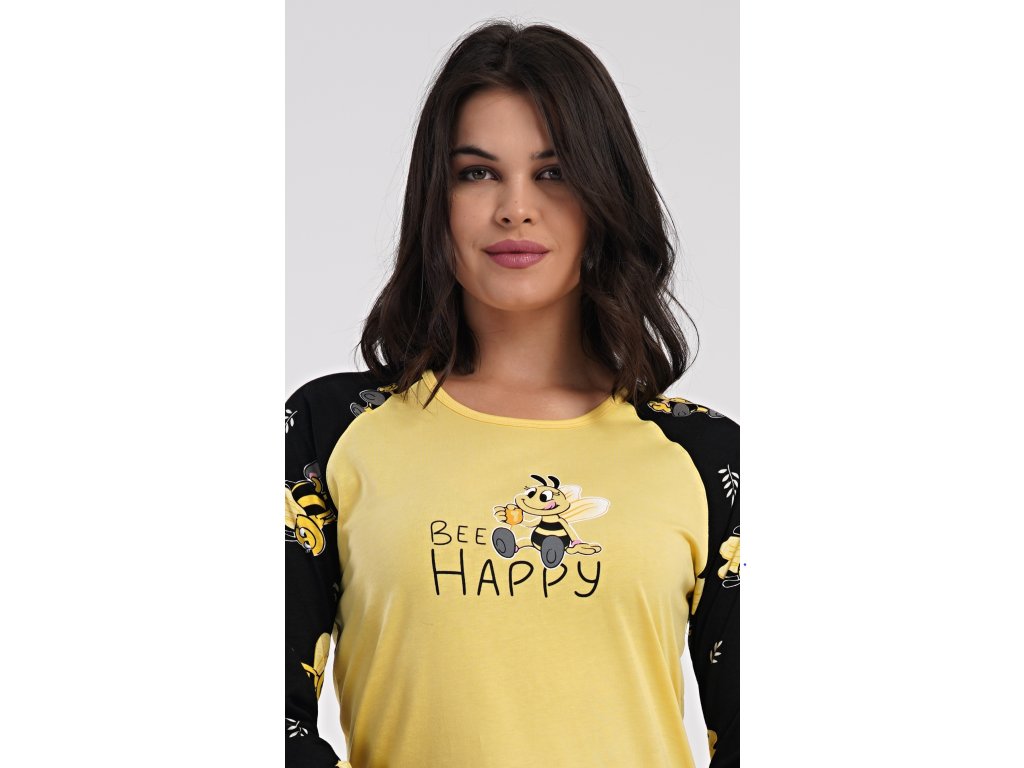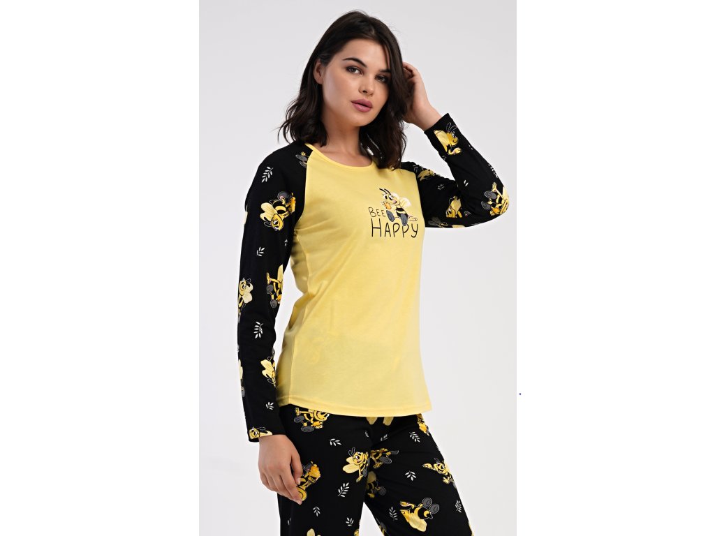 Dámske bavlnené dlhé pyžamo Včielka. Dámske pyžamo sa skladá z trička s dlhým rukávom a dlhých nohavíc. Tričko s okrúhlym výstrihom je na hrudi zdobené obrázkom včielky. Tento motív sa opakuje aj na nohaviciach, ktoré majú v páse gumu a šnúrku na stiahnutie, nemajú vrecká. Použitý bavlnený materiál je poddajný a príjemný na dotyk.
