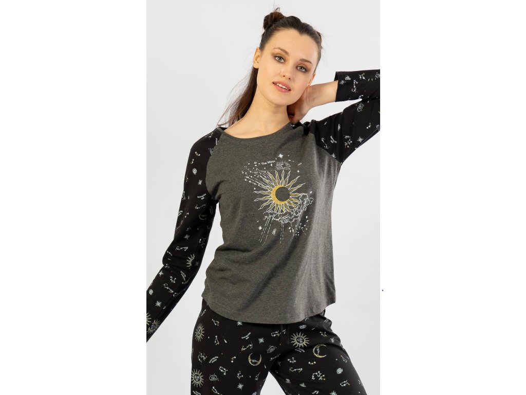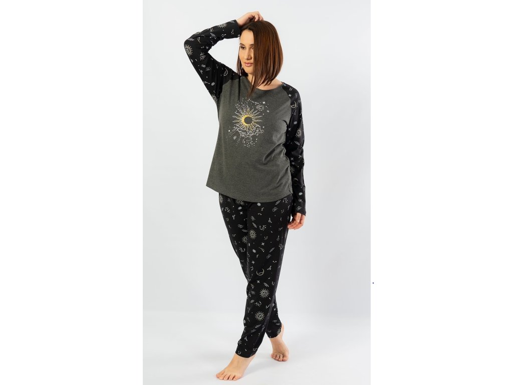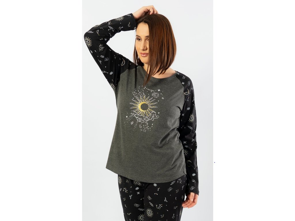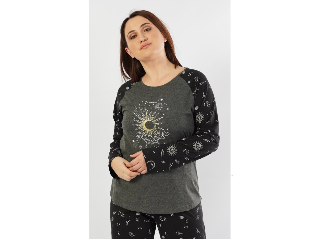 Dámske pyžamo dlhé Vesmír. Dámske pyžamo sa skladá z dlhých nohavíc a tričká s dlhým rukávom. Pyžamo je ozvláštnené potlačou astrologických a astronomických motívov, ktorým dominuje veľký mesiac. Pyžamové nohavice majú v páse gumu a šnúrku na stiahnutie, nemajú vrecká. Použitý materiál je poddajný a príjemný na dotyk. Tričko aj nohavice sú zložené zo 70% bavlnou.