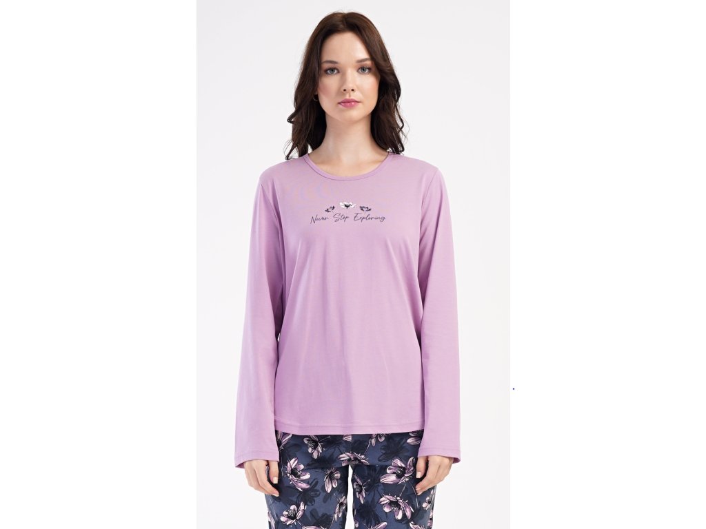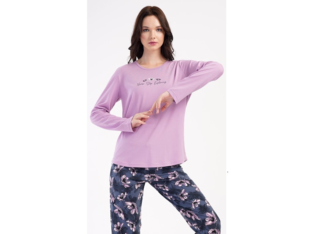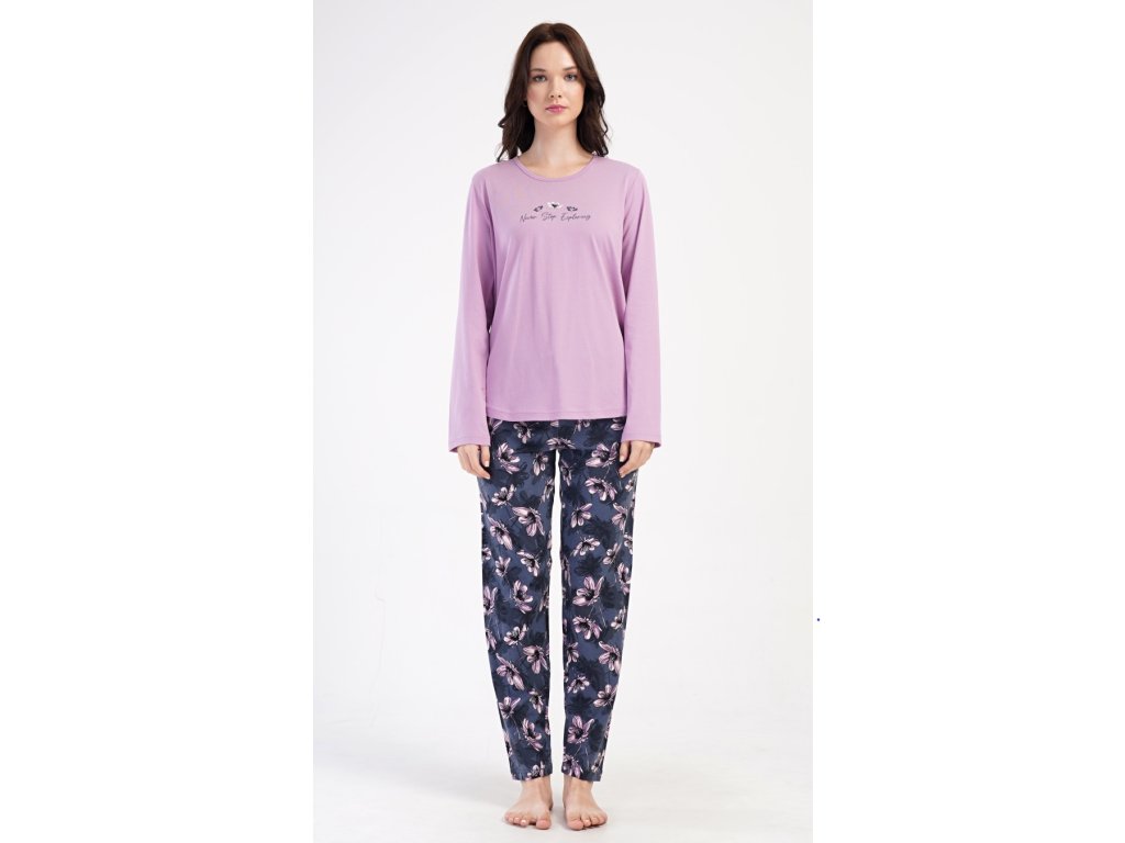 Dámske bavlnené dlhé pyžamo Violetta. Dámske pyžamo sa skladá z trička s dlhým rukávom a dlhých nohavíc. Tričko je jednofarebné, zdobené obrázkom kvetov a drobným nápisom 'Never stop exploring'. Kvetinová potlač sa opakuje aj na nohaviciach, ktoré majú v páse gumu a šnúrku na stiahnutie, nemajú vrecká. Použitý bavlnený materiál je poddajný a príjemný na dotyk.