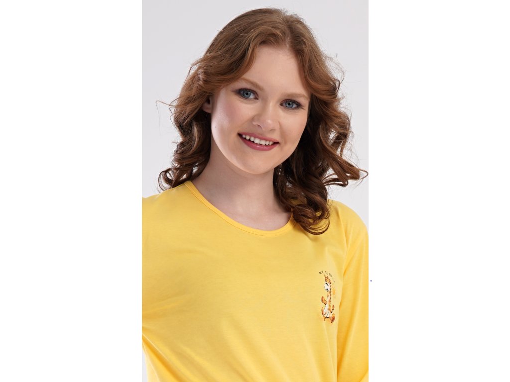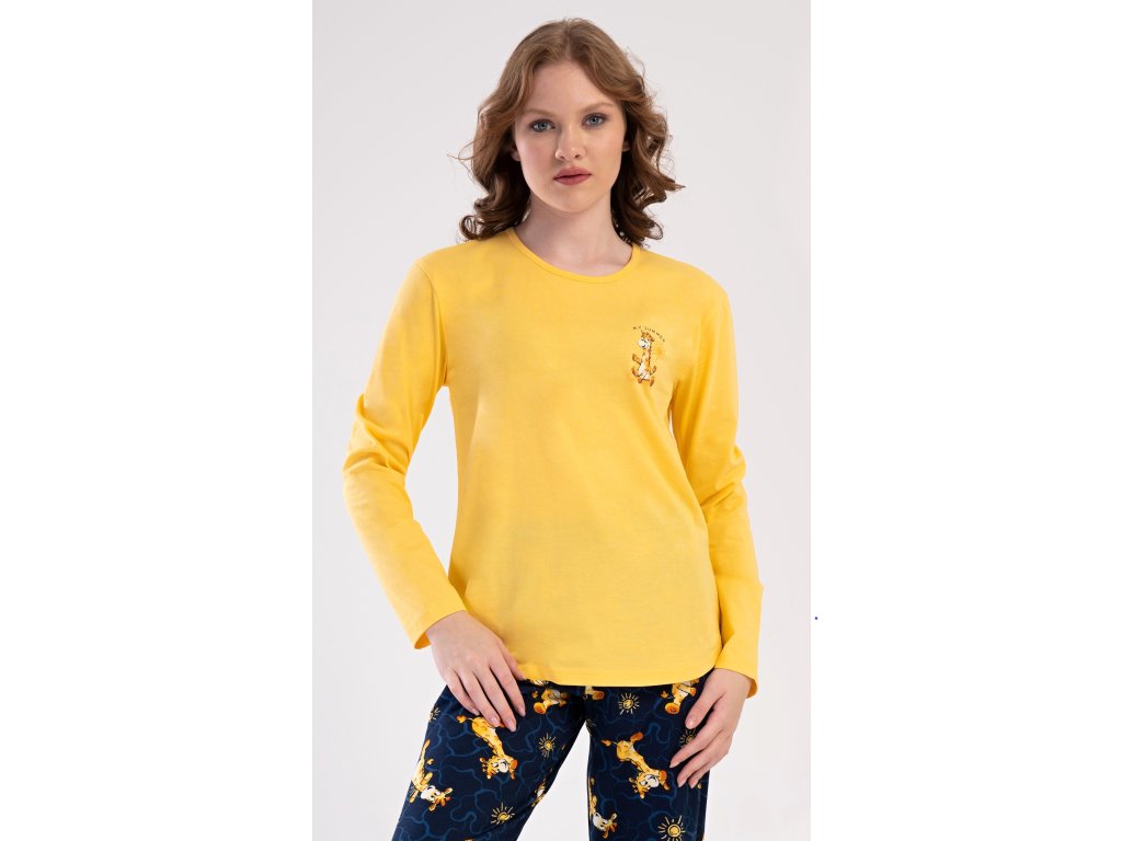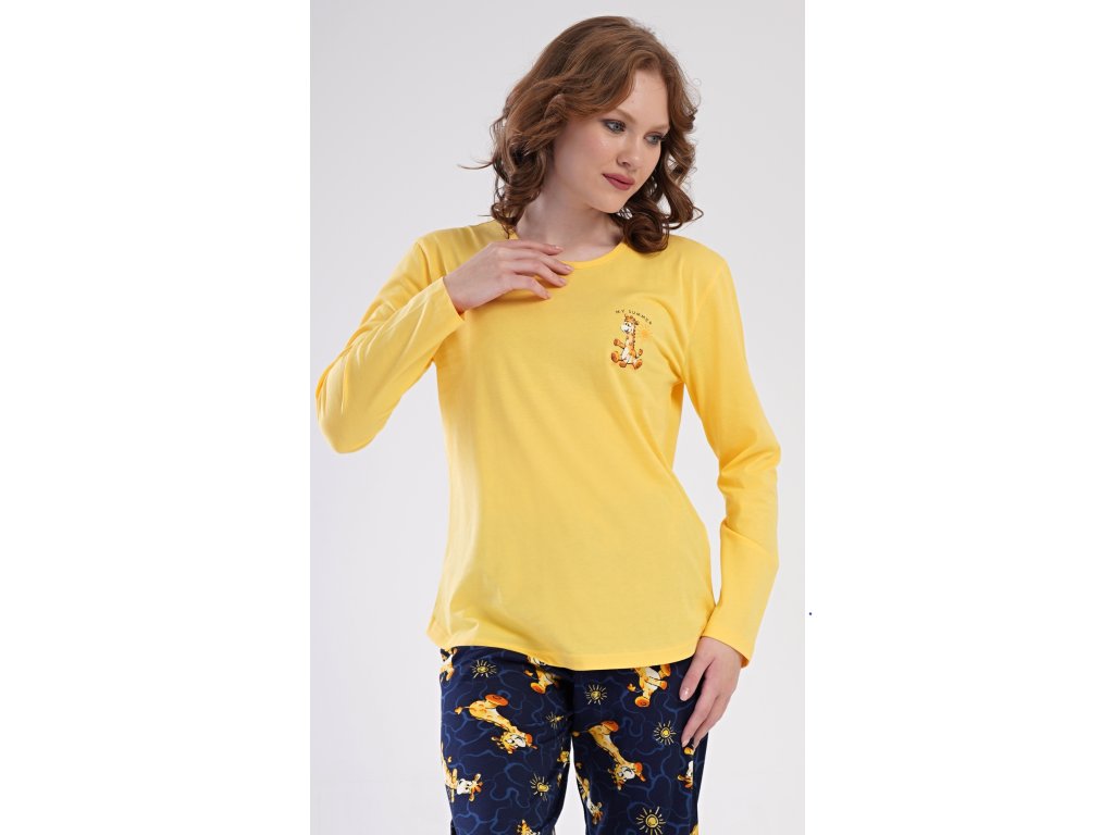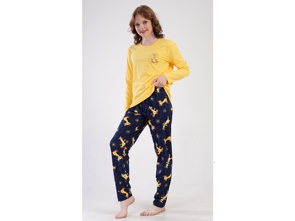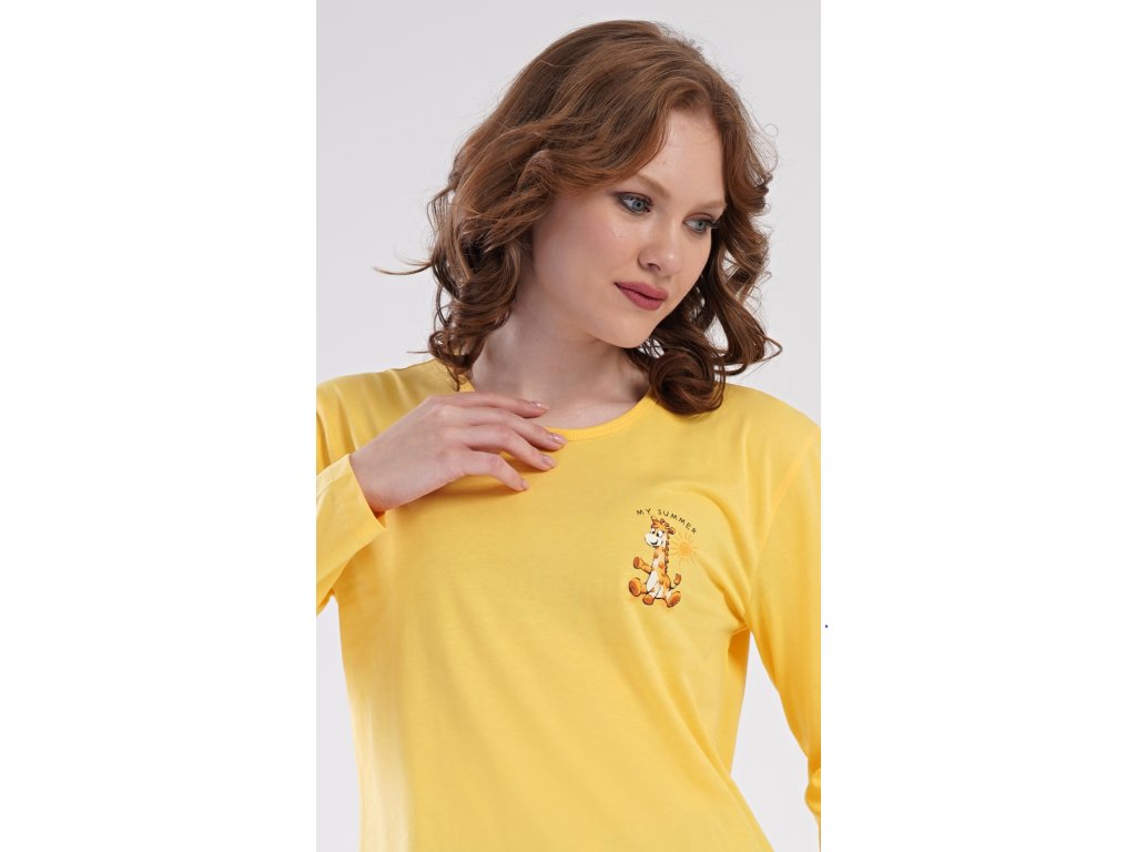 Dámske bavlnené dlhé pyžamo Žirafy. Dámske pyžamo sa skladá z trička s dlhým rukávom a dlhých nohavíc. Tričko je jednofarebné, zdobené obrázkom malej žirafy a nápisom MY SUMMER. Obrázky žiráf sa opakujú aj na nohaviciach, ktoré majú v páse gumu a šnúrku na stiahnutie, nemajú vrecká. Použitý bavlnený materiál je poddajný a príjemný na dotyk.