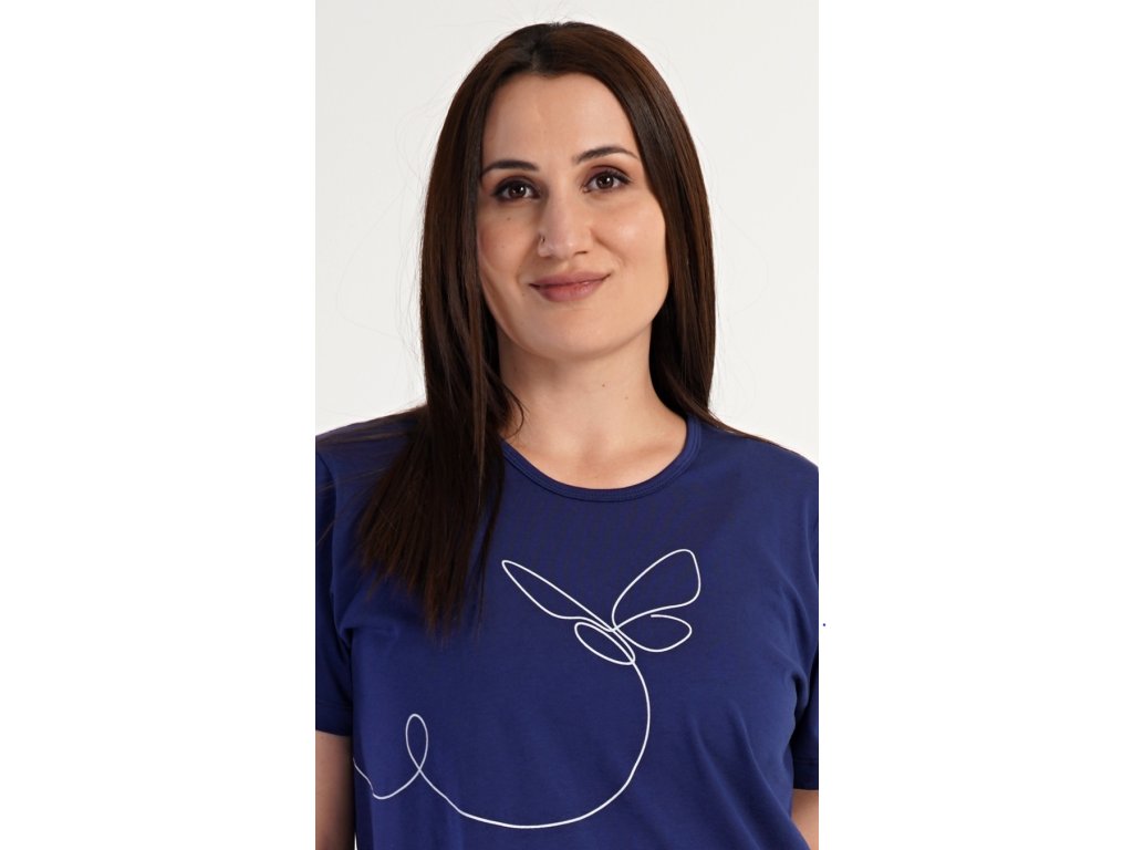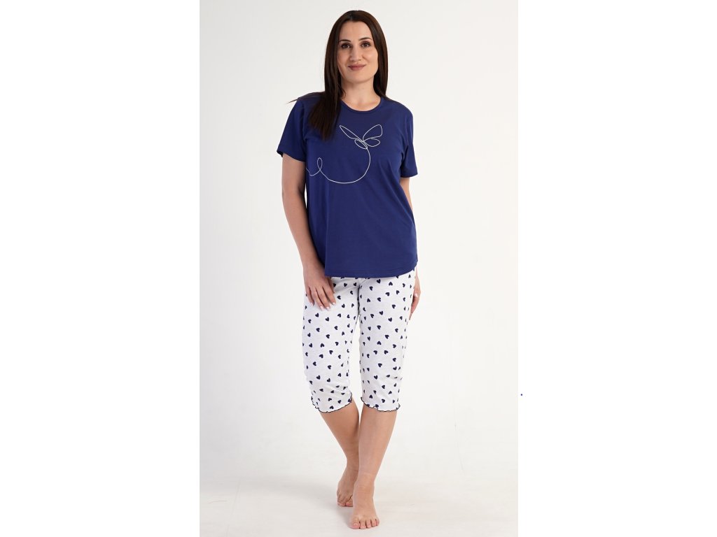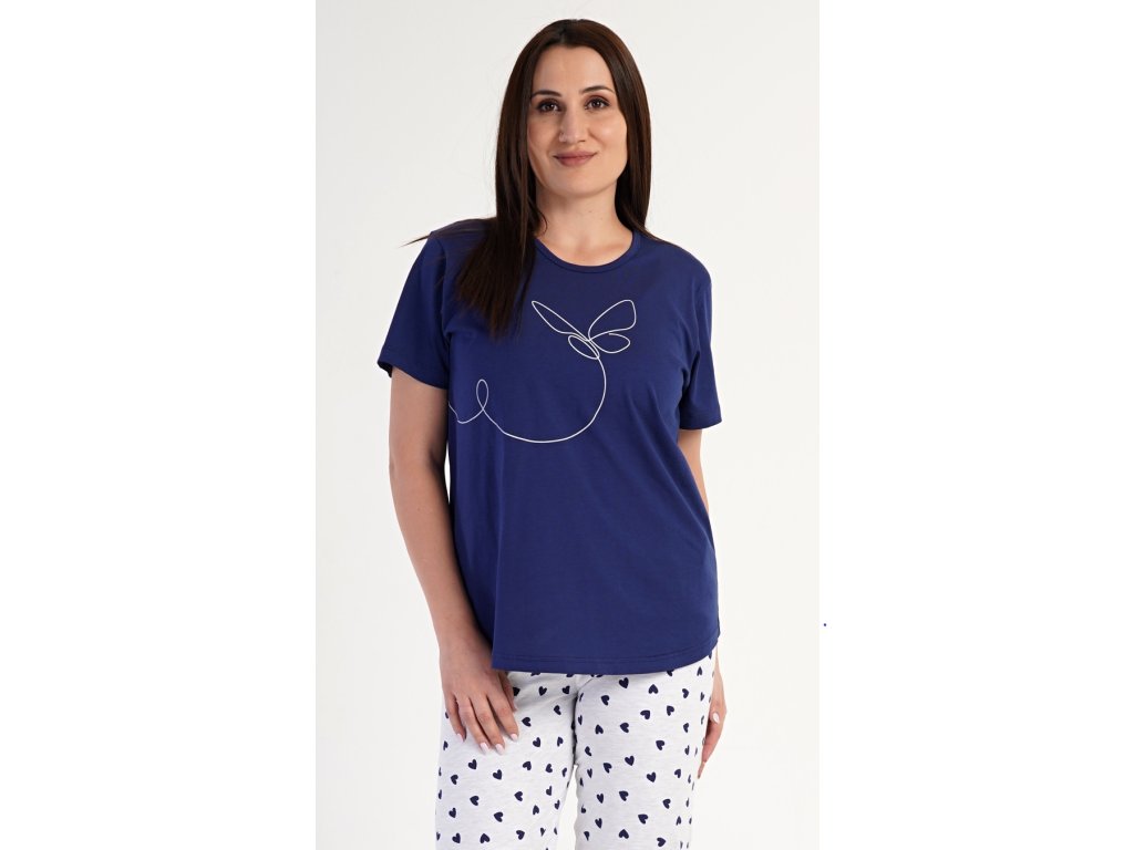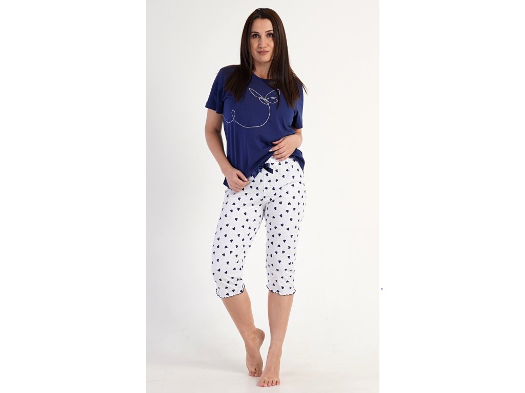 Dámske kapri pyžamo Butterfly. Dámske pyžamo sa skladá z trička s krátkym rukávom a trojštvrťových nohavíc. Jednofarebné tričko s okrúhlym výstrihom má na hrudi kontúru motýľa. Trojštvrťové nohavice s potlačou srdiečok majú v páse gumu na stiahnutie a sú bez vreciek. Použitý materiál je príjemný a poddajný na dotyk. Obsah bavlny nohavíc je 70% a tričká 100%.
