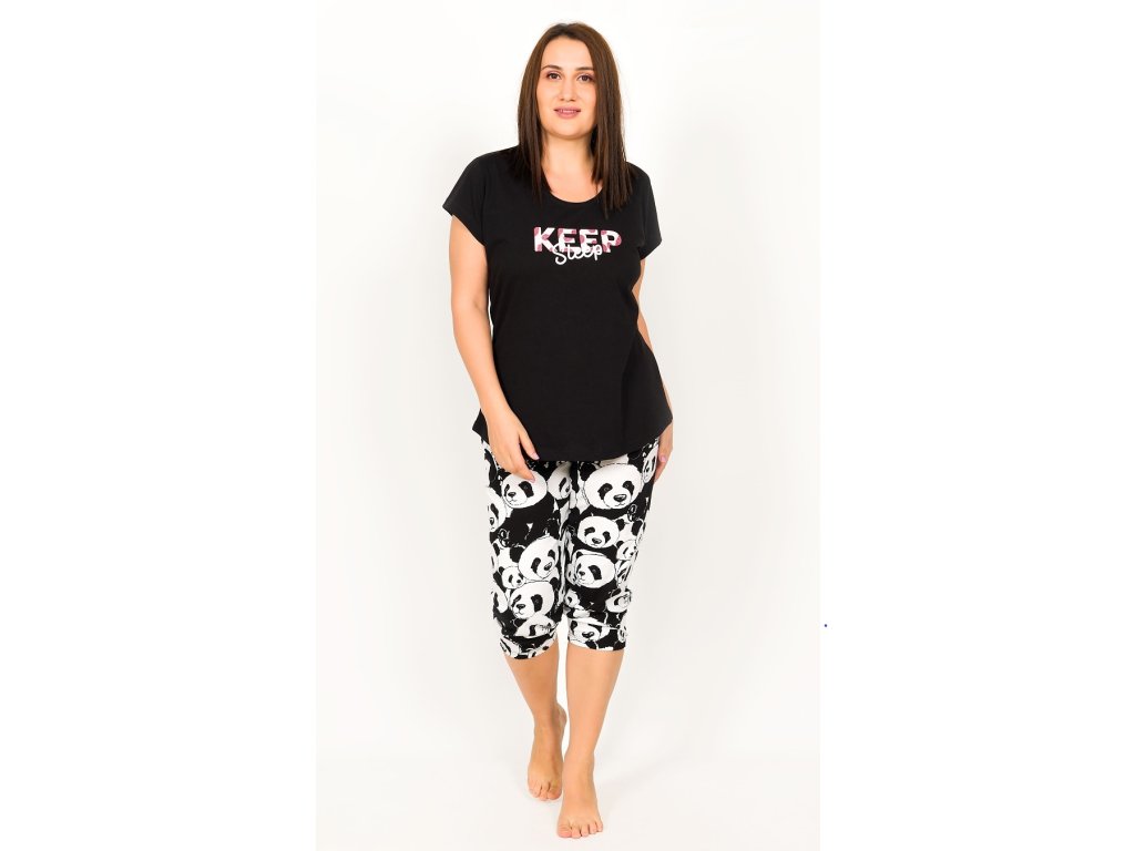 Dámske bavlnené kapri pyžamo Keep sleep. Pyžamo sa skladá z trička s krátkym rukávom a trojštvrťových nohavíc. Na jednofarebnom tričku je výrazný nápis Keep sleep. Tričko dopĺňajú kapri nohavice s výraznou potlačou pandiach hlavičiek, ktoré majú v páse gumu a šnúrku na stiahnutie, nemajú vrecká. Použitý materiál je príjemný a poddajný na dotyk. Obsah bavlny pri tričkách aj nohaviciach je 100%.