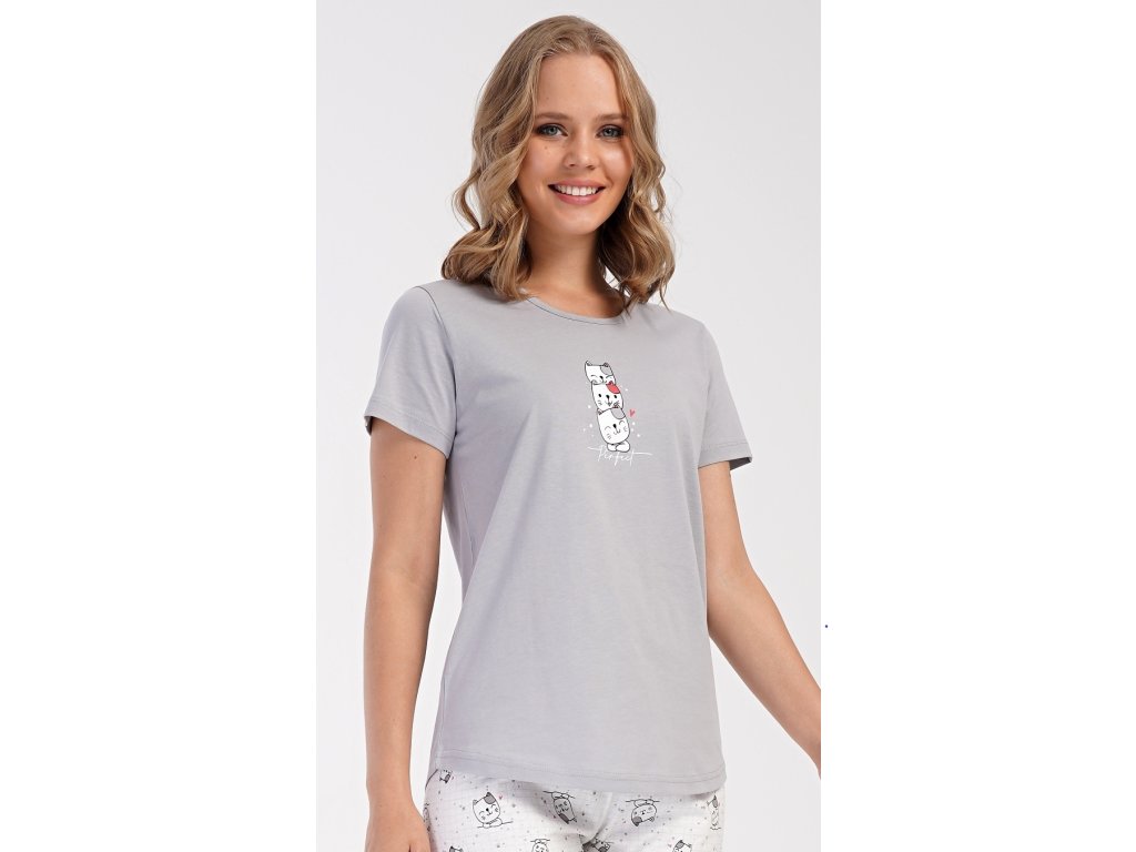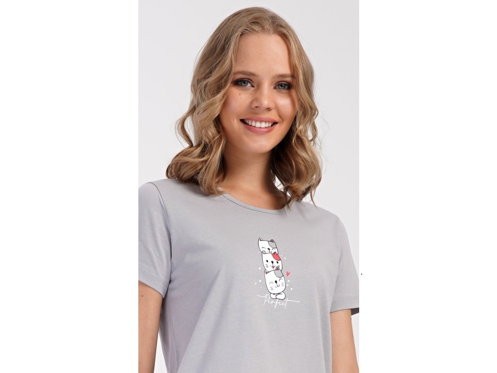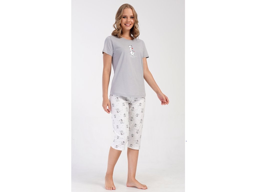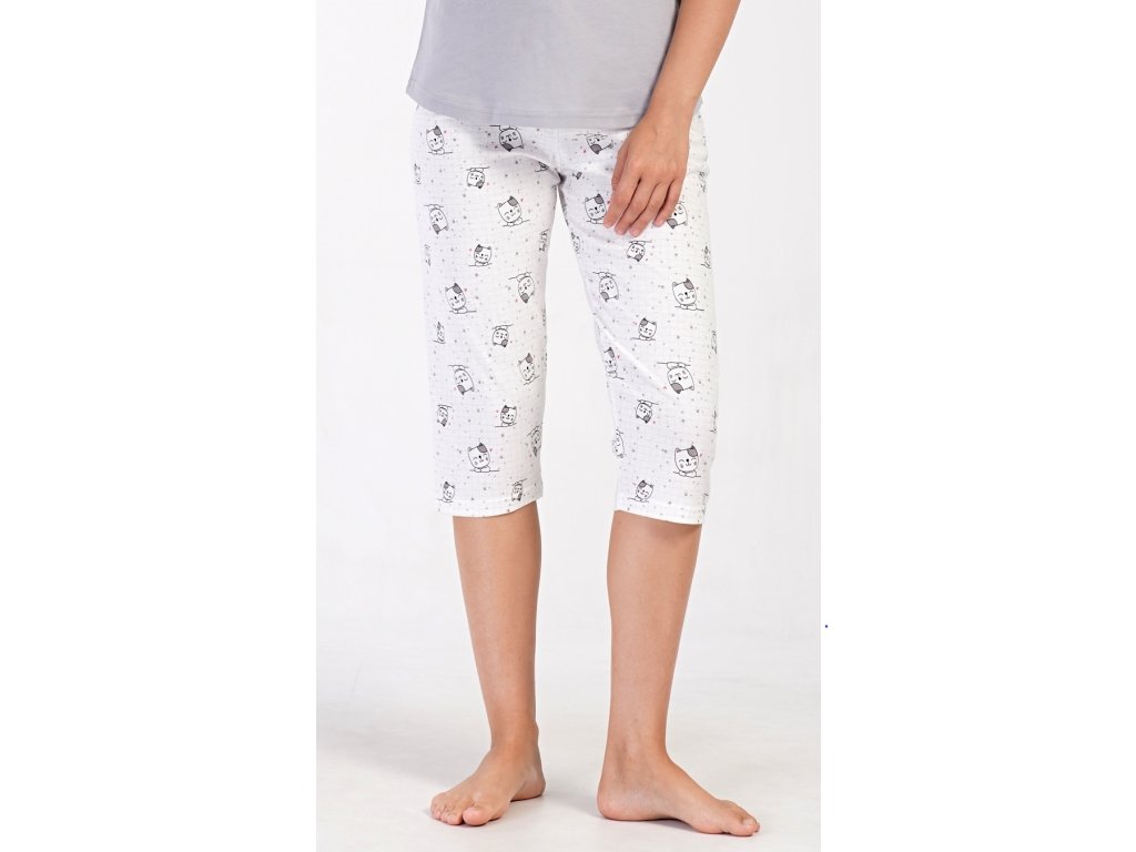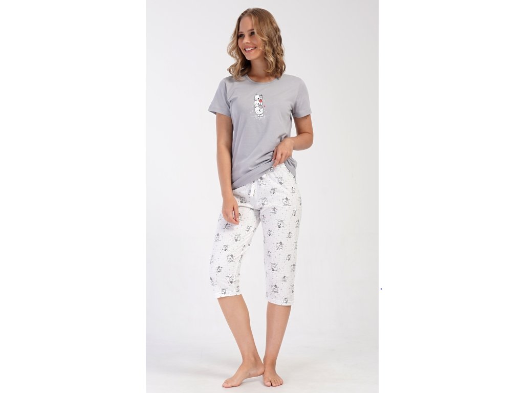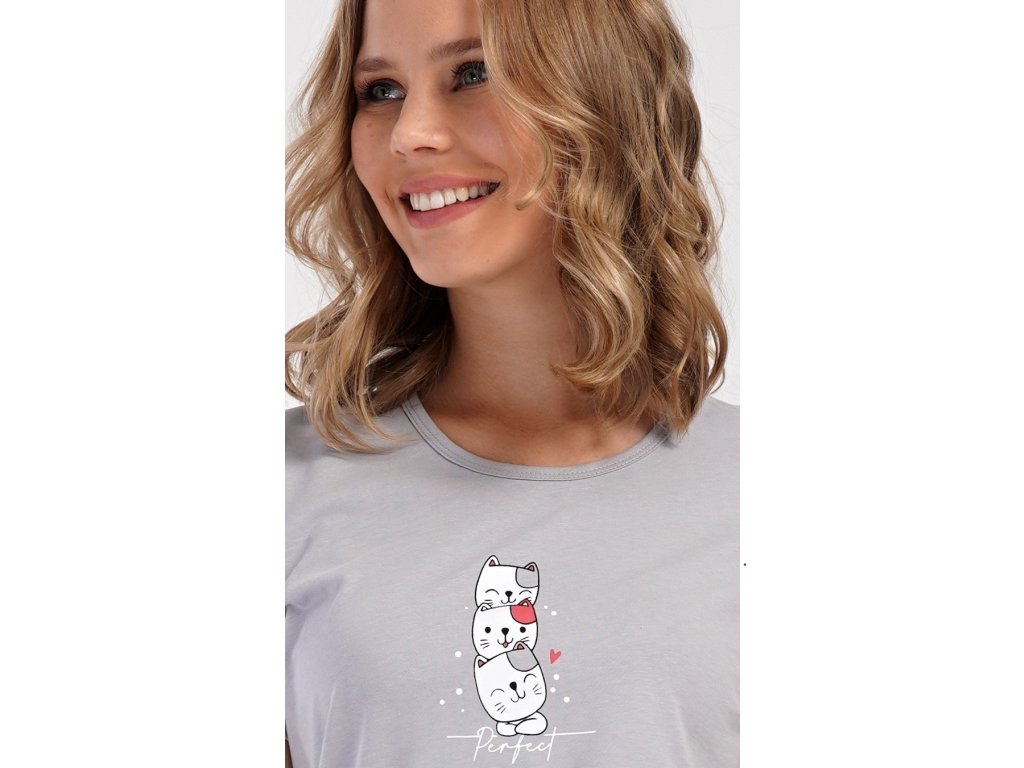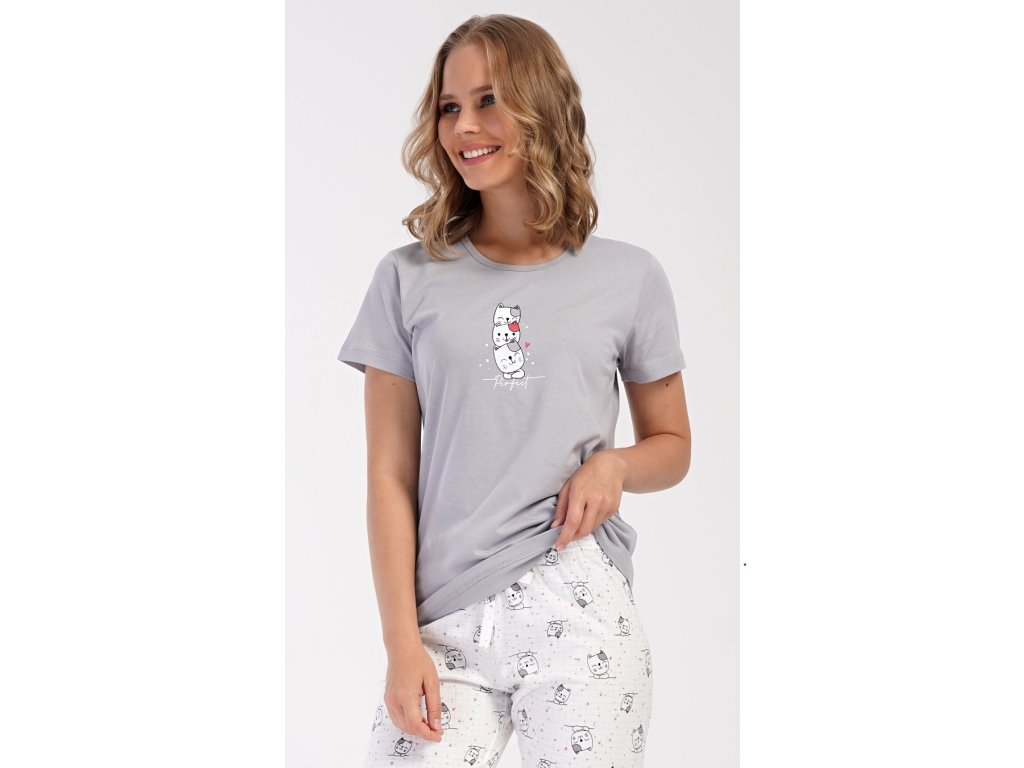 Dámske bavlnené kapri pyžamo Mačiatka. Dámske pyžamo sa skladá z trička s krátkym rukávom a trojštvrťových nohavíc. Tričko s okrúhlym výstrihom má na hrudi obrázok troch mačiatok a nápis 'Perfect'. Mačacie motív sa opakuje aj na nohaviciach, ktoré majú v páse gumu a šnúrku na stiahnutie, sú bez vreciek. Použitý bavlnený materiál je príjemný a poddajný na dotyk.