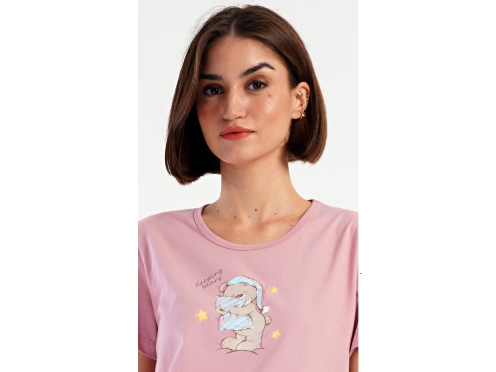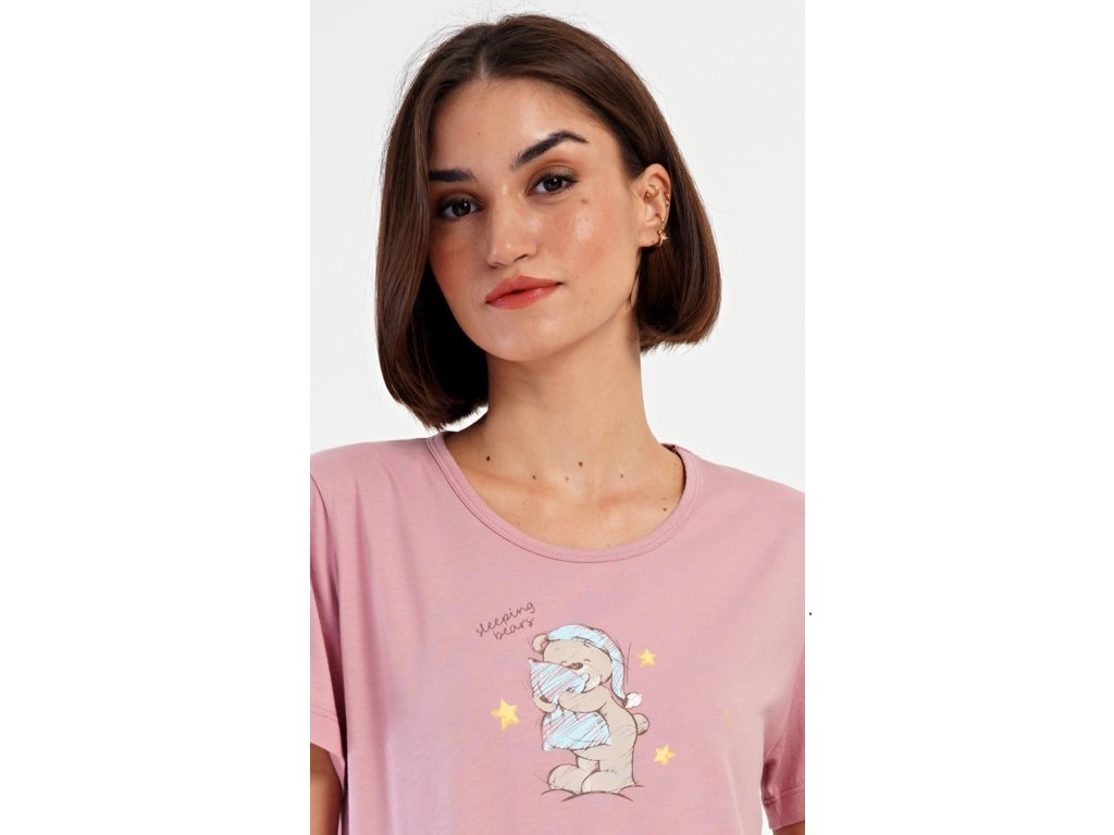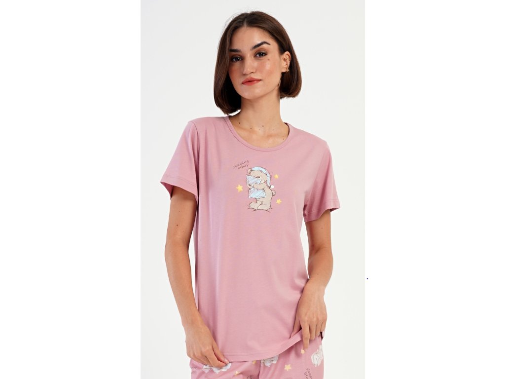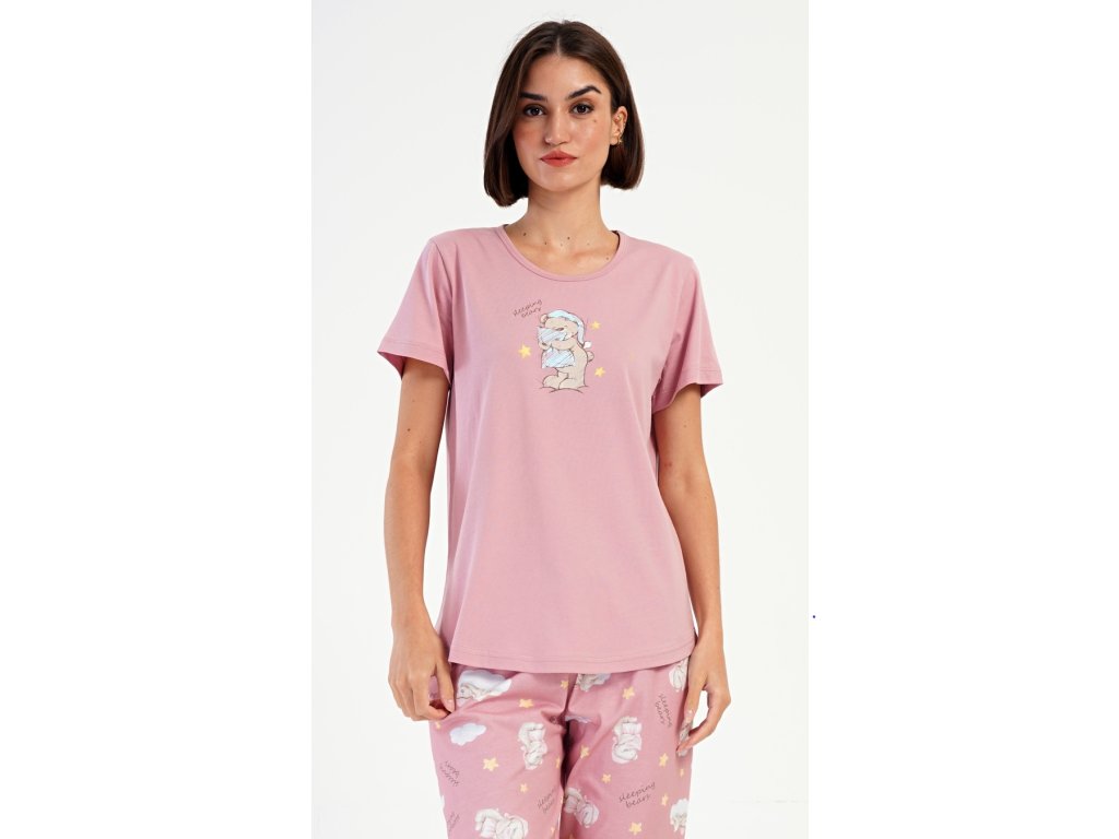 Dámske bavlnené kapri pyžamo Méďa s vankúšom. Dámske pyžamo sa skladá z trička s krátkym rukávom a trojštvrťových nohavíc. Tričko s okrúhlym výstrihom má na hrudi obrázok medvedíka s vankúšom a čiapočkou. Tento motív sa opakuje aj na nohaviciach, ktoré majú v páse gumu a šnúrku na stiahnutie, sú bez vreciek. Použitý bavlnený materiál je príjemný a poddajný na dotyk.