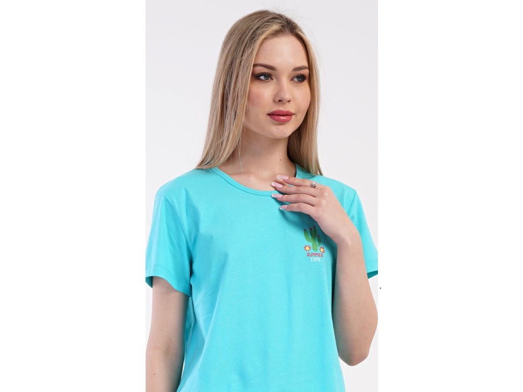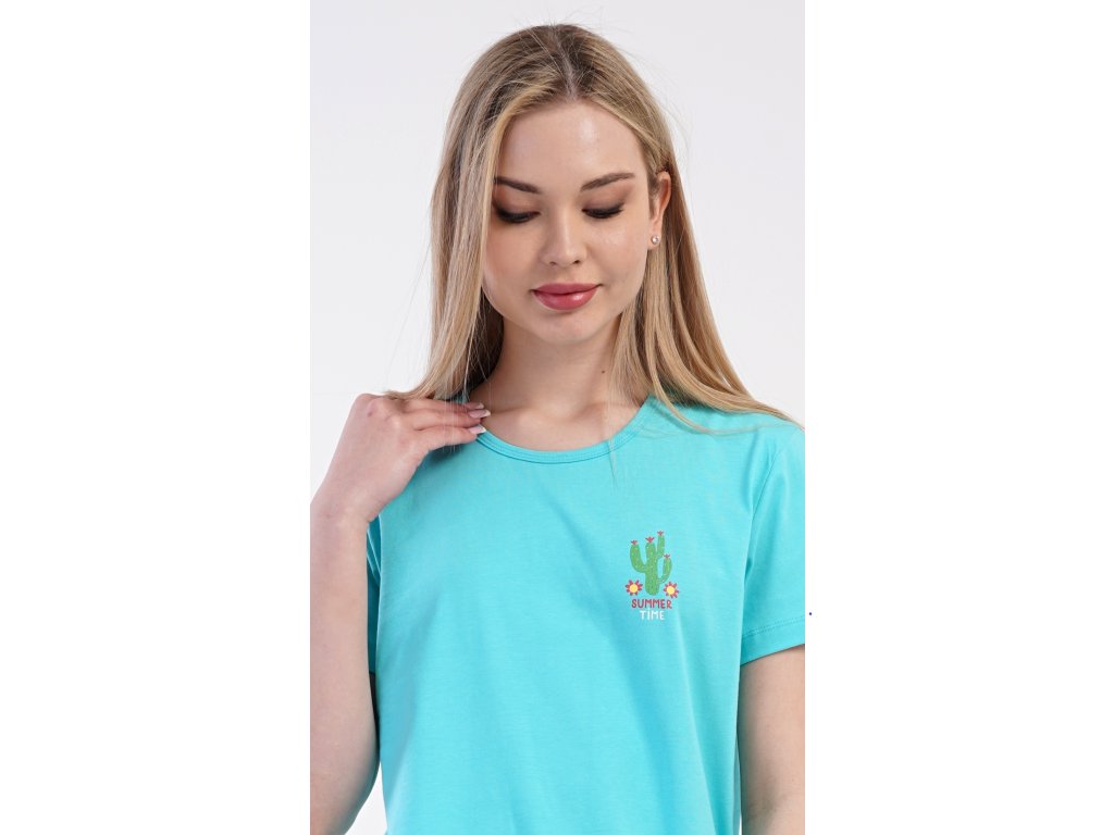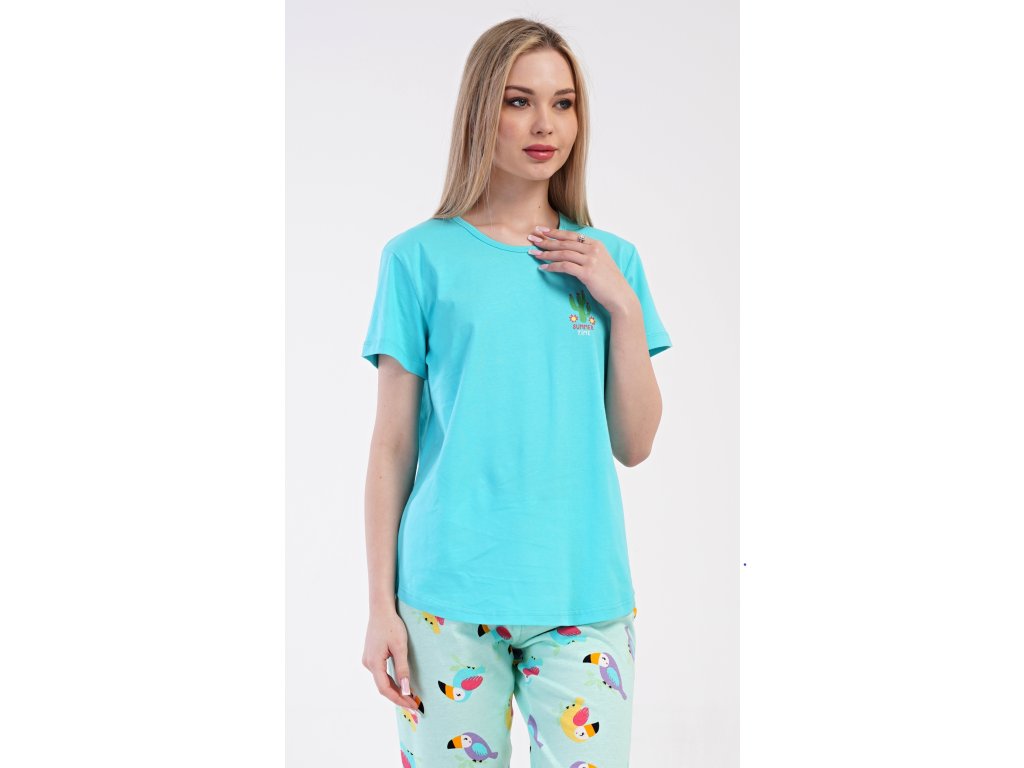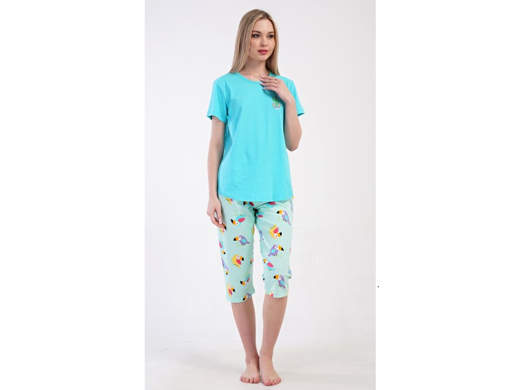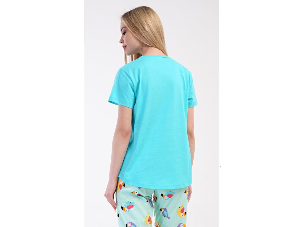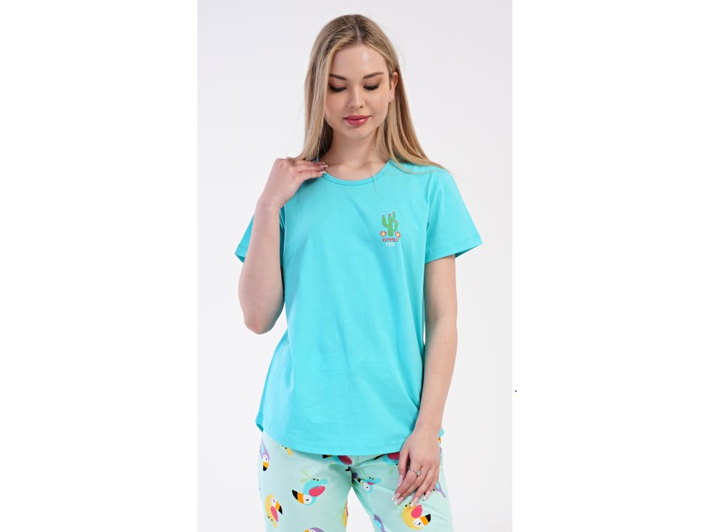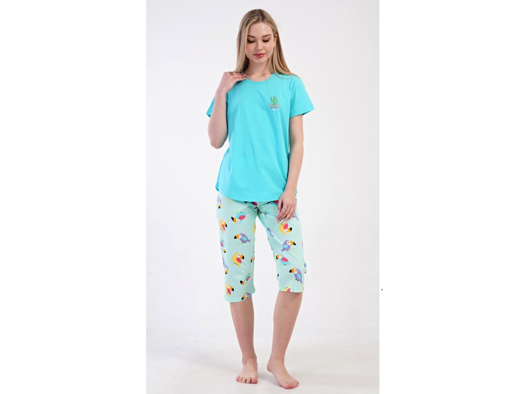 Dámske bavlnené kapri pyžamo Papagáj. Dámske pyžamo sa skladá z trička s krátkym rukávom a trojštvrťových nohavíc. Tričko s okrúhlym výstrihom zdobí na hrudi drobný obrázok kaktusu. Nohavice s potlačou papagájov majú v páse gumu a šnúrku na stiahnutie, sú bez vreciek. Použitý bavlnený materiál je príjemný a poddajný na dotyk.