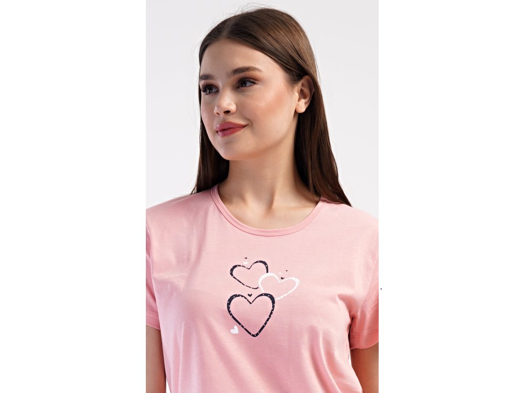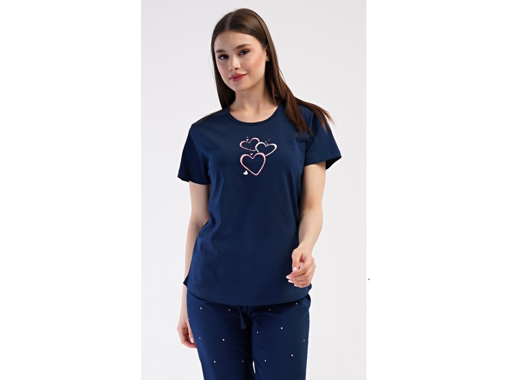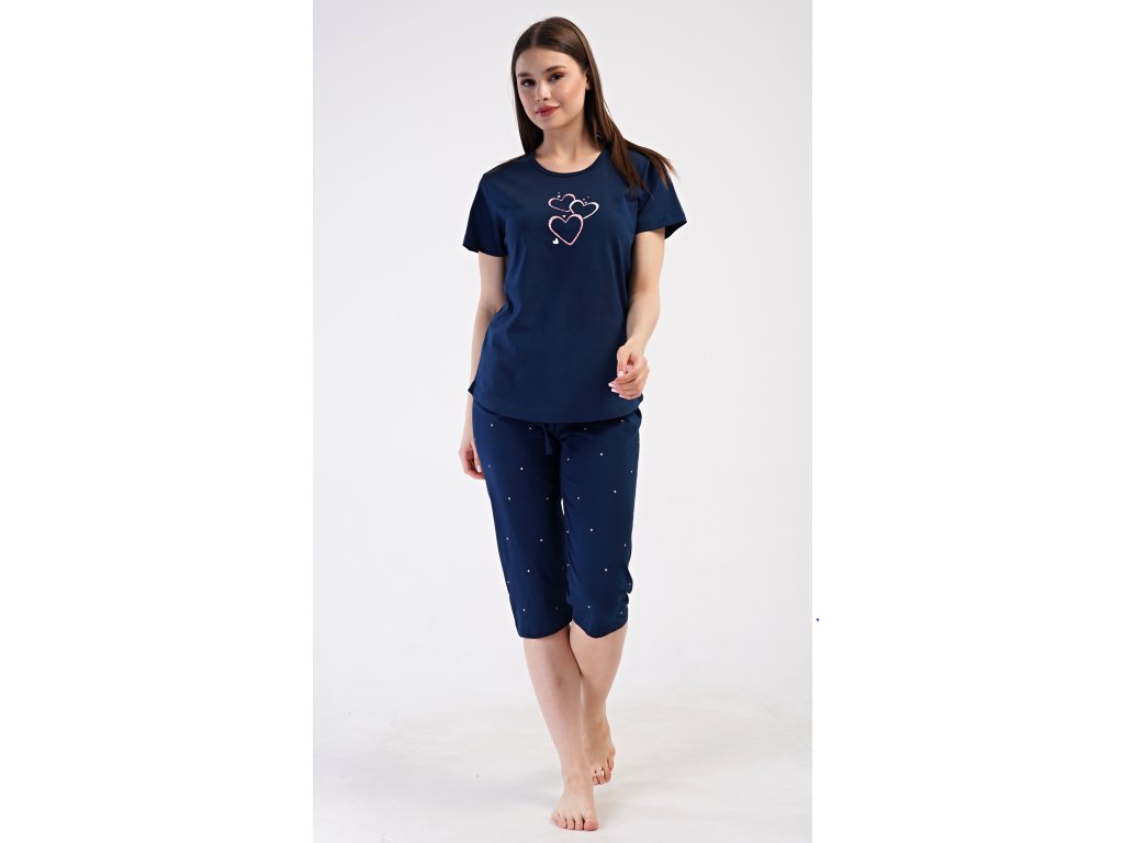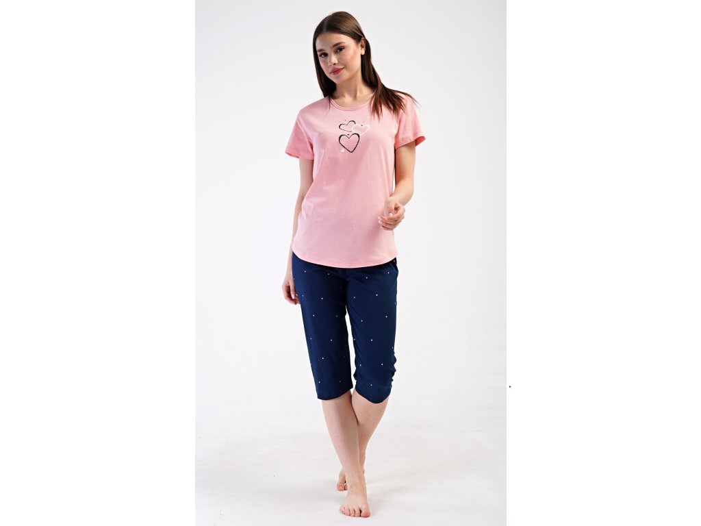 Dámske bavlnené kapri pyžamo Srdce. Dámske pyžamo sa skladá z trička s krátkym rukávom a trojštvrťových nohavíc. Tričko s okrúhlym výstrihom zdobí na hrudi obrázok srdiečok. Nohavice potlačené drobnými bodkami majú v páse gumu a šnúrku na stiahnutie, sú bez vreciek. Použitý bavlnený materiál je príjemný a poddajný na dotyk.