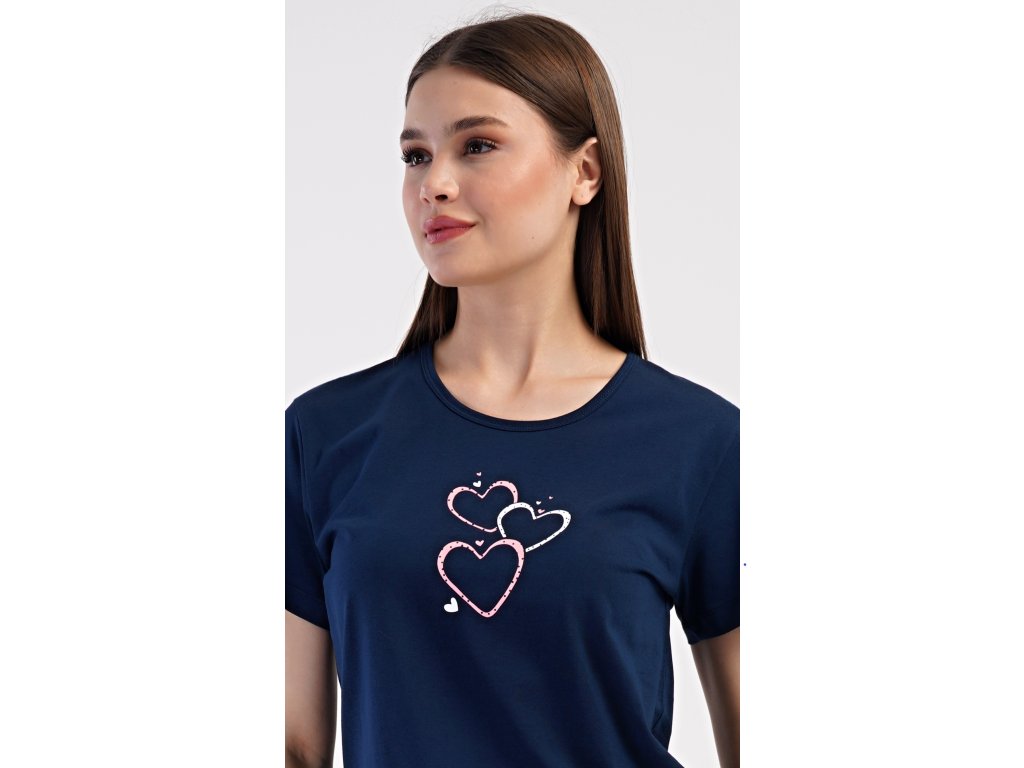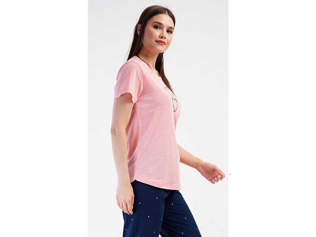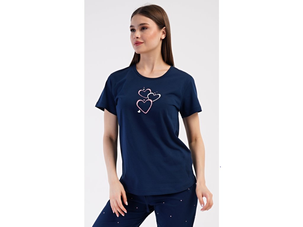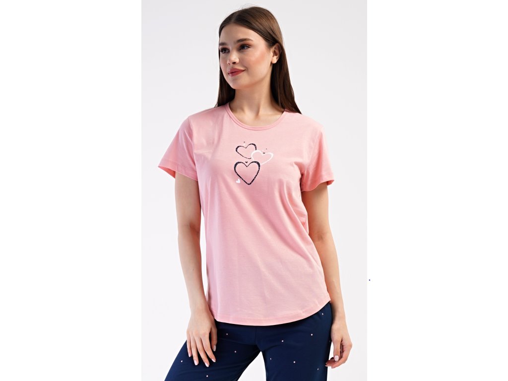 Dámske bavlnené kapri pyžamo Srdce. Dámske pyžamo sa skladá z trička s krátkym rukávom a trojštvrťových nohavíc. Tričko s okrúhlym výstrihom zdobí na hrudi obrázok srdiečok. Nohavice potlačené drobnými bodkami majú v páse gumu a šnúrku na stiahnutie, sú bez vreciek. Použitý bavlnený materiál je príjemný a poddajný na dotyk.