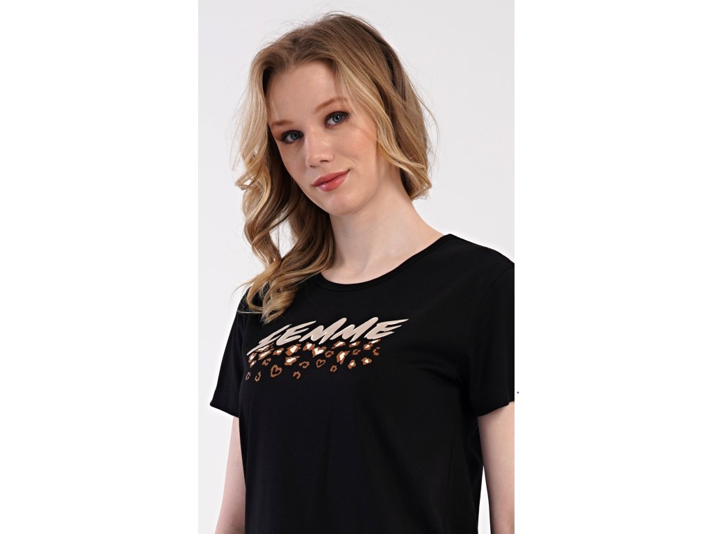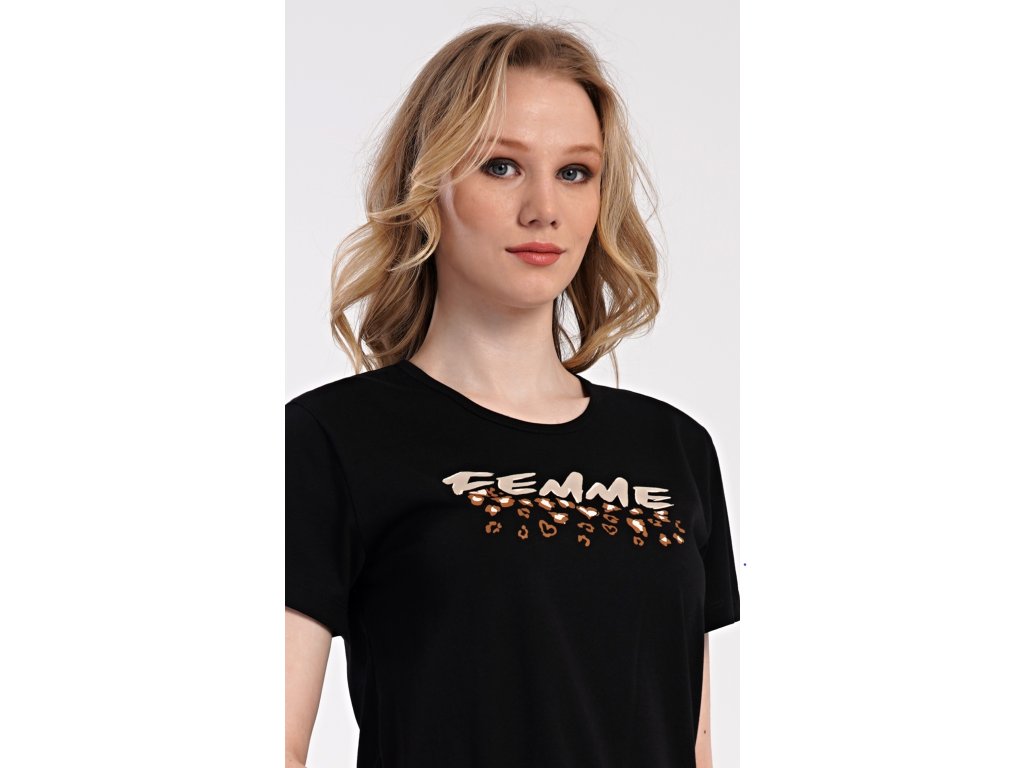 Dámske bavlnené šortkové pyžamo Femme. Dámske pyžamo sa skladá z trička s krátkym rukávom a šortkových nohavíc. Jednofarebné tričko zdobí nápis FEMME a leopardí vzor. Tento motív sa opakuje aj na šortkách, ktoré majú v páse gumu a šnúrku na stiahnutie, sú bez vreciek. Použitý bavlnený materiál je príjemný a poddajný na dotyk.