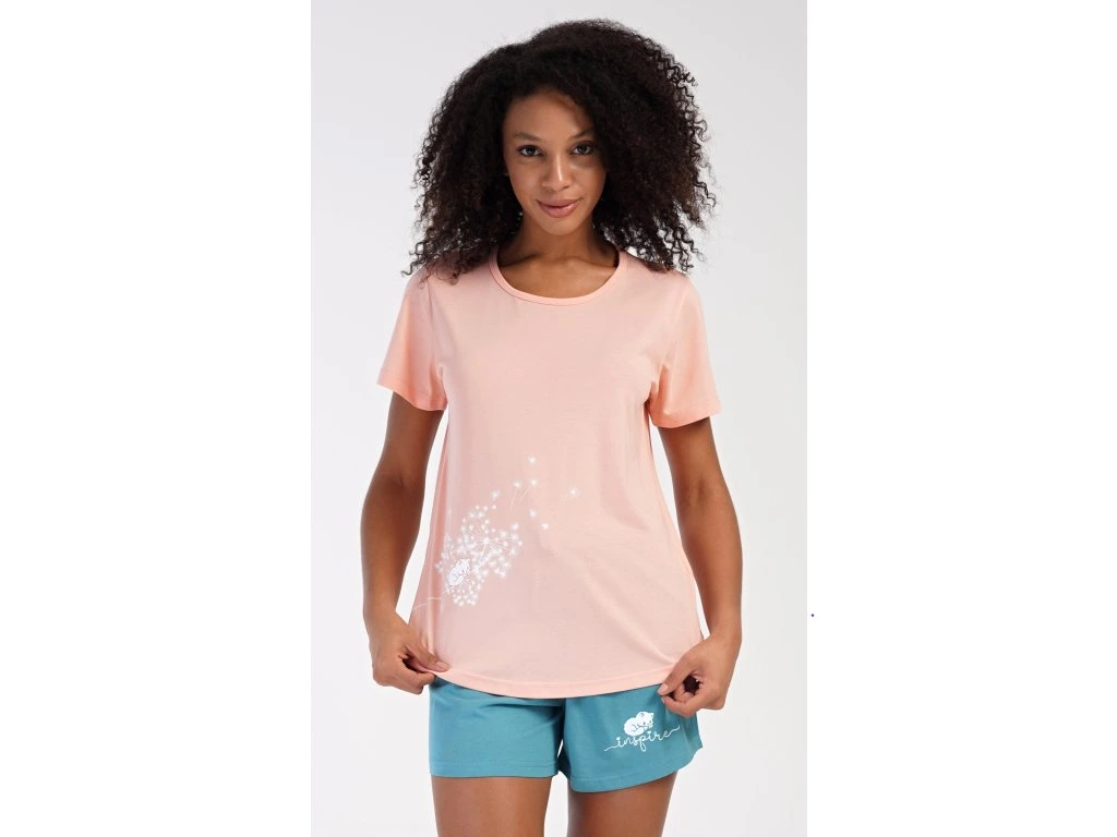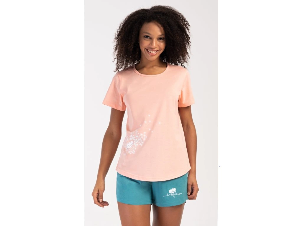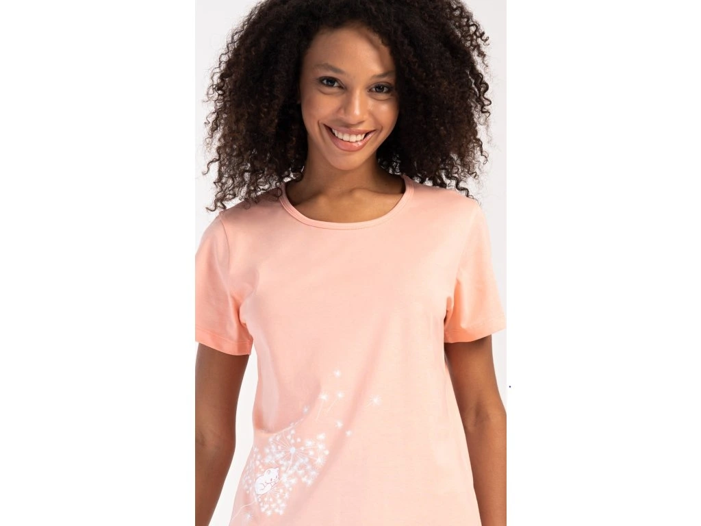 Dámske bavlnené šortkové pyžamo Mačiatko. Dámske pyžamo sa skladá z trička s krátkym rukávom a šortkových nohavíc. Jednofarebné tričko zdobí obrázok mačiatka a rozfúkaná púpava. Motív mačiatka sa opakuje aj na šortkách, ktoré majú v páse gumu a šnúrku na stiahnutie, sú bez vreciek. Použitý bavlnený materiál je príjemný a poddajný na dotyk.