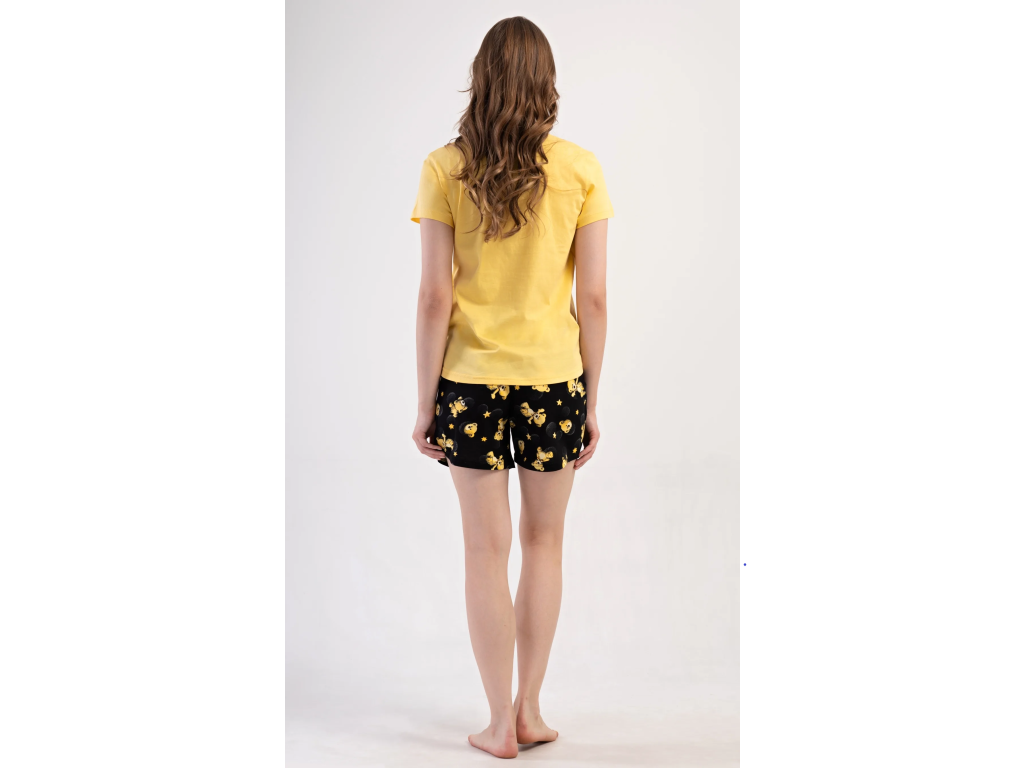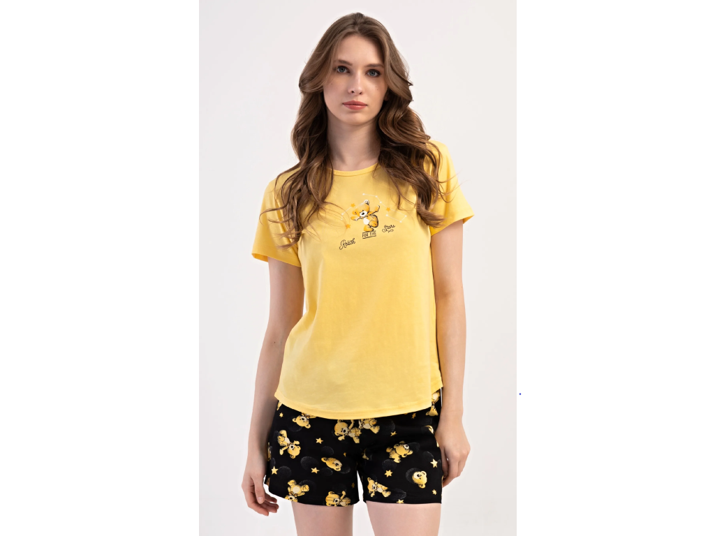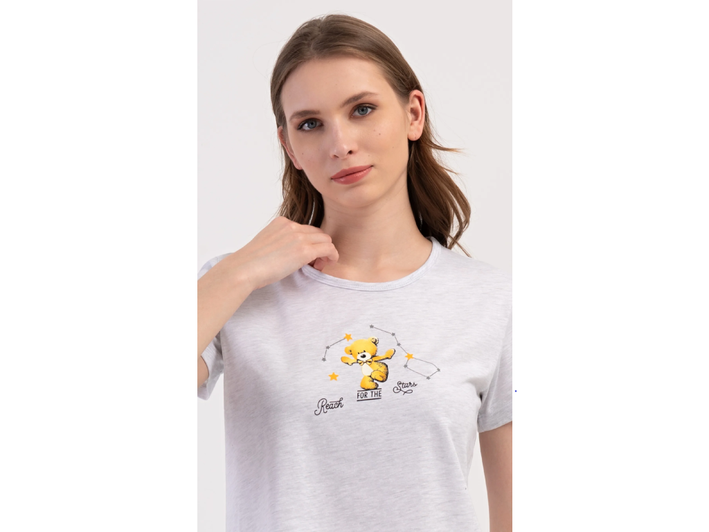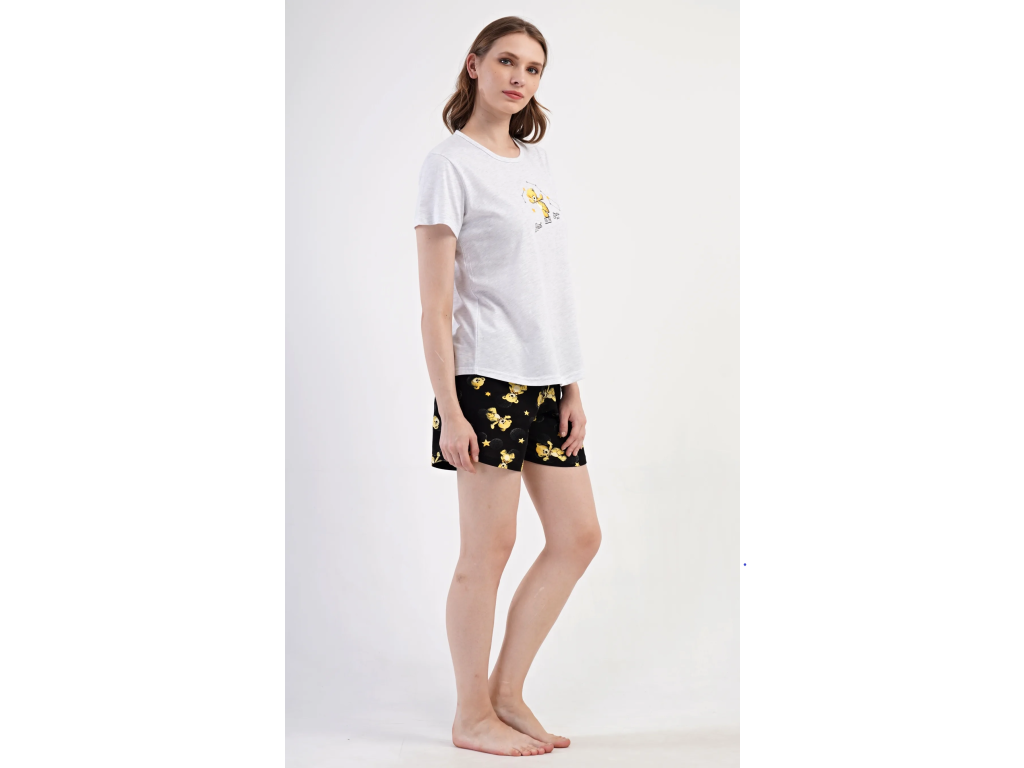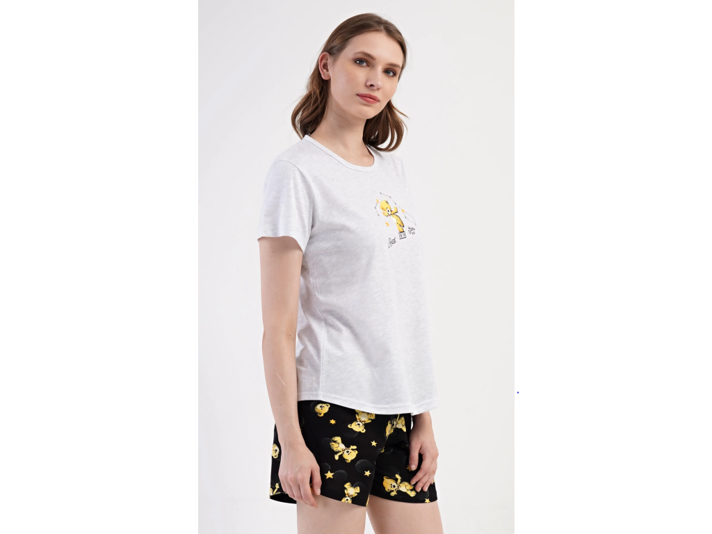 Dámske bavlnené šortkové pyžamo Macko. Dámske pyžamo sa skladá z trička s krátkym rukávom a šortkových nohavíc. Jednofarebné tričko zdobí obrázok roztomilého medvedíka. Tento motív sa opakuje aj na šortkách, ktoré majú v páse gumu a šnúrku na stiahnutie, sú bez vreciek. Použitý bavlnený materiál je príjemný a poddajný na dotyk.